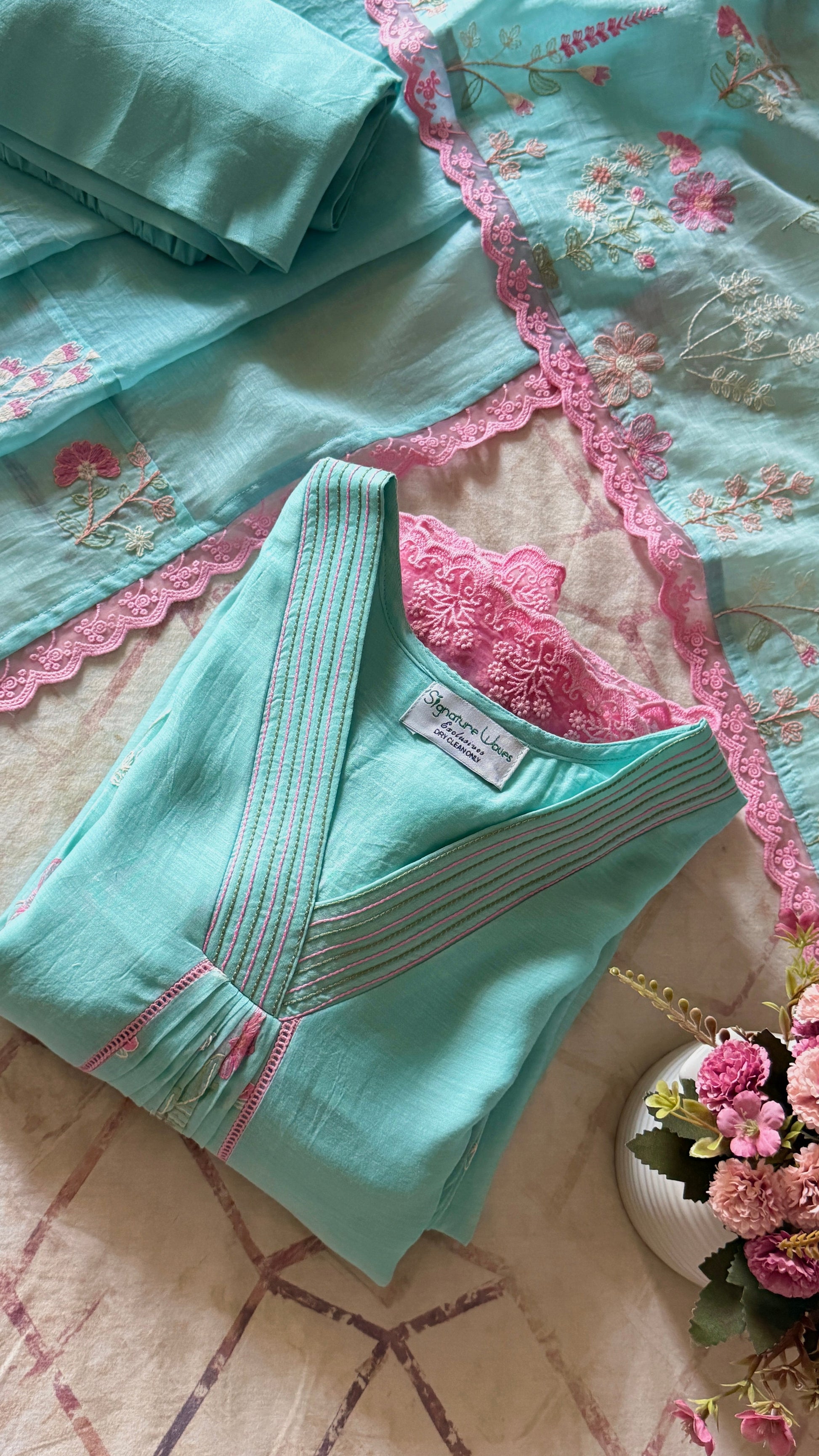 Designed in gentle panel cuts, the kurta has a lovely flow and fall when worn. The highlight is the floral embroidery spread across the panels and sleeves in shades of pink, blush and soft pastels, giving a beautiful contrast against the blue base. The neckline detailing and vertical panel structure add a neat, flattering shape, while the embroidery keeps the whole look feminine and graceful.