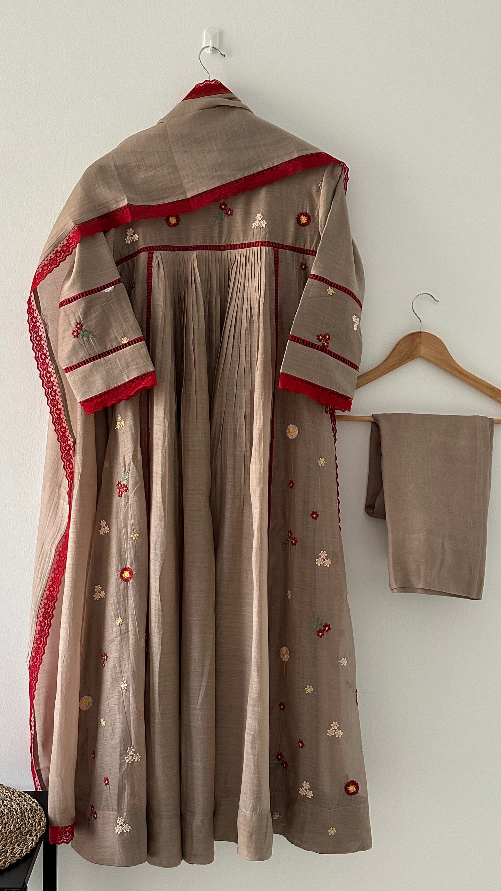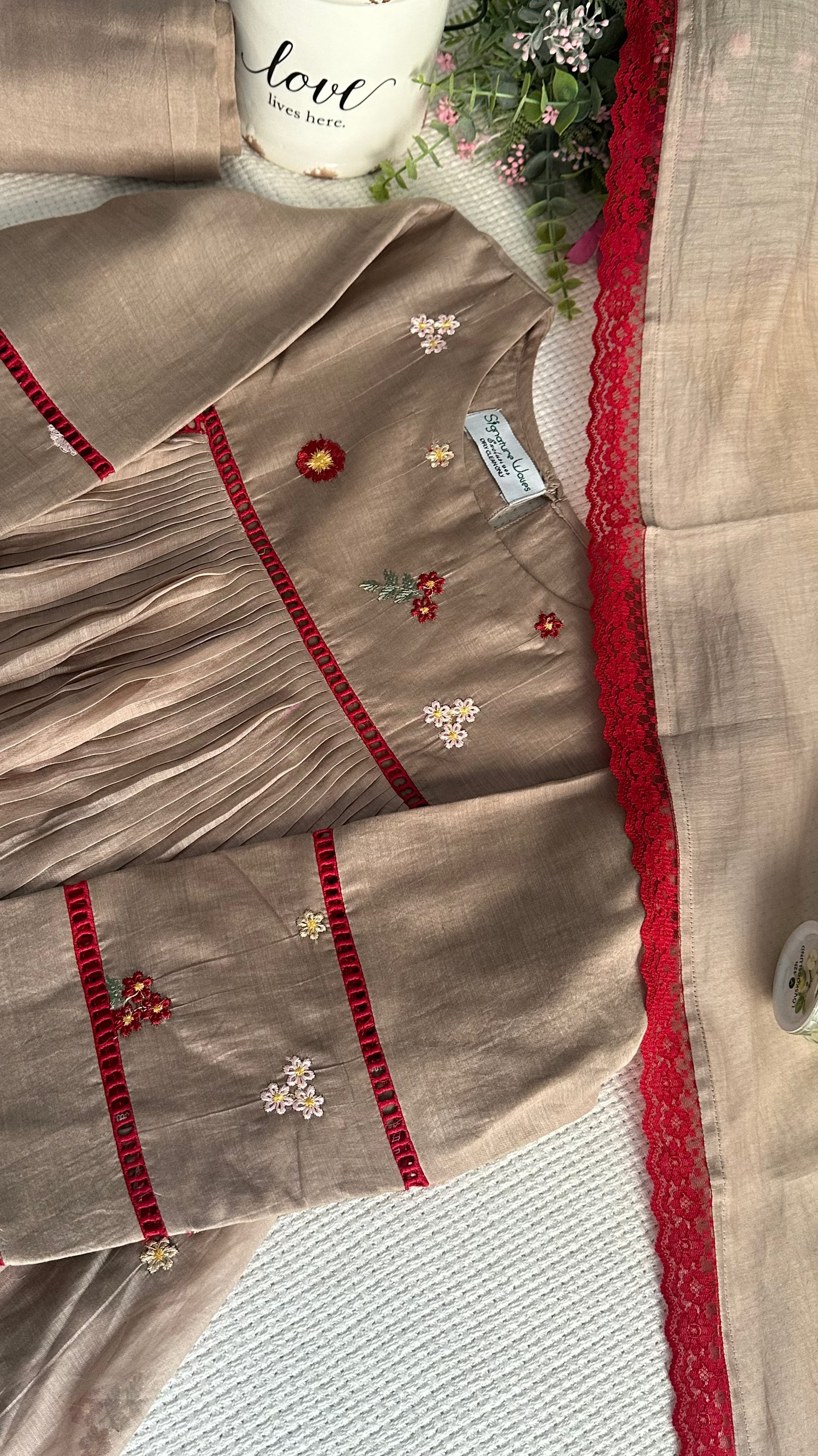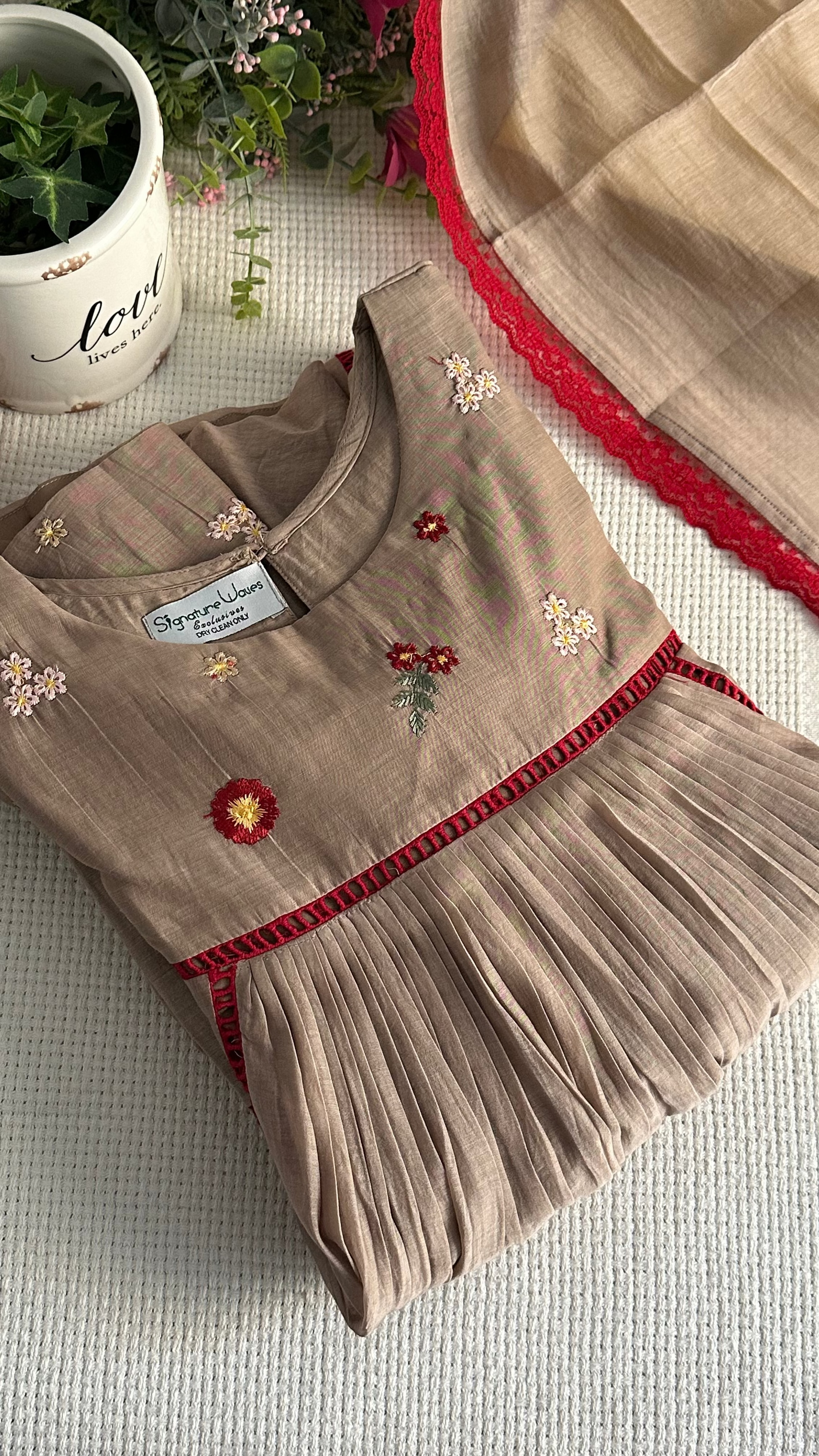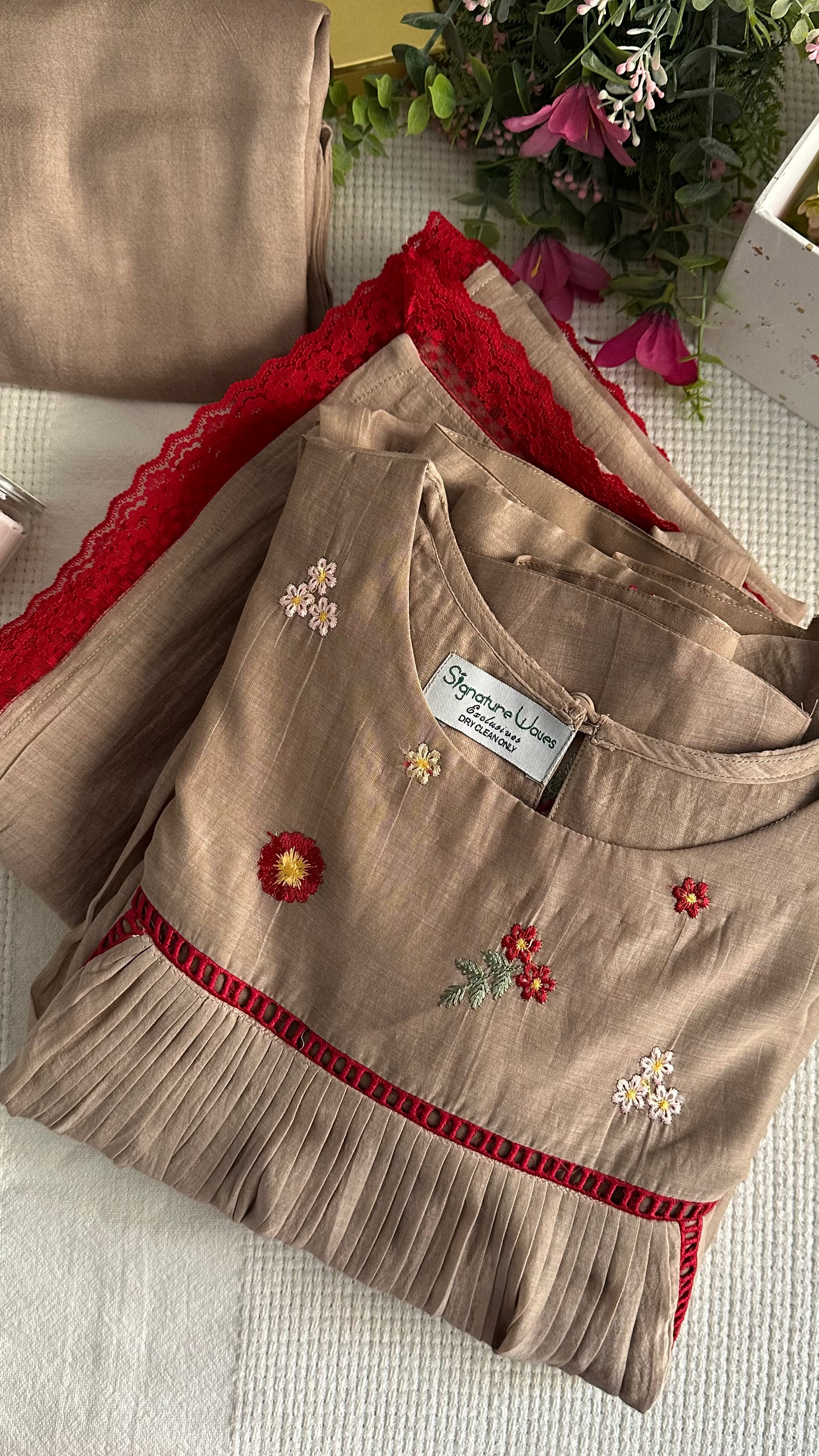 This earthy beige outfit with red highlights and delicate floral embroidery looks so elegant and soothing. The pleated yoke, lace detailing, and contrast red threadwork give it such a charming handcrafted feel.