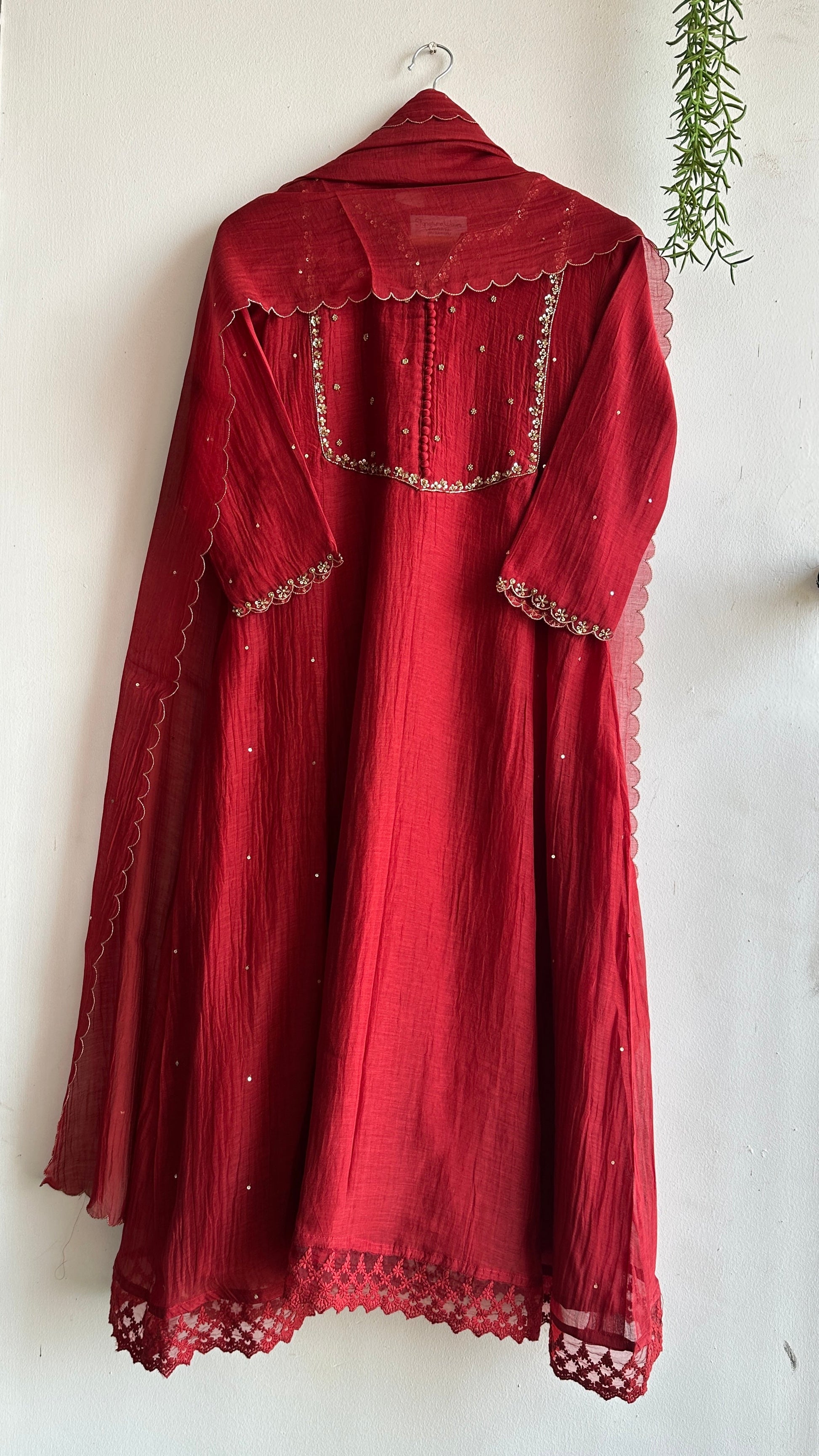 A name inspired by the exquisite handwork it carries. This outfit reflects the elegance of the crimson Red shade and the charm of intricate handwork.