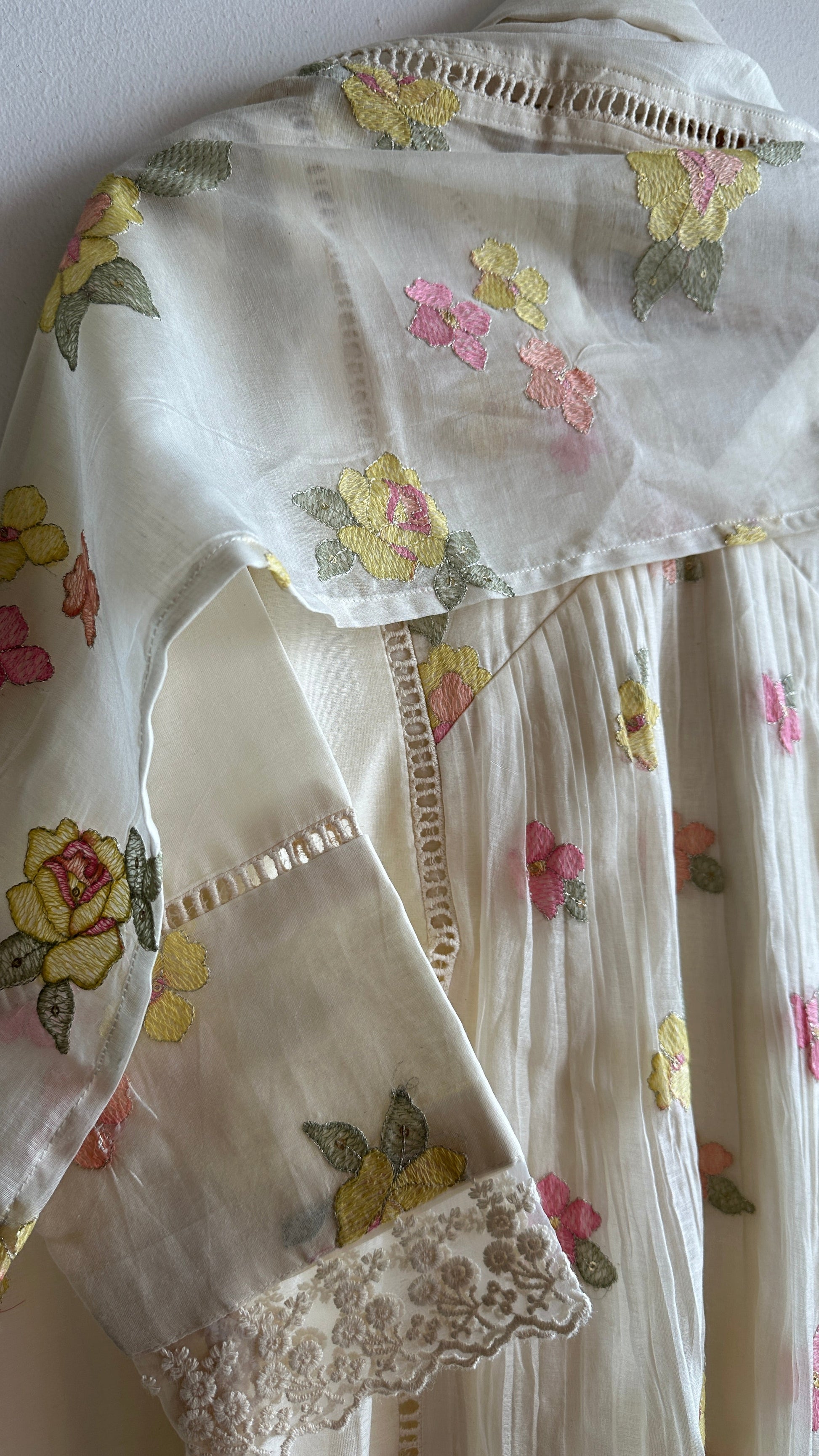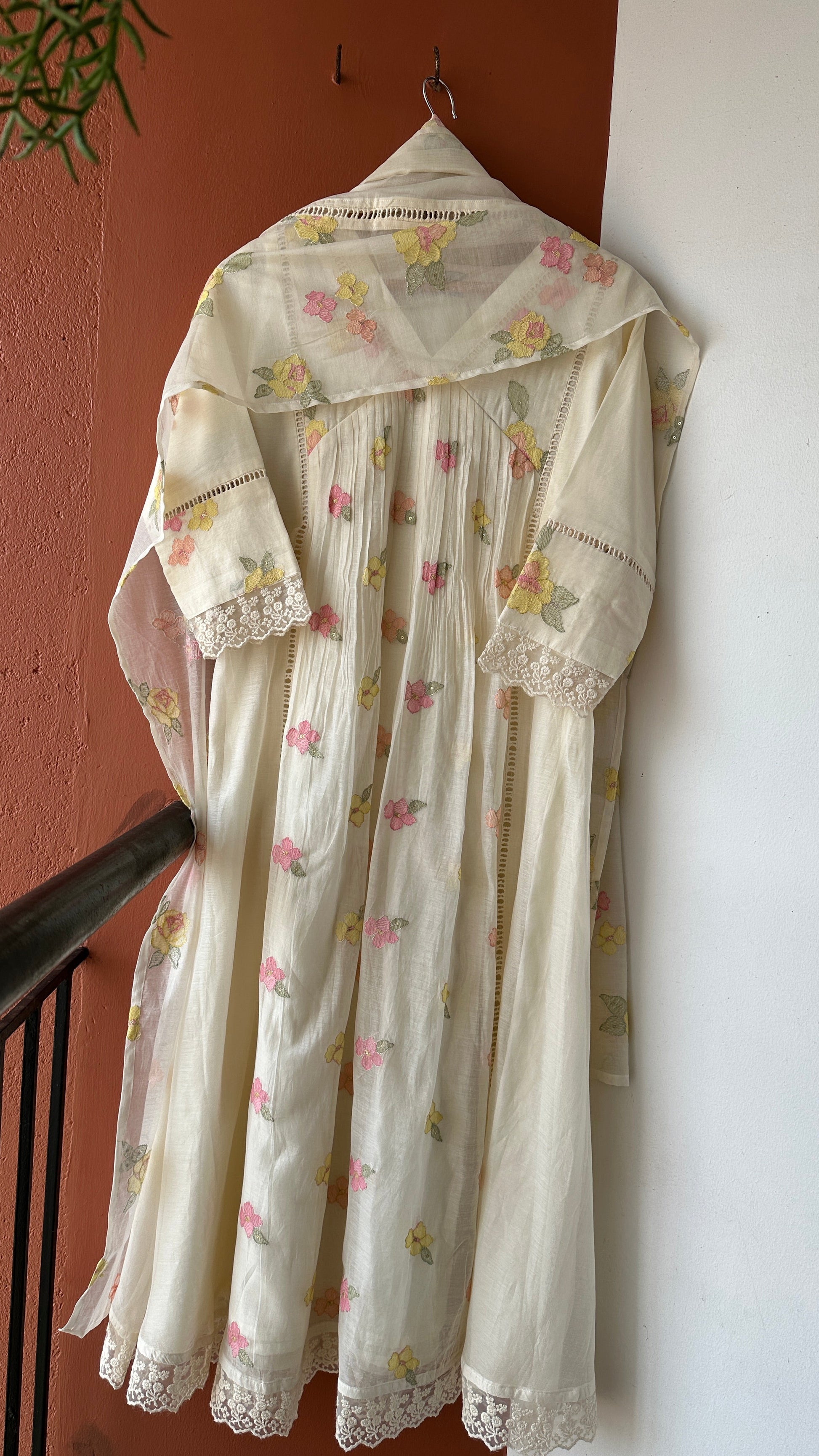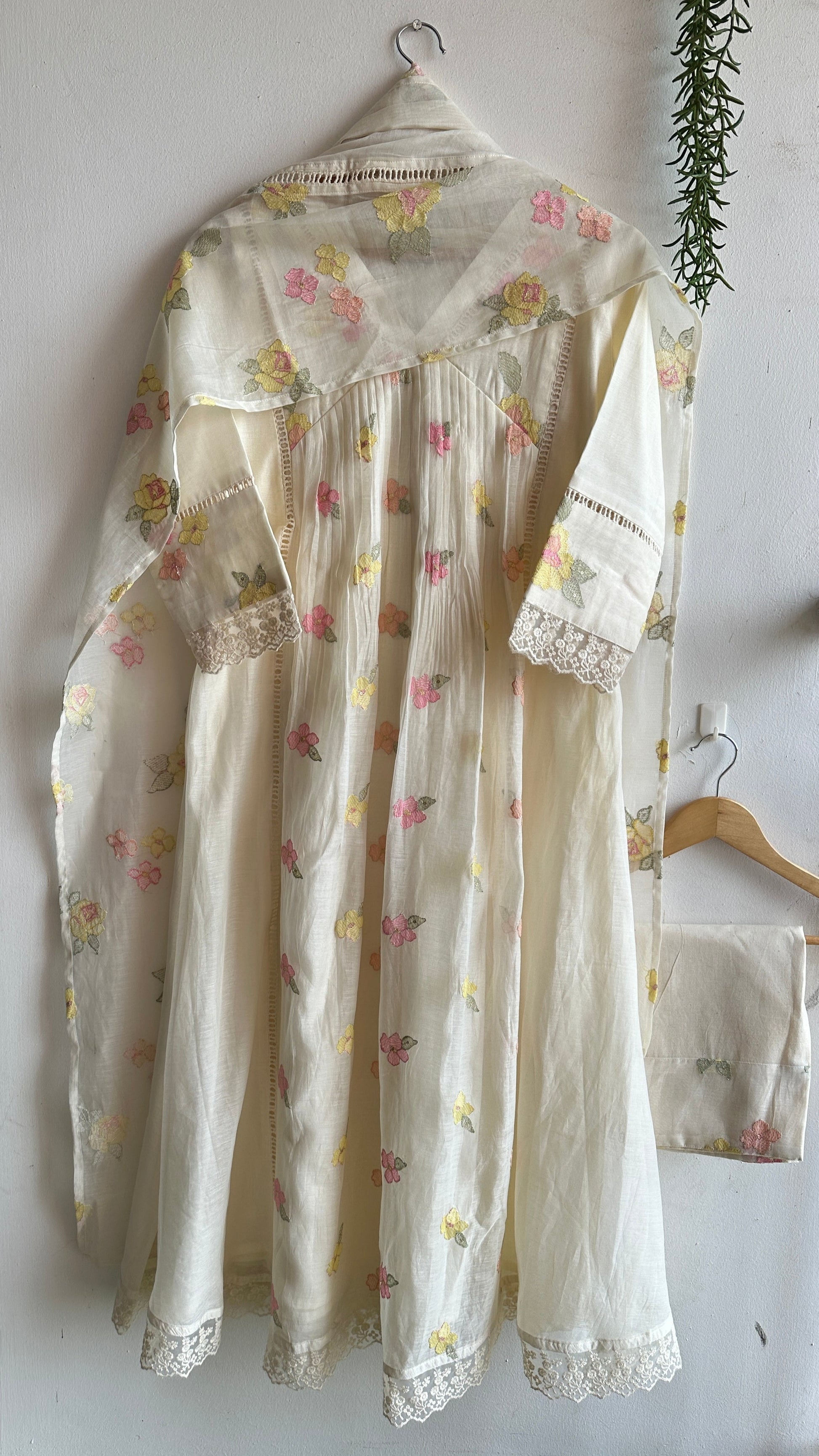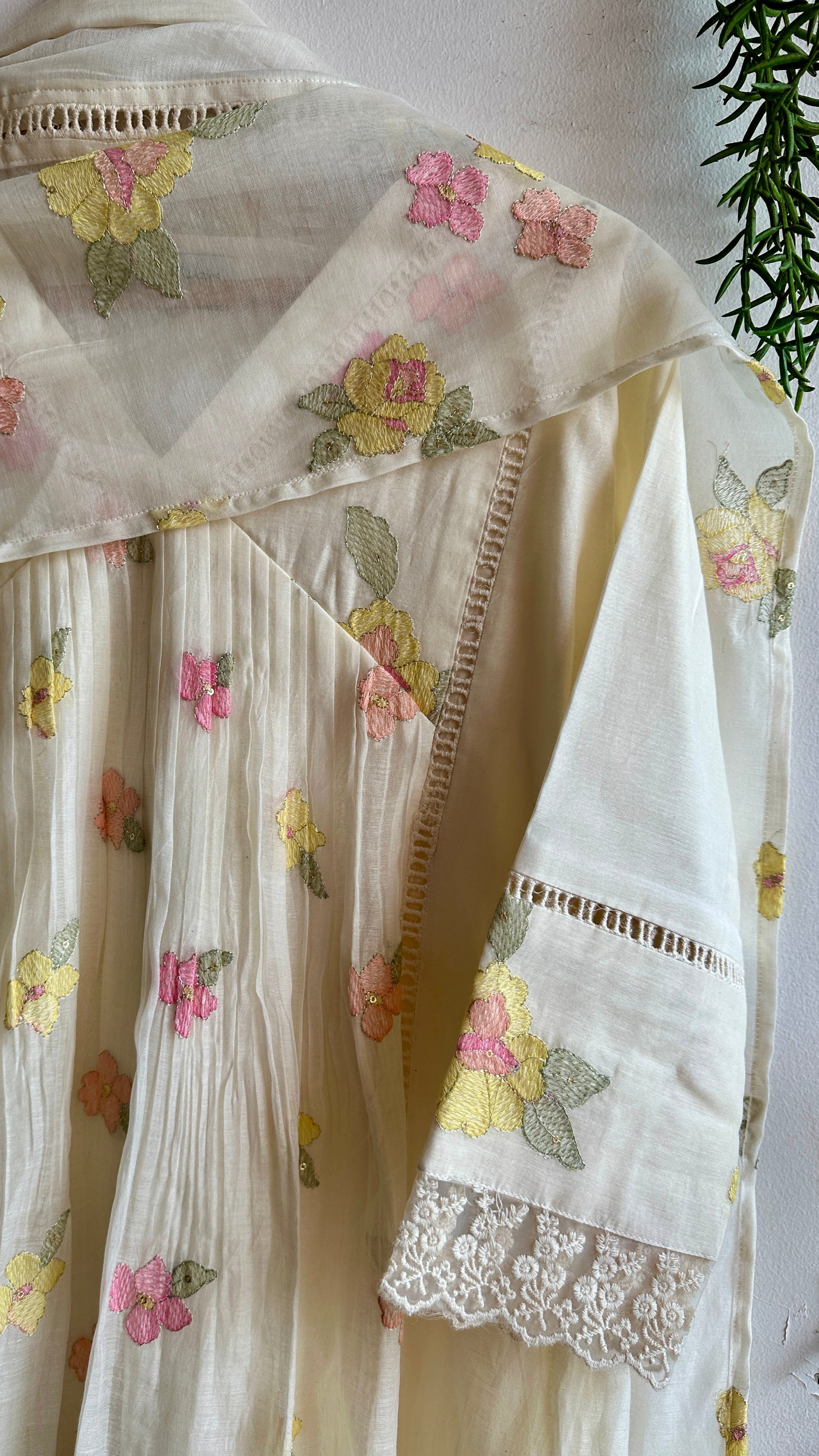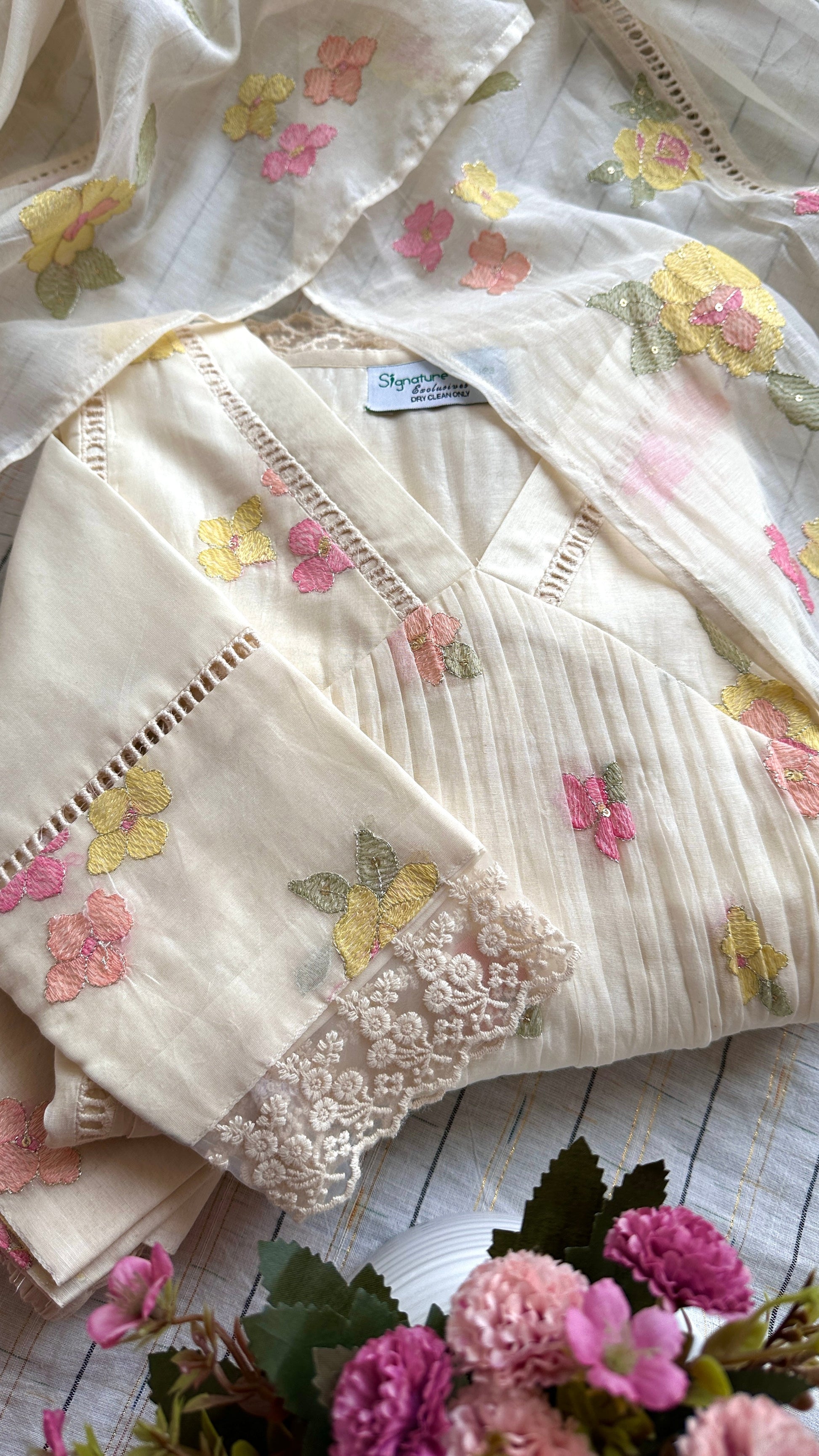 A soft symphony of pastels on an off-white base—this outfit feels like spring woven into fabric. Crafted in soft Chanderi, this three-piece set features delicate floral embroidery in shades of pink, yellow, and peach. The kurti comes with fine pleats, lace-finished sleeves, and a hemline that adds a touch of charm. The dupatta carries the same blooming details, keeping the look light, dreamy, and pretty.