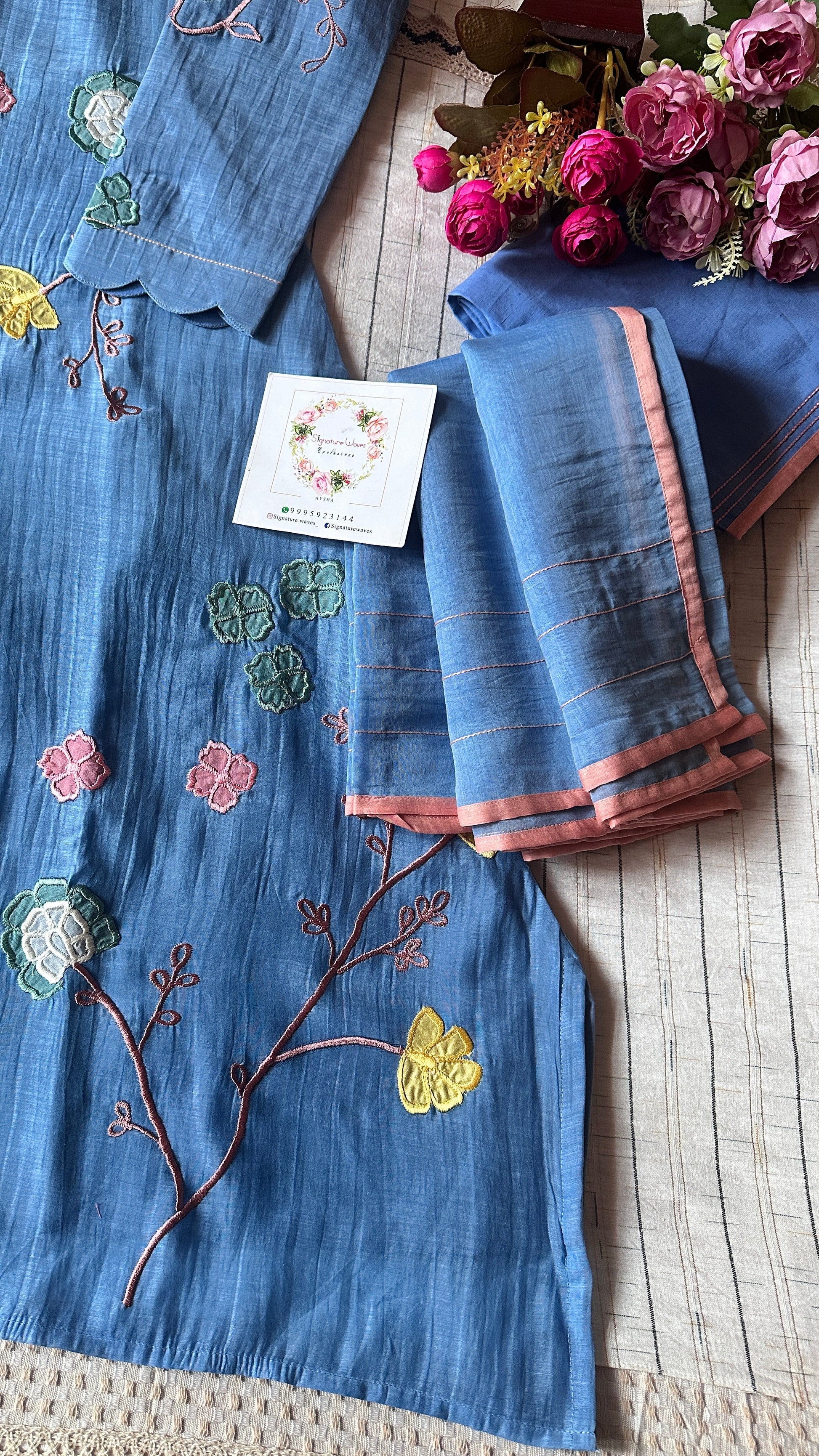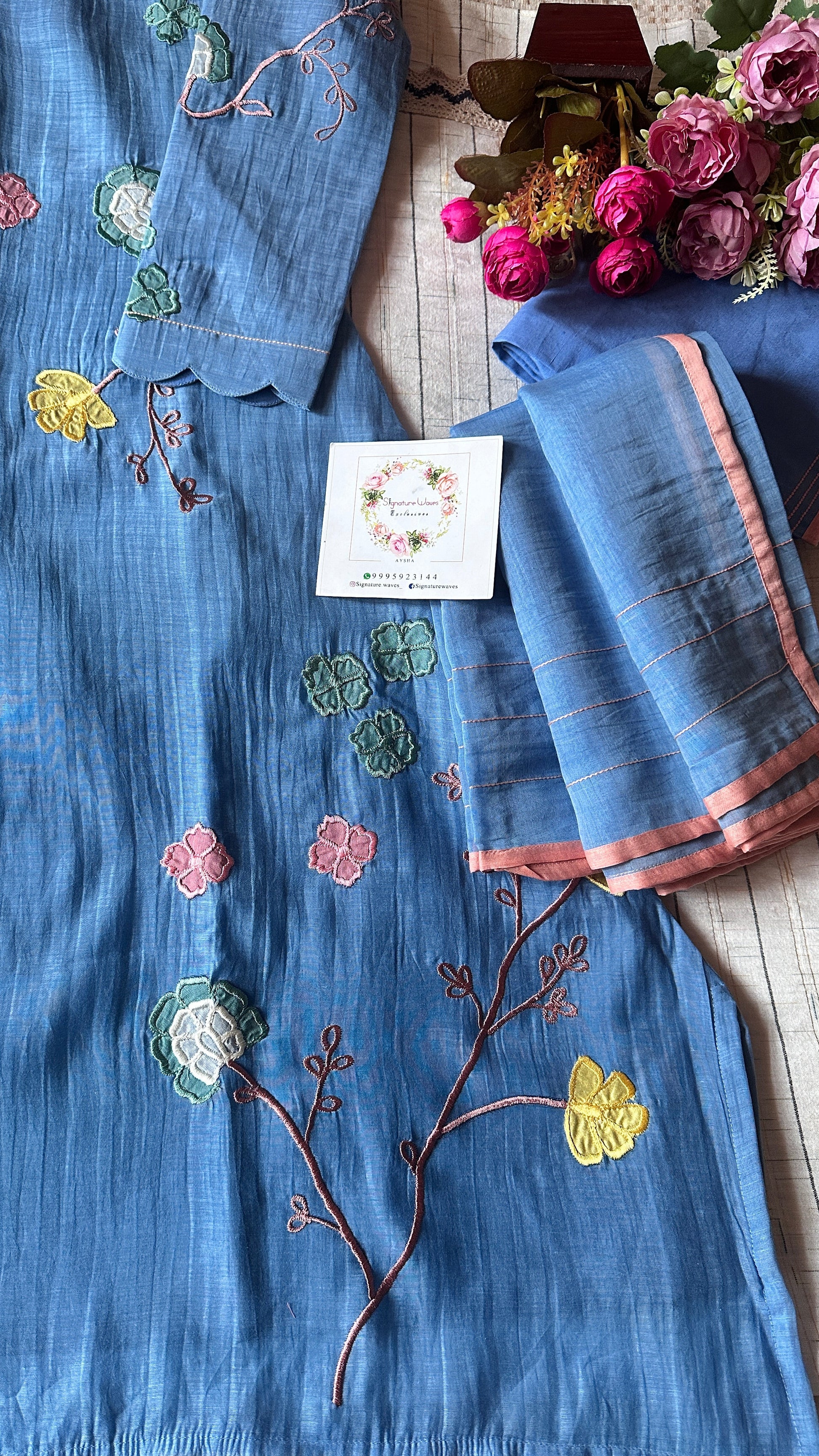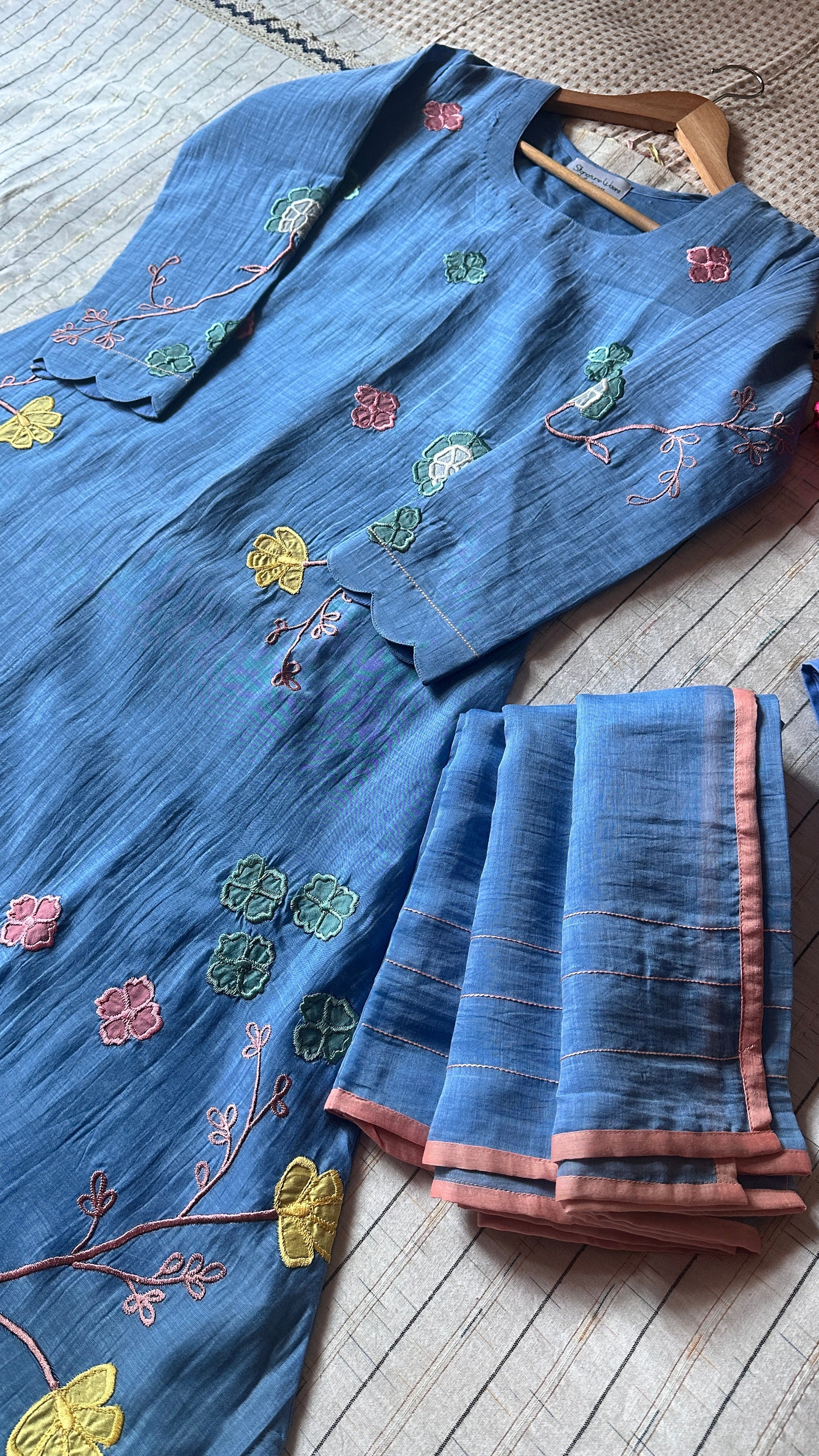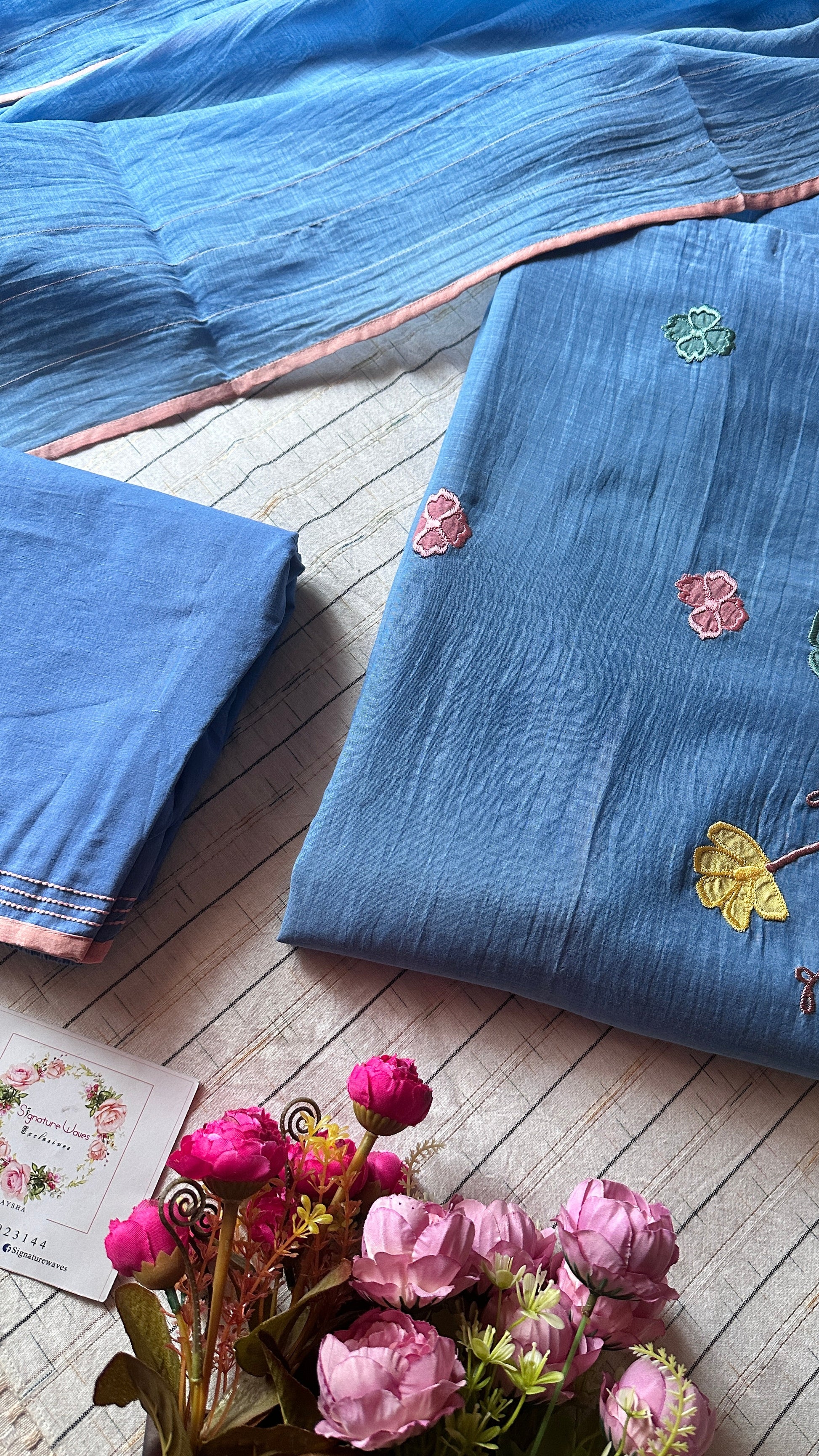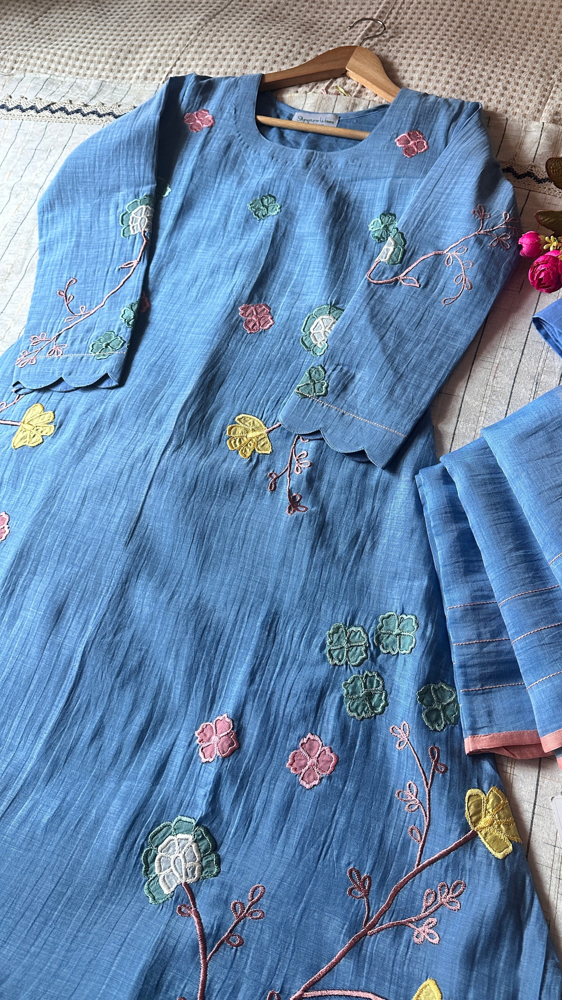 A serene Chanderi three-piece suit crafted in a calming shade of blue, adorned with delicate multicolor threadwork that brings the fabric to life. The kurta features soft scalloped sleeves and graceful floral embroidery in hues of pink, yellow, green, and white — each motif adding a touch of handcrafted charm. Fine pink detailing flows beautifully across the front and sleeves, giving the outfit a gentle, artistic feel.