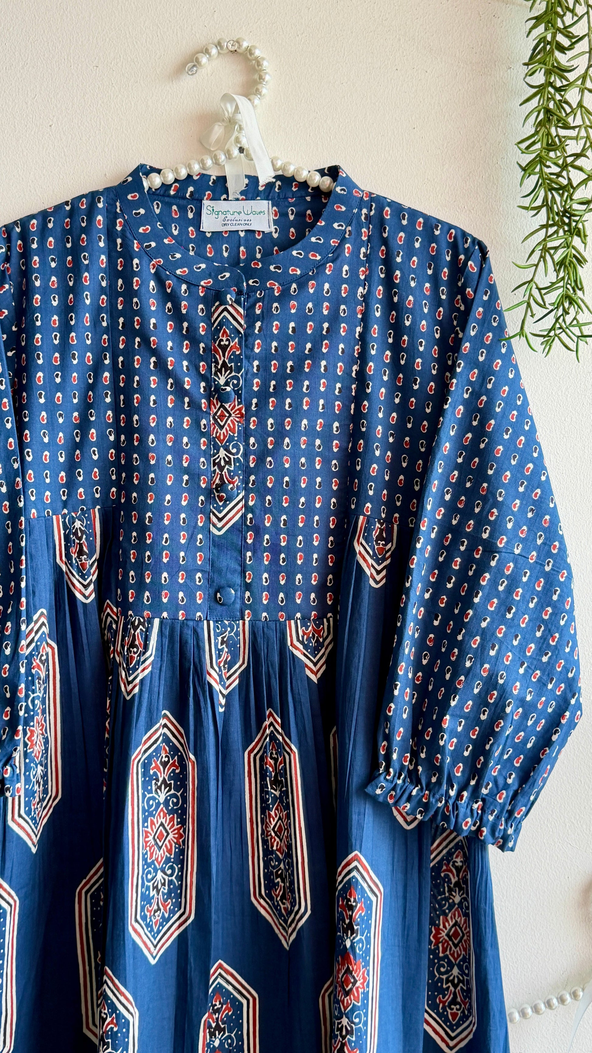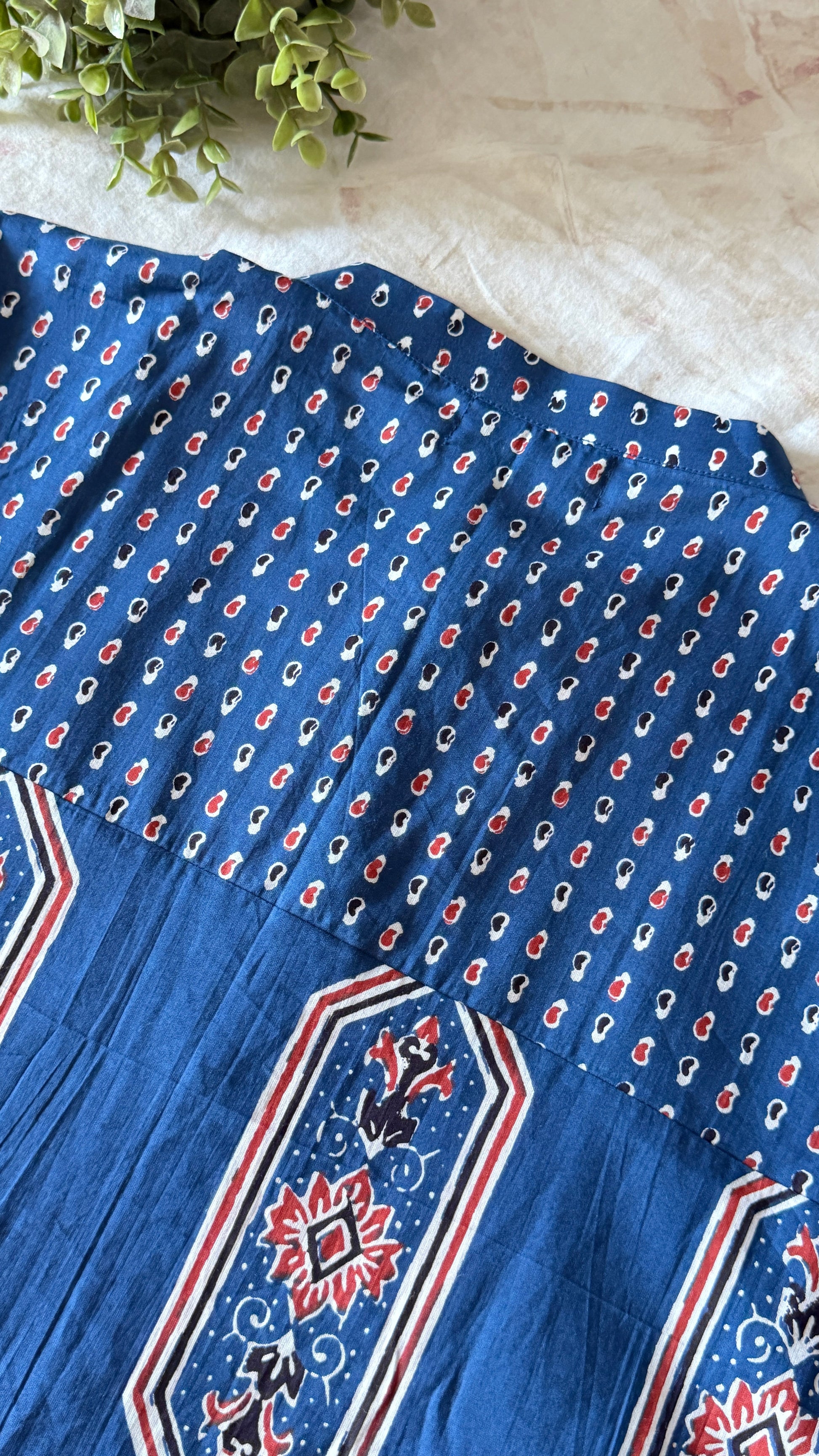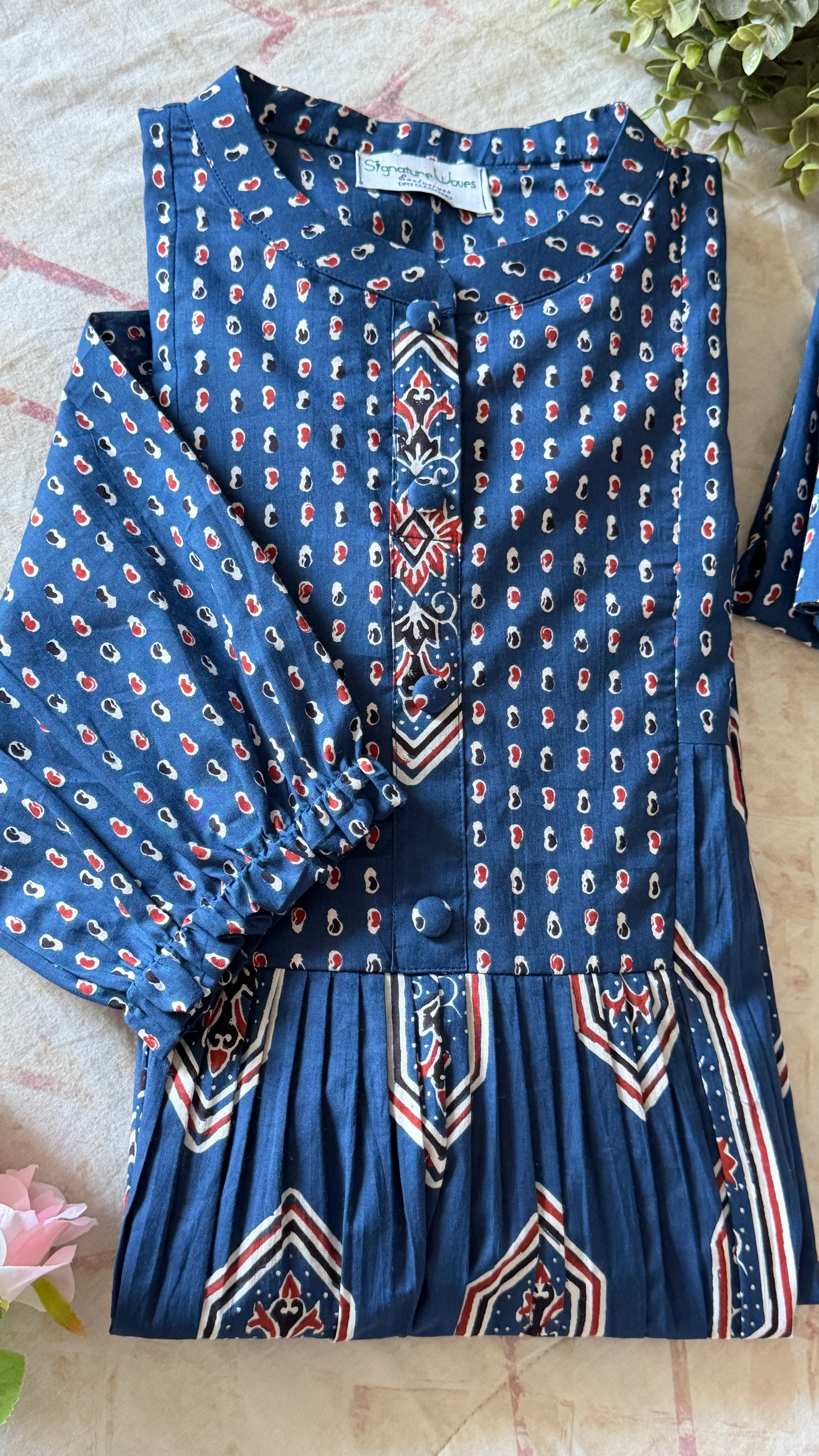 A deep blue cotton cord set that feels as good as it looks.Soft cotton kurti paired with pants detailed in tiny prints.Subtle, neat, and very wearable.