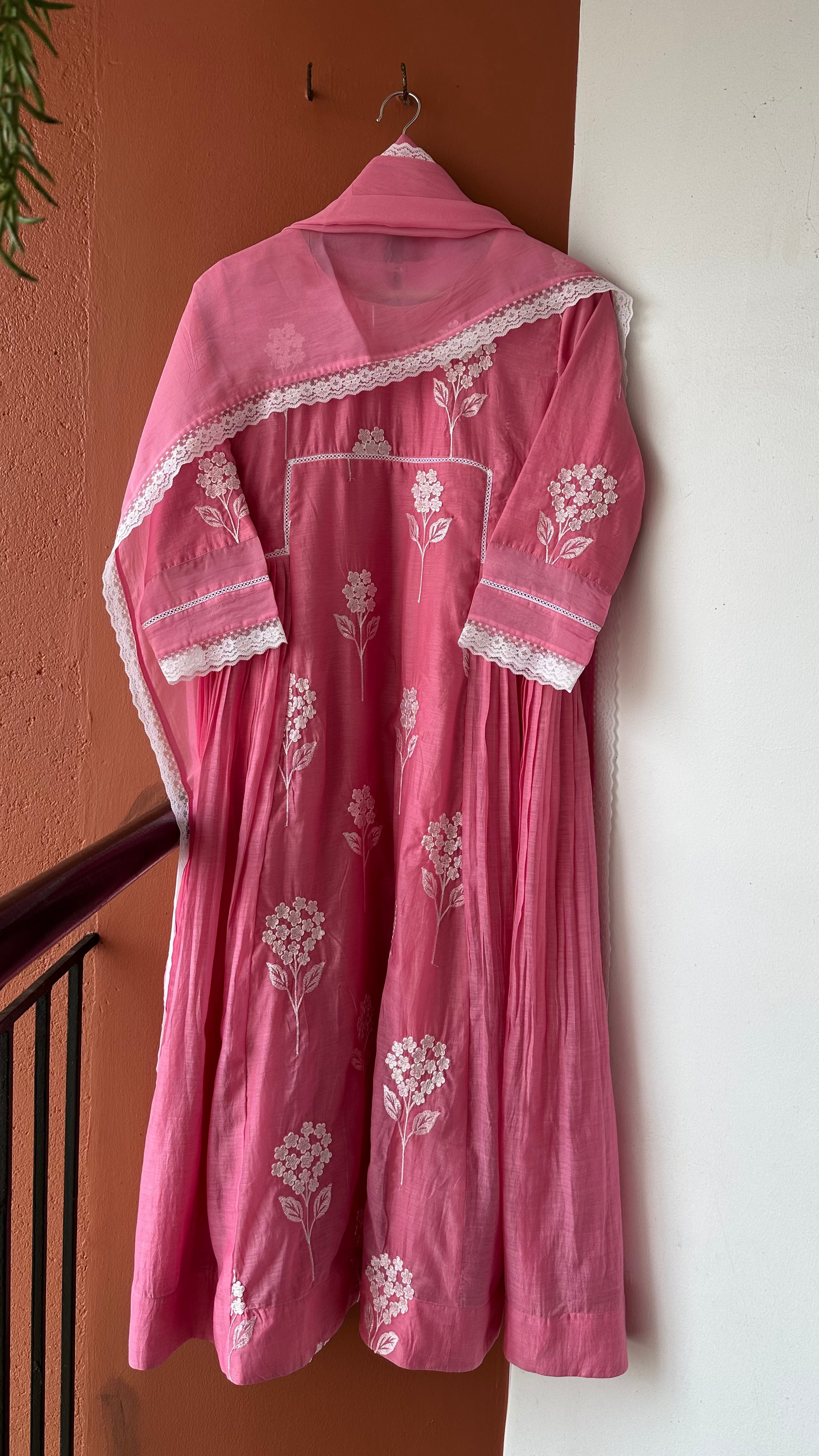 A soothing pink dream woven in soft Chanderi fabric — this three-piece suit set is all about grace and freshness. This outfit features delicate white floral embroidery that blooms across the yoke and sleeves, detailed with lace inserts that add a touch of prettiness to every seam.