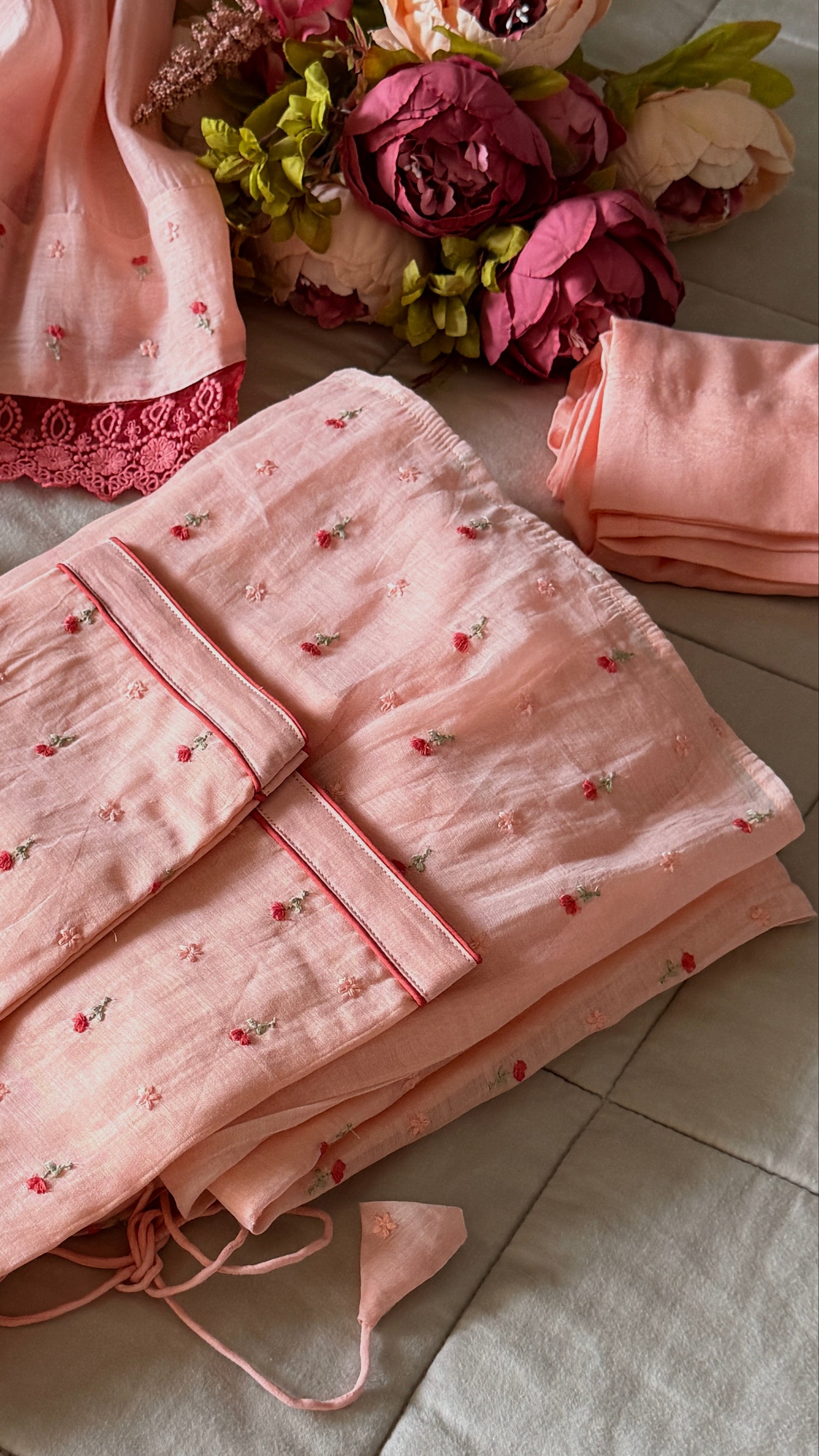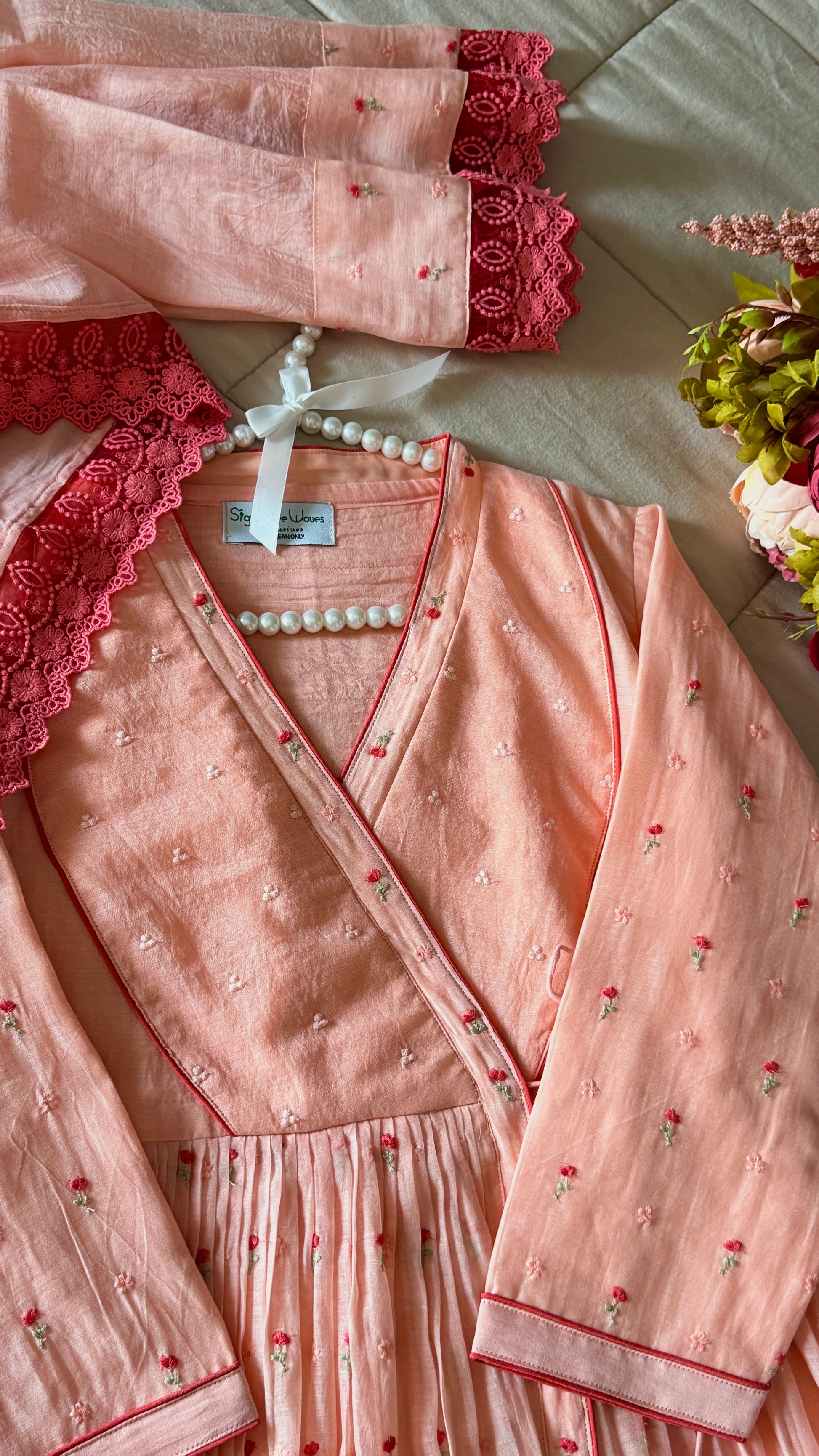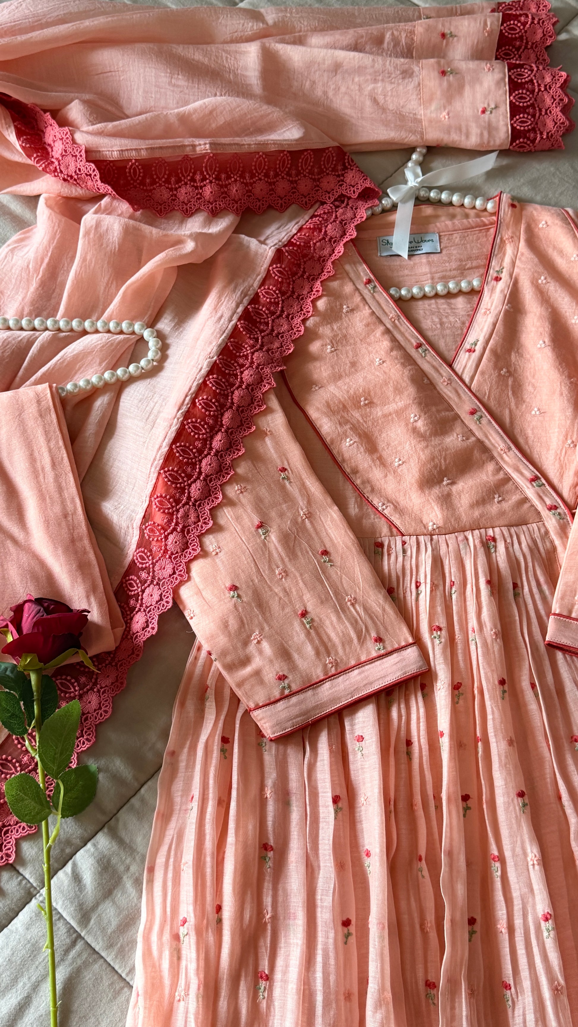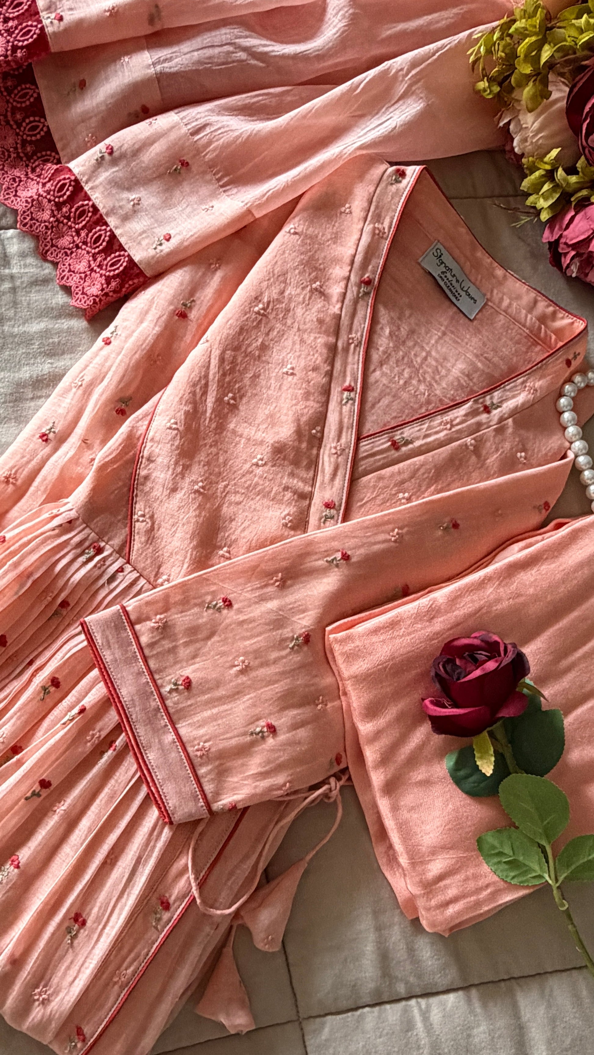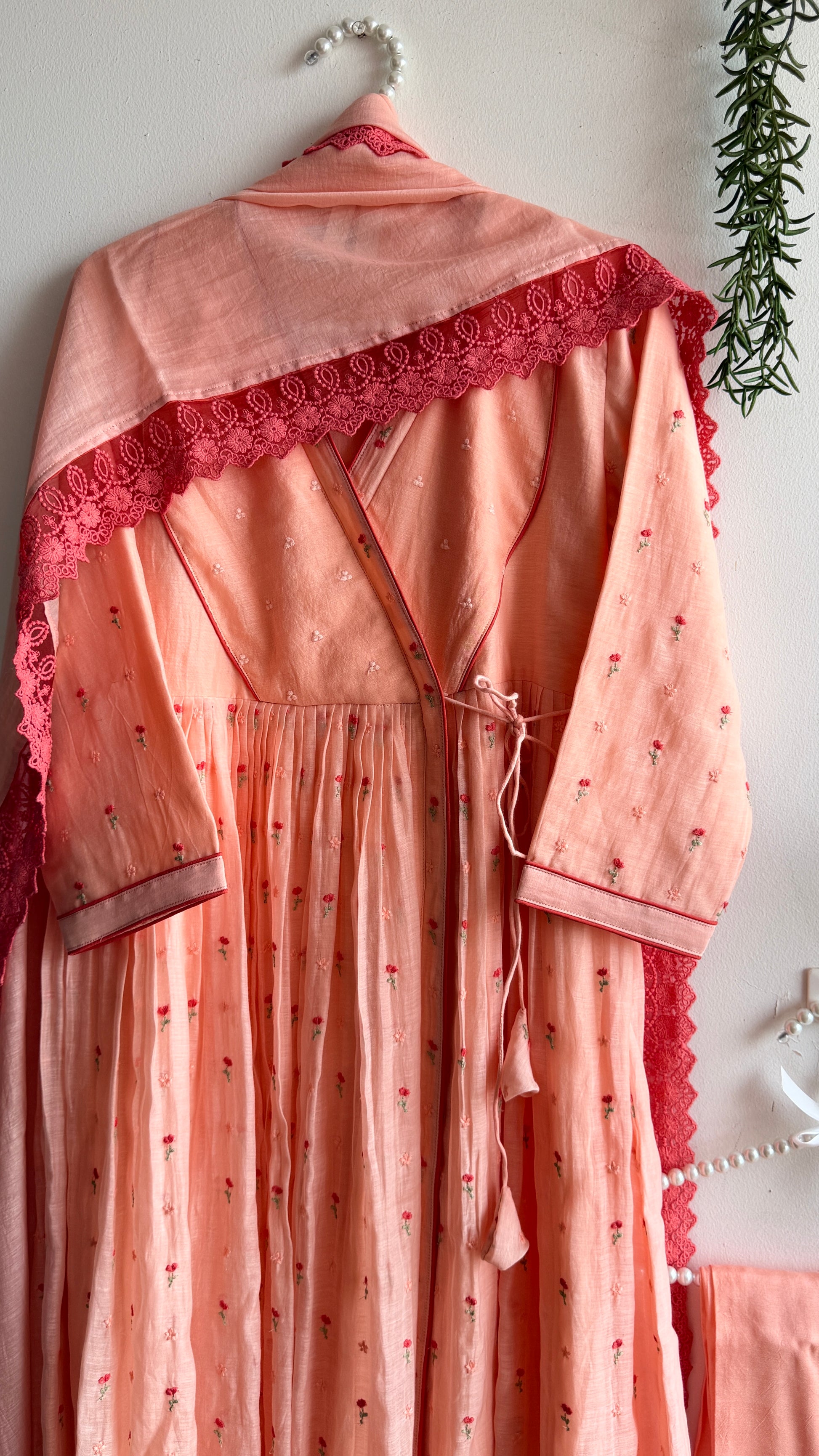 A peach-toned Chanderi beauty that feels like soft petals in motion. Crafted in a delicate Angrakha pattern, this outfit blooms with subtle embroidery that gently highlights the yoke and flow of the silhouette. The airy Chanderi fabric adds a light, fluid fall, making it perfect for day festivities and intimate celebrations.