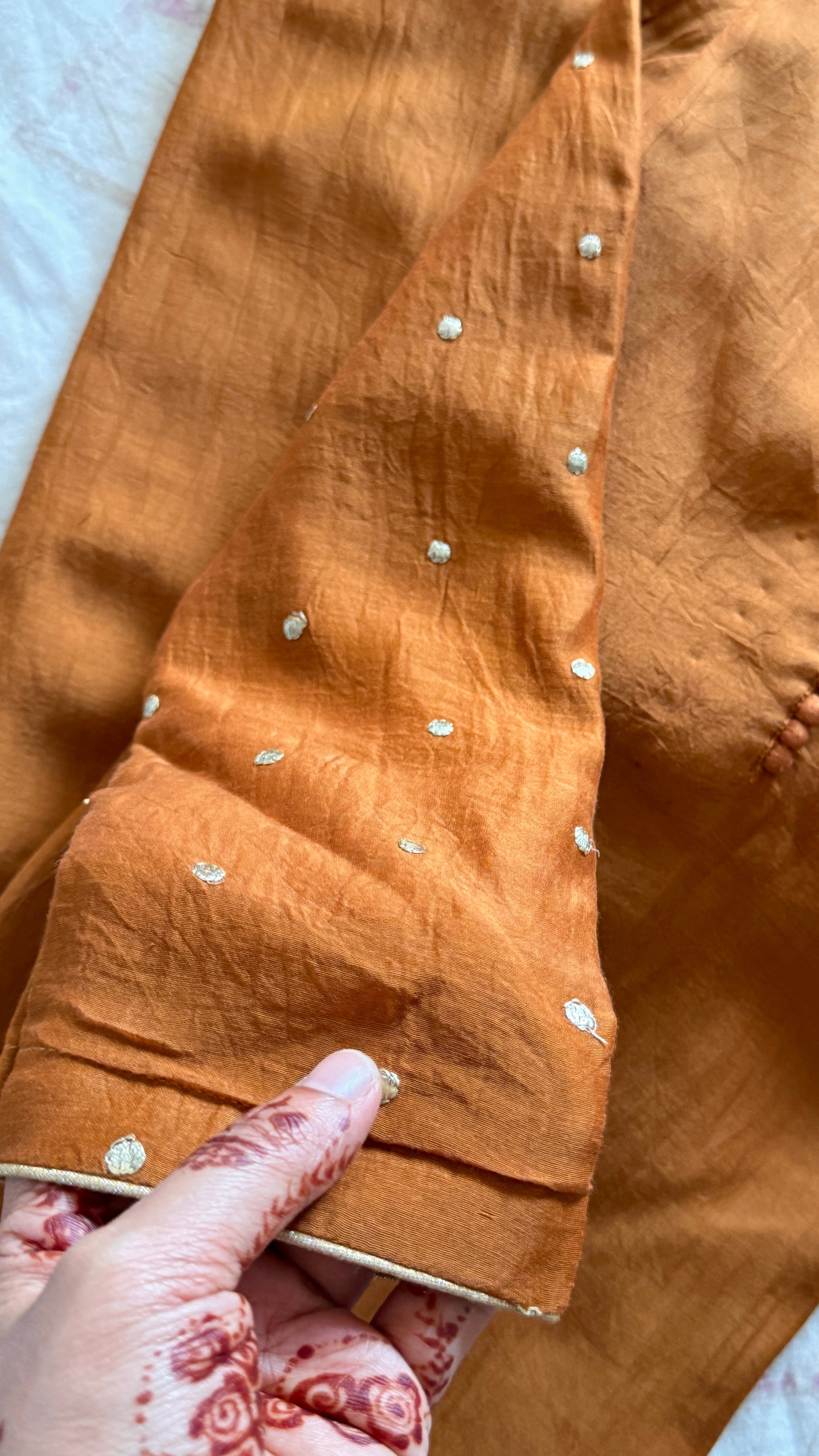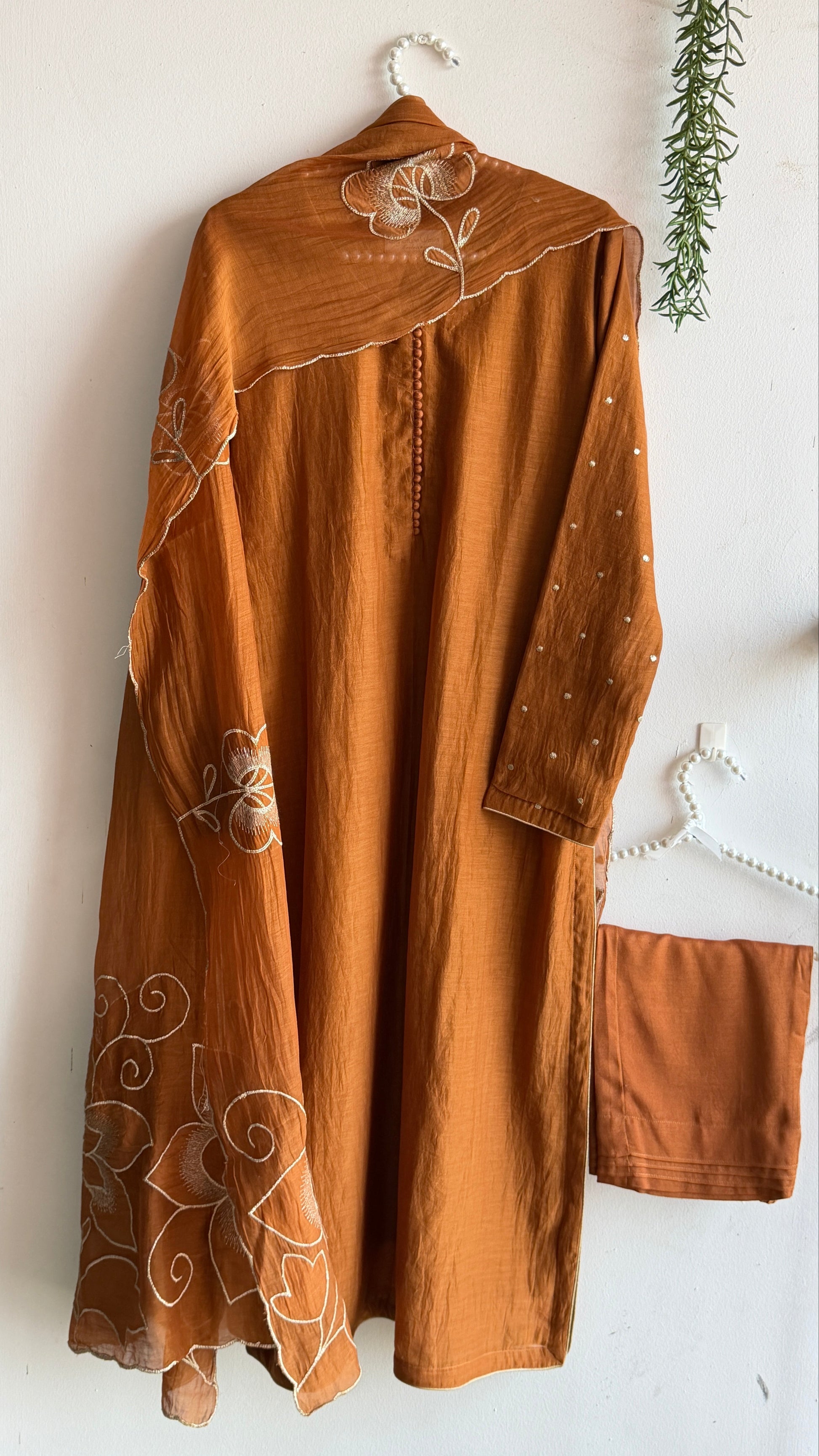 A soothing blend of warmth and softness, this burnt copper toned suit set is all about quiet detailing, done in a straight cut pattern with pure mul Chanderi with a natural fall alone with beautiful appliqué work dupatta and subtle hand embellishments on the sleeves and fine piping finishing on sleeve , slits and hemline. Paired with matching pants.