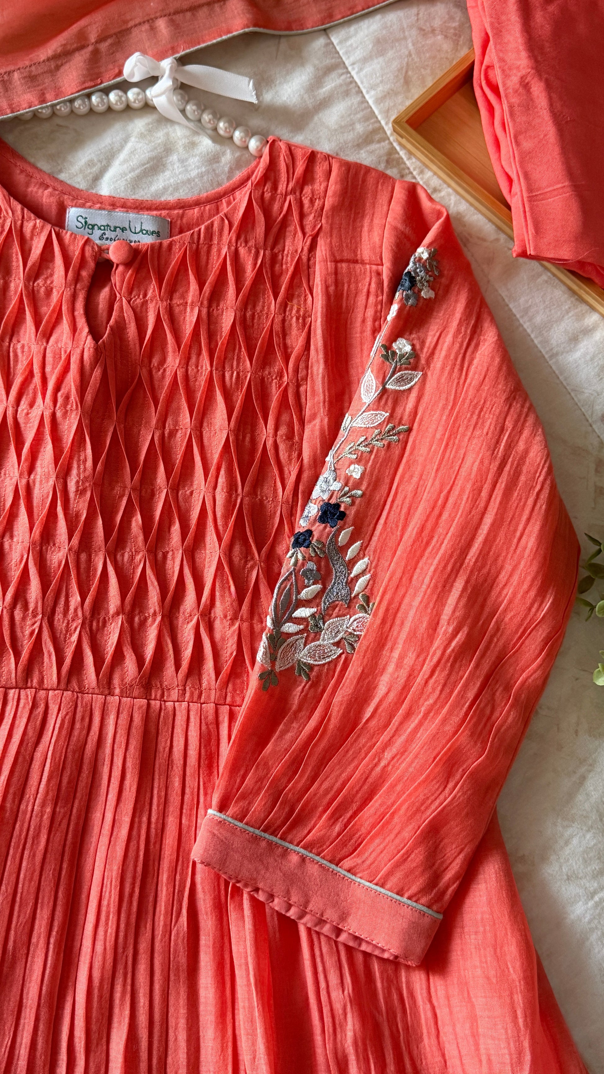 Crafted in a soft, flowy fabric with delicate pintuck detailing on the yoke, this Anarkali style kurta moves effortlessly with every step. The floral hand embroidery on the sleeves adds a gentle contrast, making the outfit feel thoughtfully detailed yet easy on the eyes.
