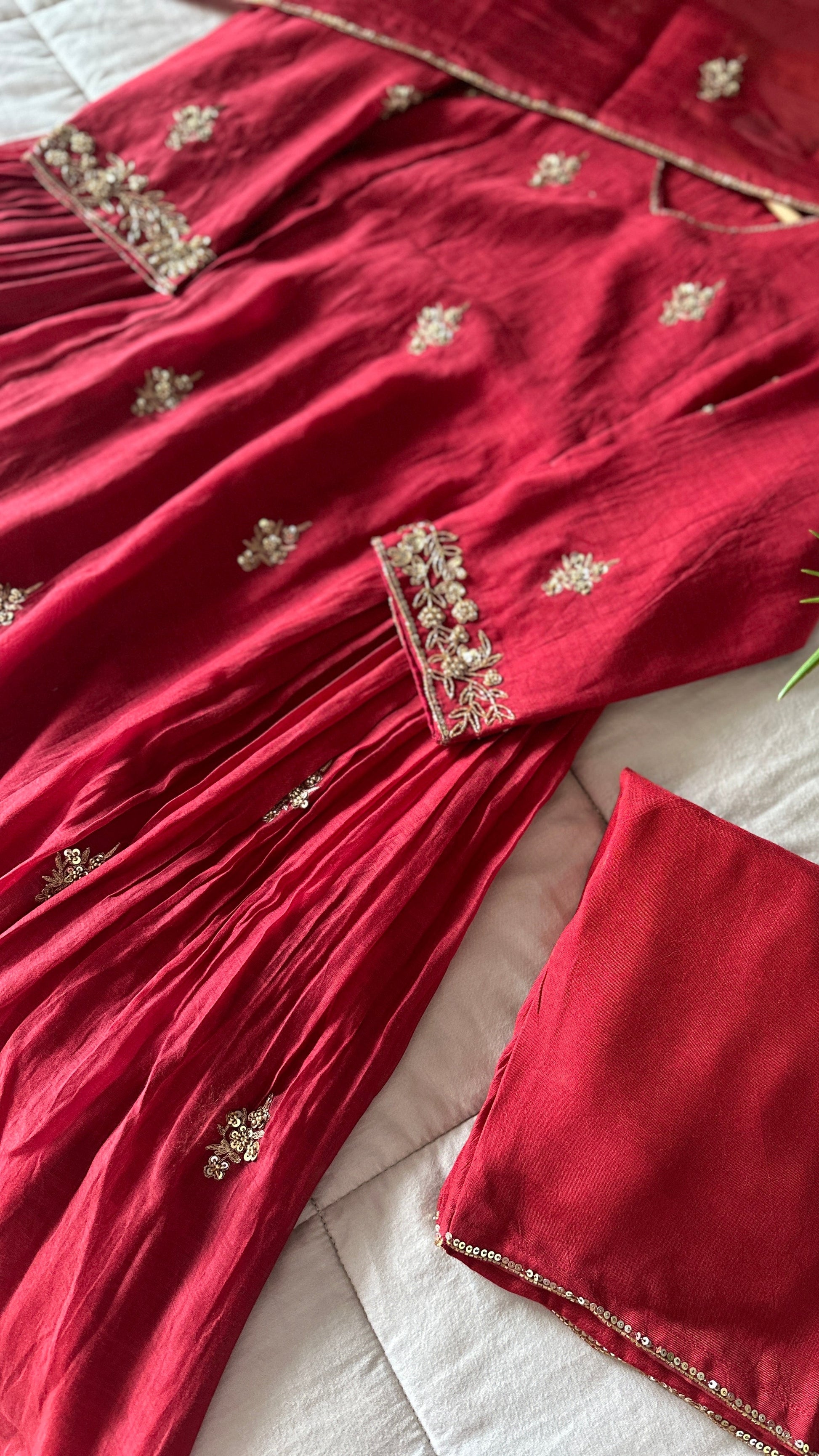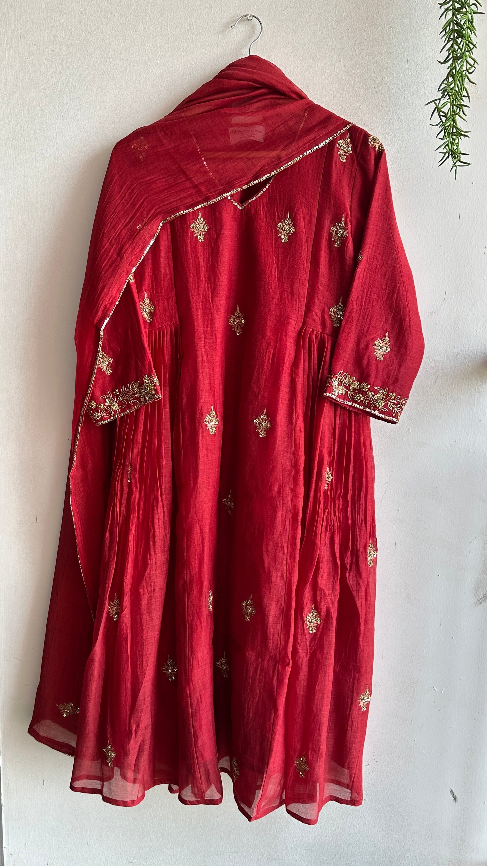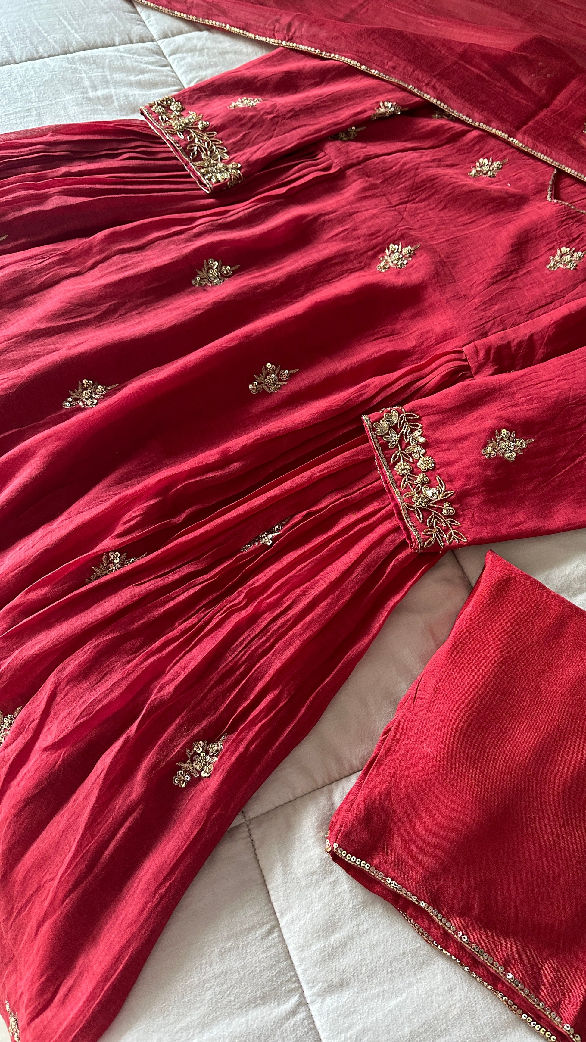 Suit Description: A pure Chanderi 3-piece A-line suit set, adorned with intricate handwork adding an extra touch of elegance. The pants feature delicate sequin edging, and the organza dupatta is beautifully finished with handwork throughout and bordered on all four sides.