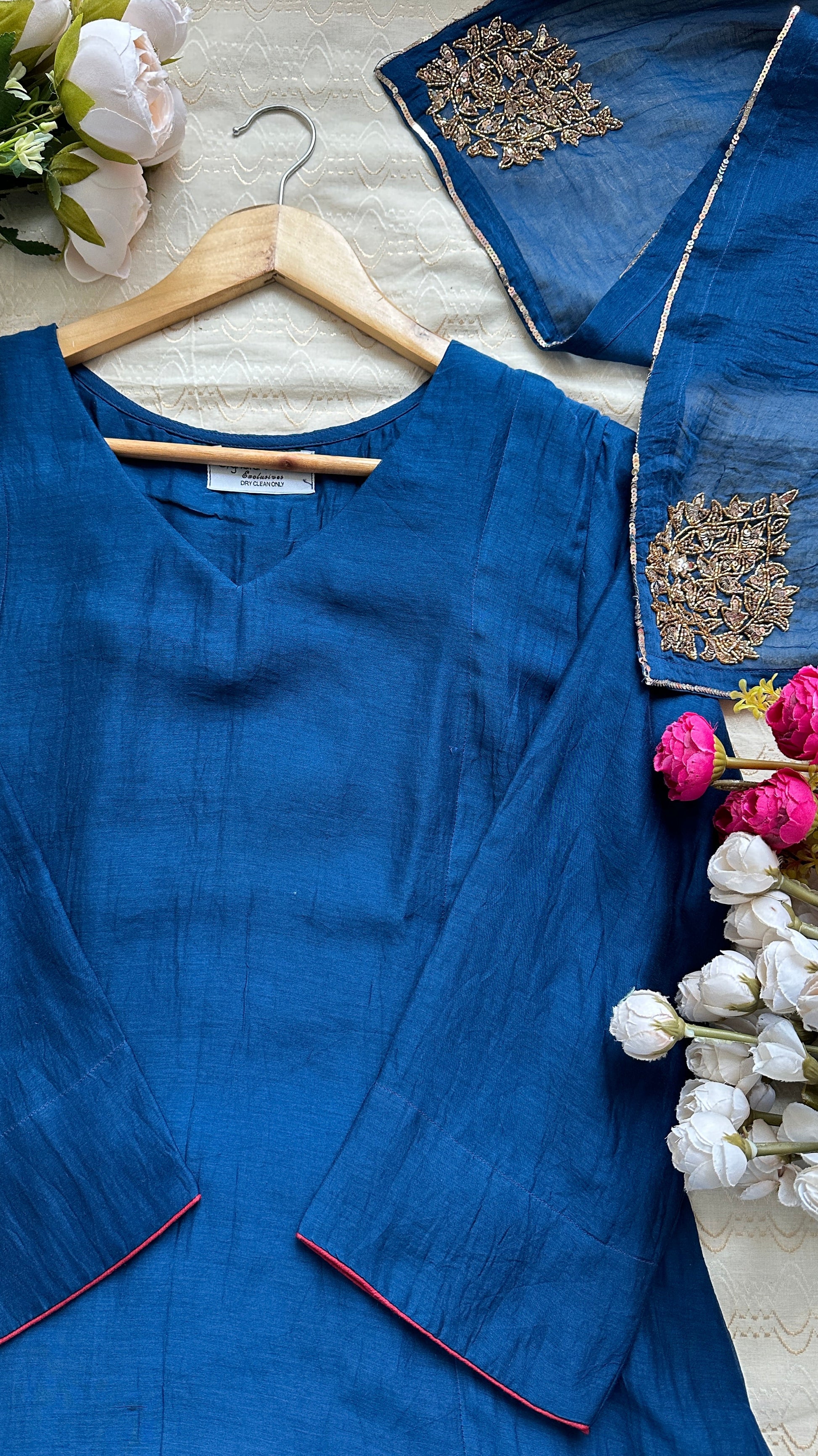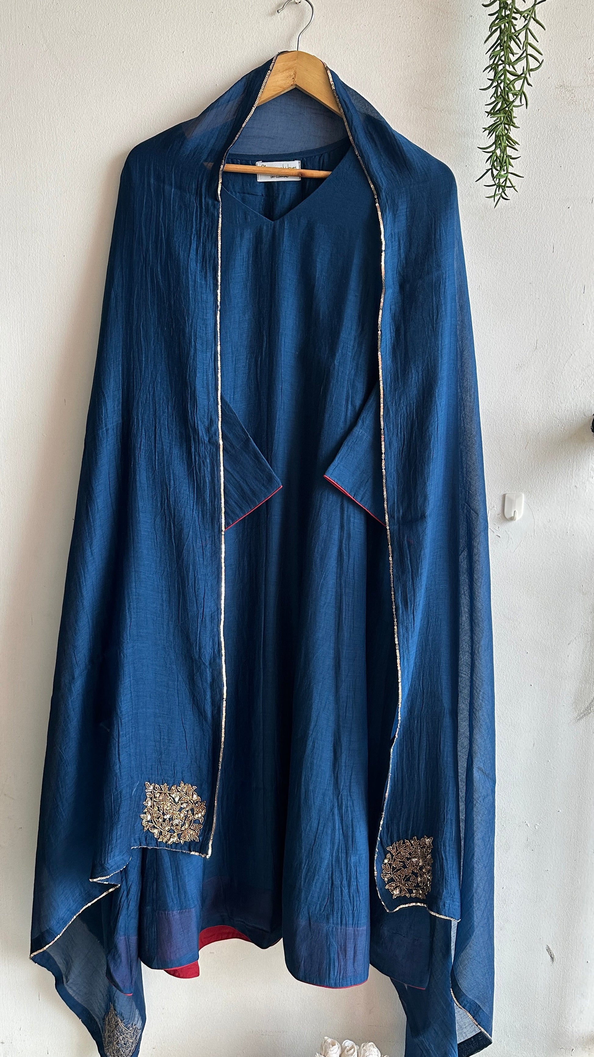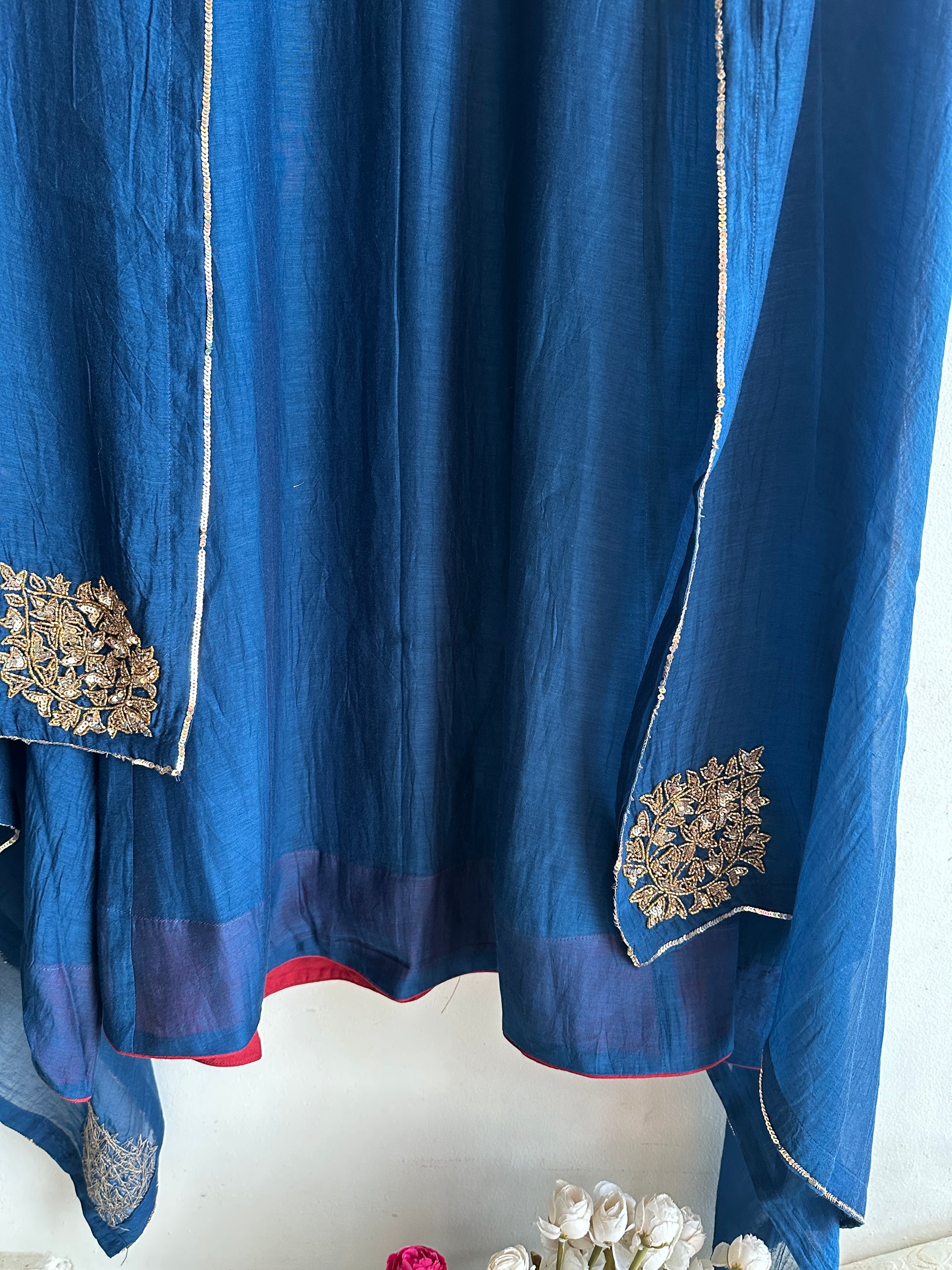 There’s something undeniably captivating about this hue—a deep blend of sapphire and ocean blue that feels both bold and serene. This three-panel A-line suit set features exquisite handwork that subtly comes alive with every detail.