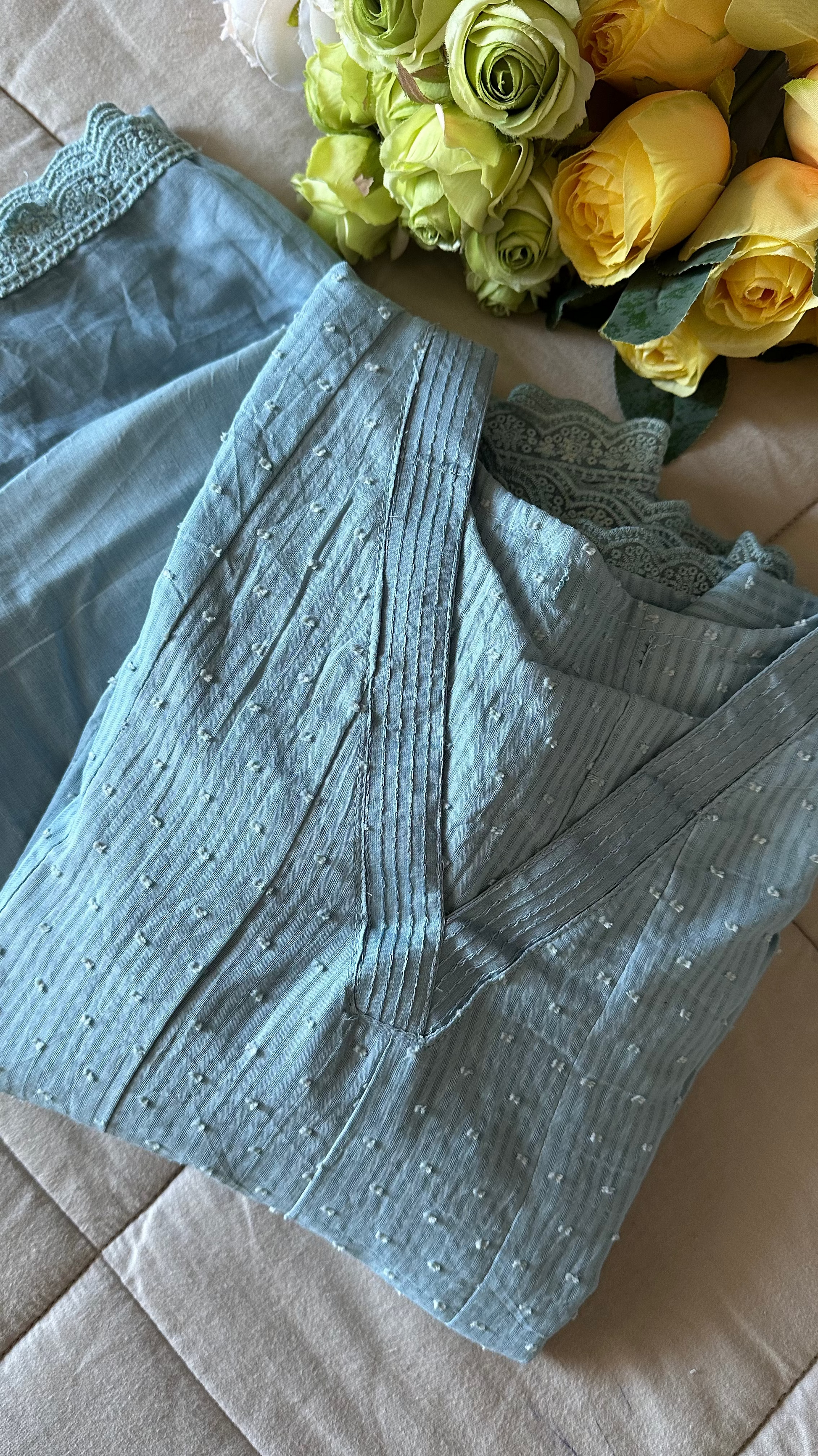 Inspired from Indian summers which is a season of travel and romance. It’s a 3 piece suit set done in soft cotton fabric while dupatta done in mul mul with beautiful lace detailing along with a pair of cotton pants.