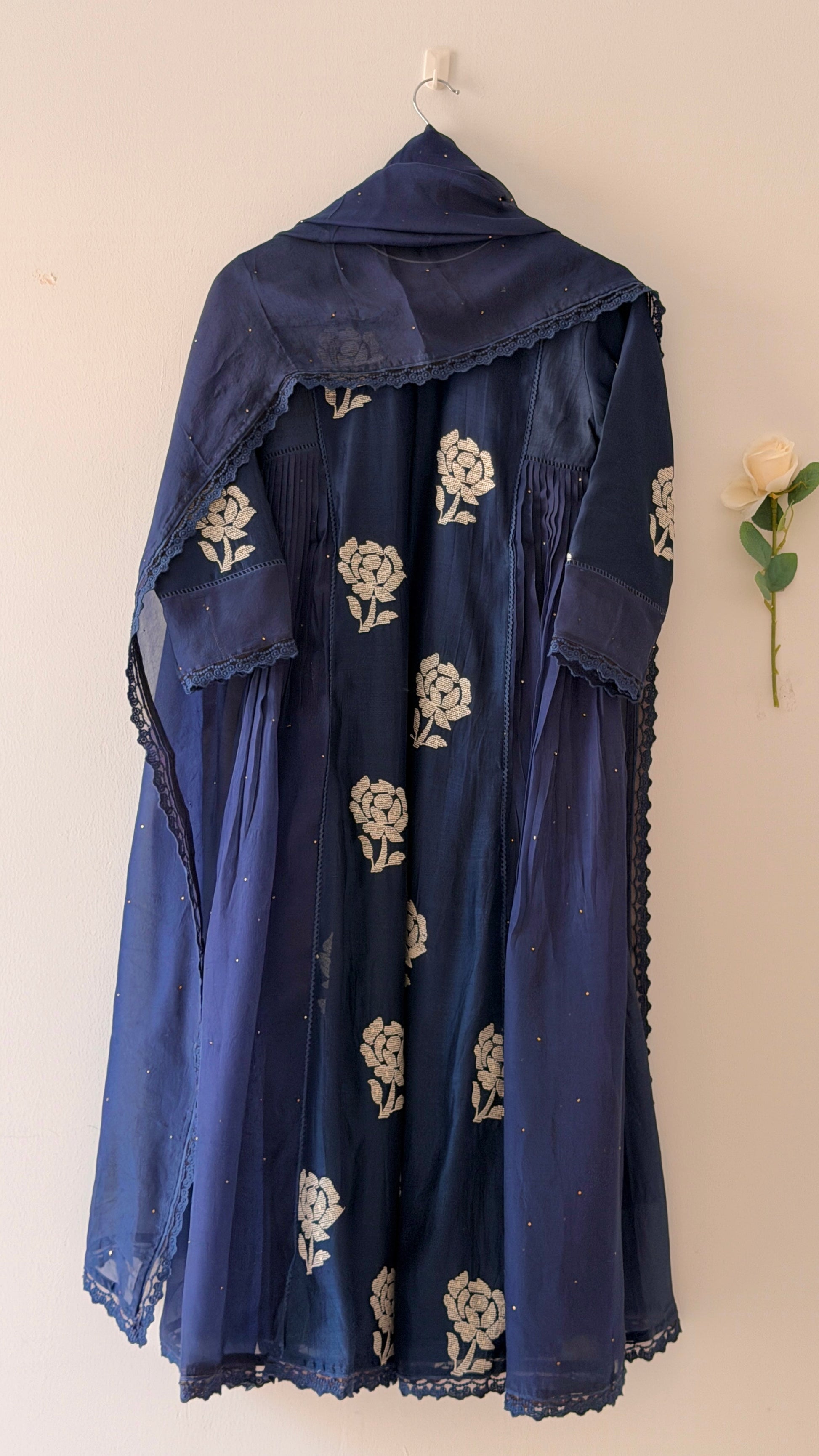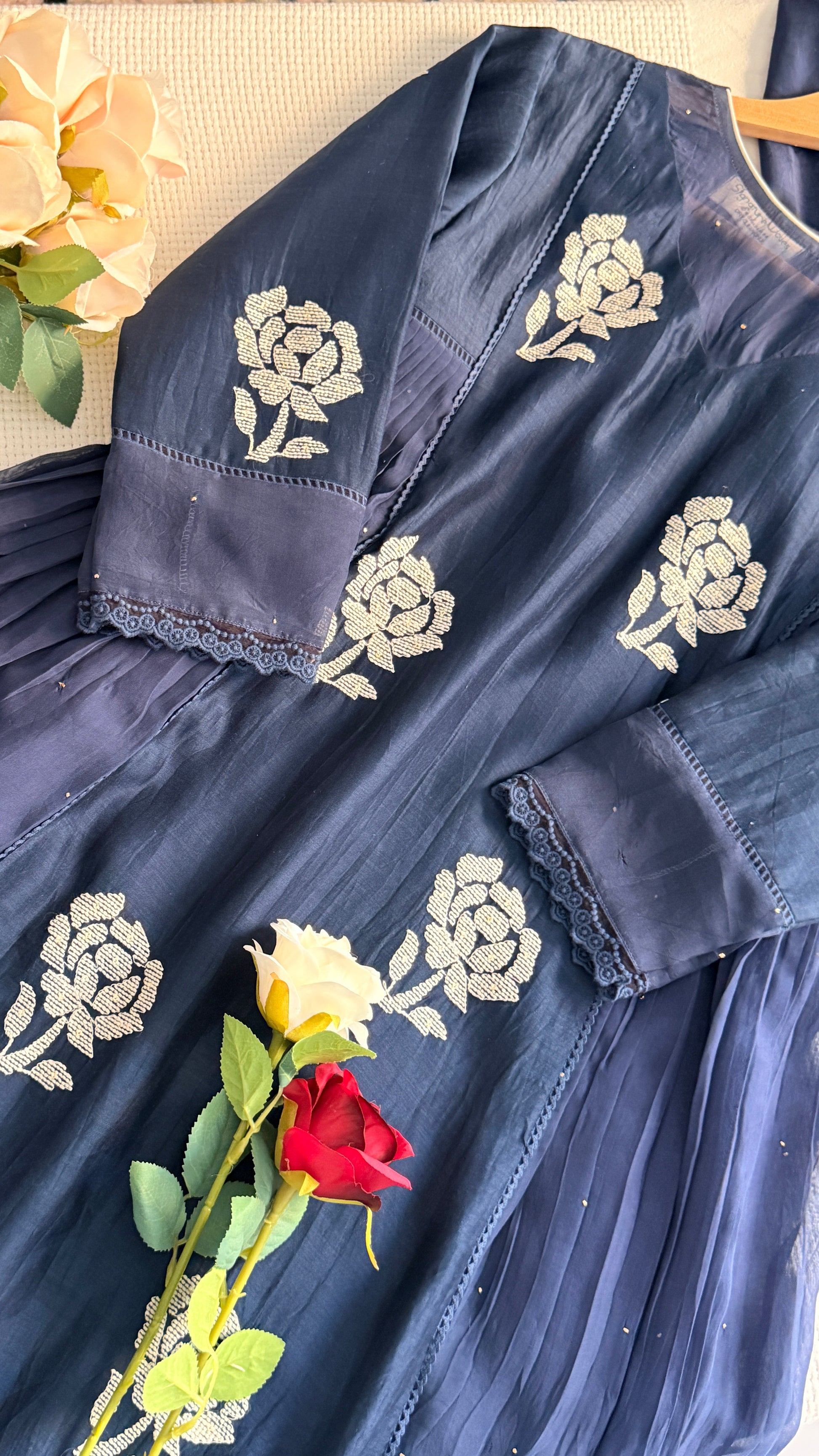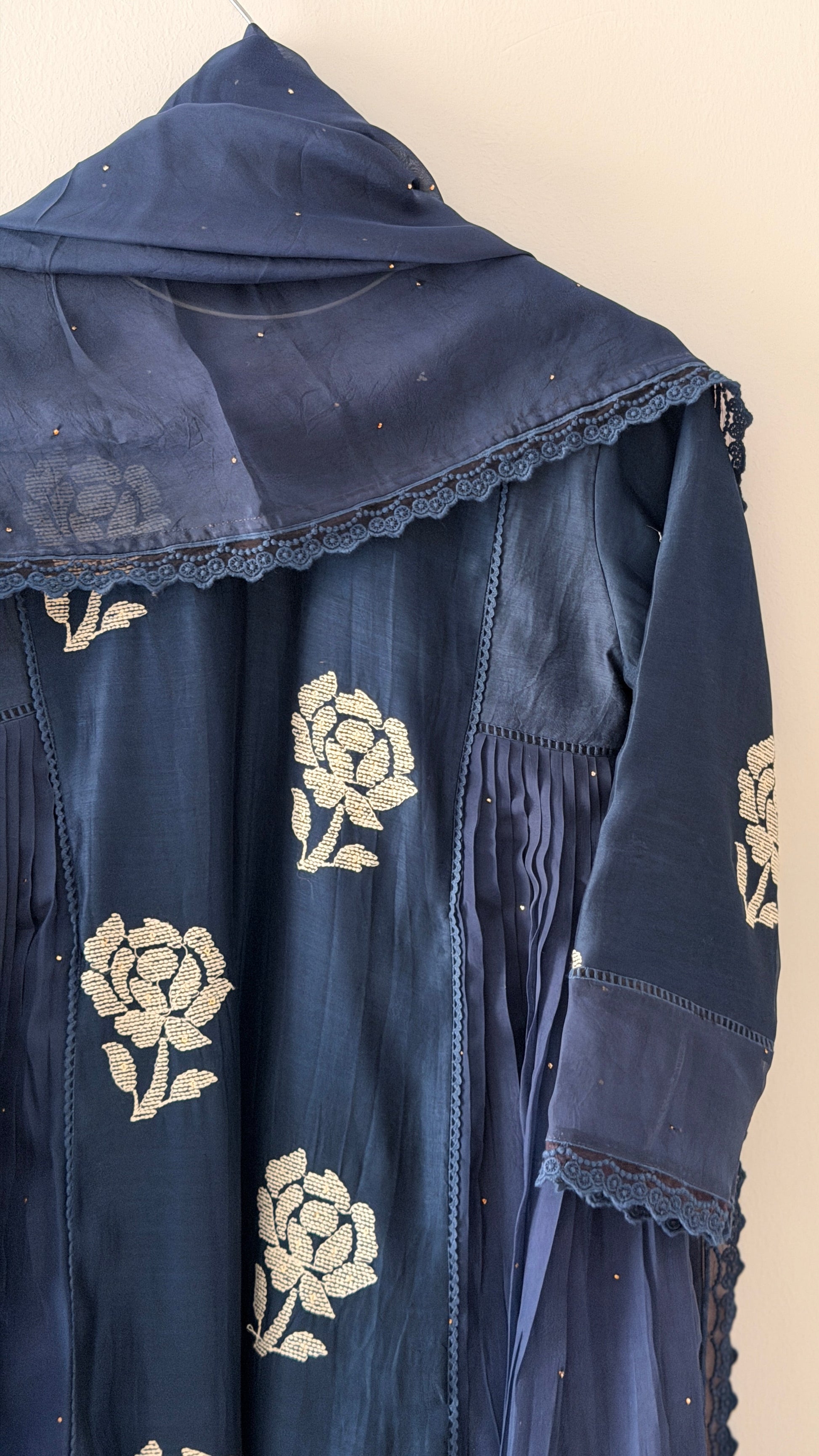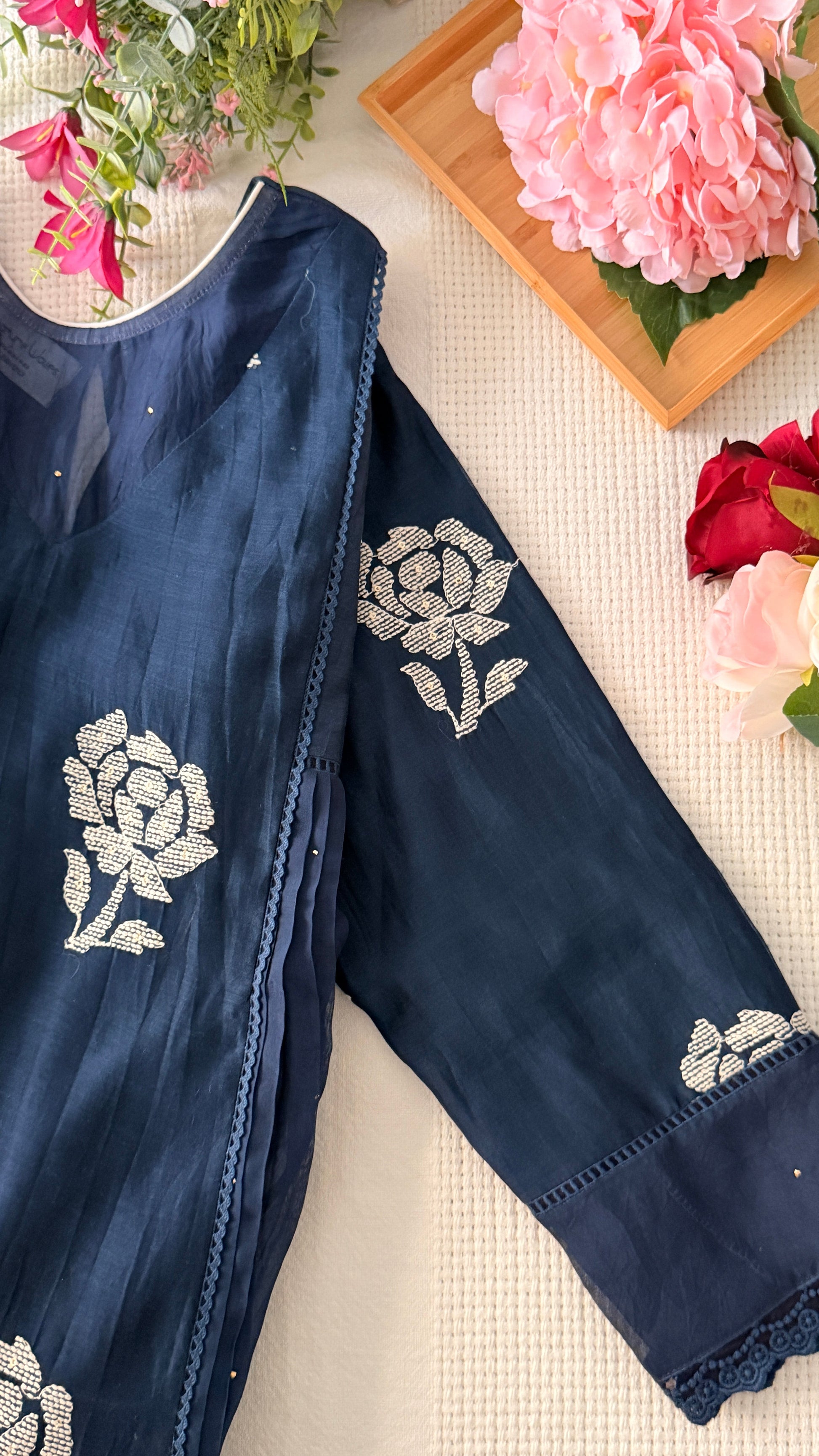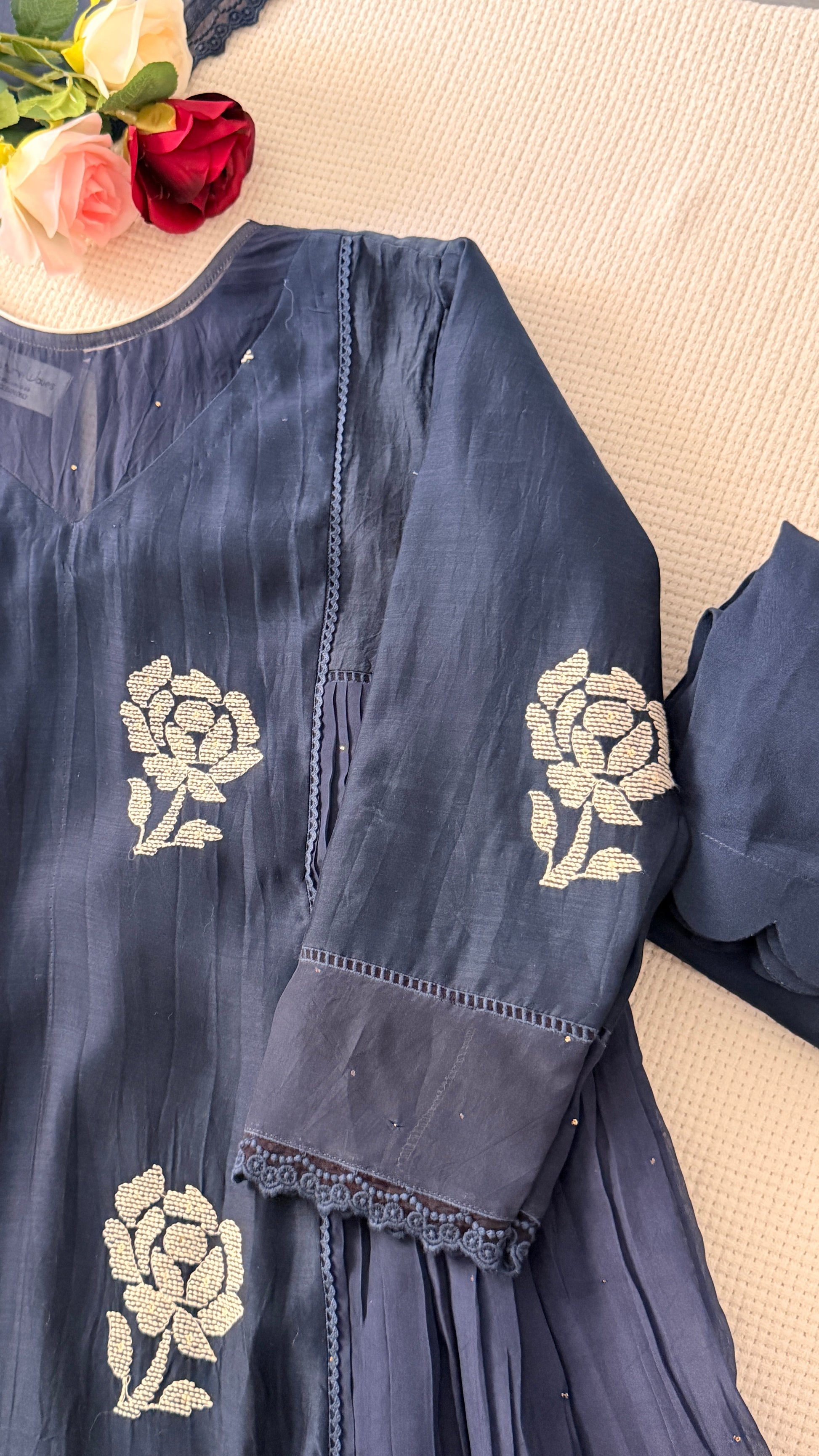 The neckline is designed with a gorgeous pattern that adds a refined finish. The side panels are enhanced with delicate organza Badla work, making the silhouette even prettier. The most important highlight is the thread-work embroidery on the front portion and sleeves detailed, elegant, and exceptionally beautiful.
