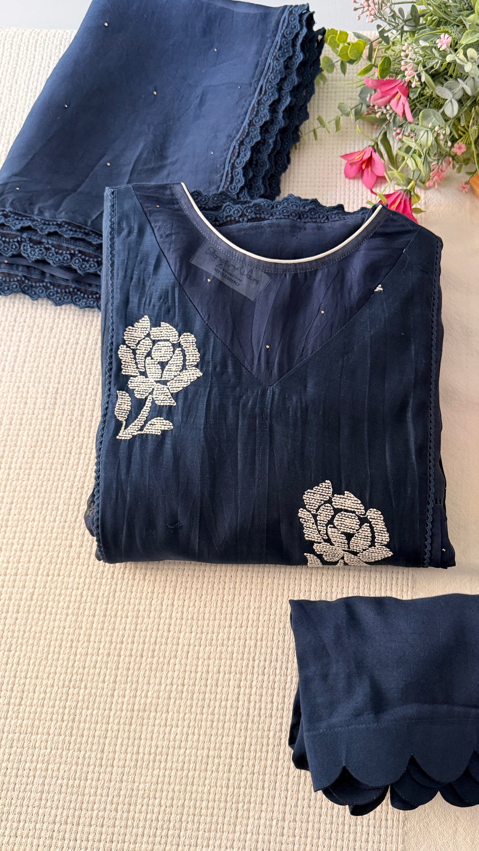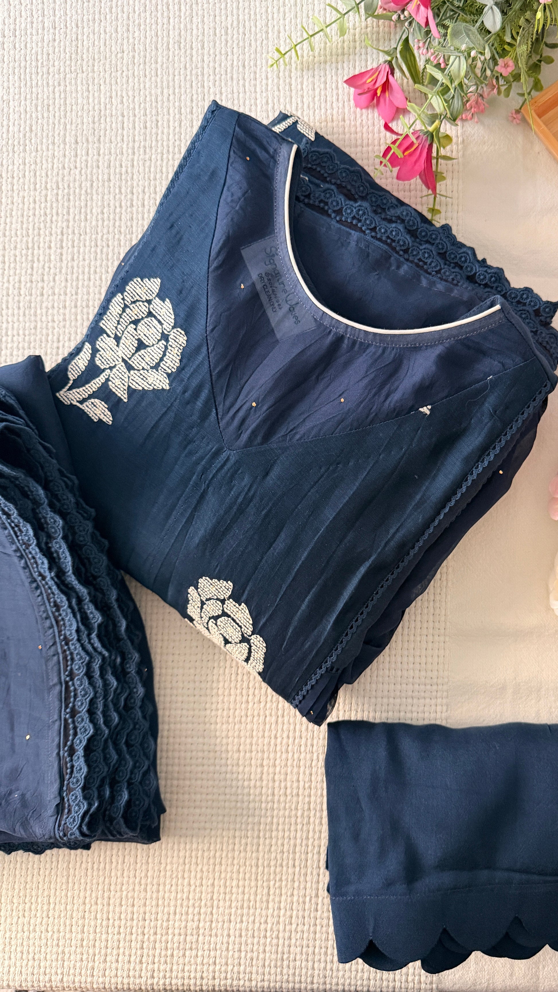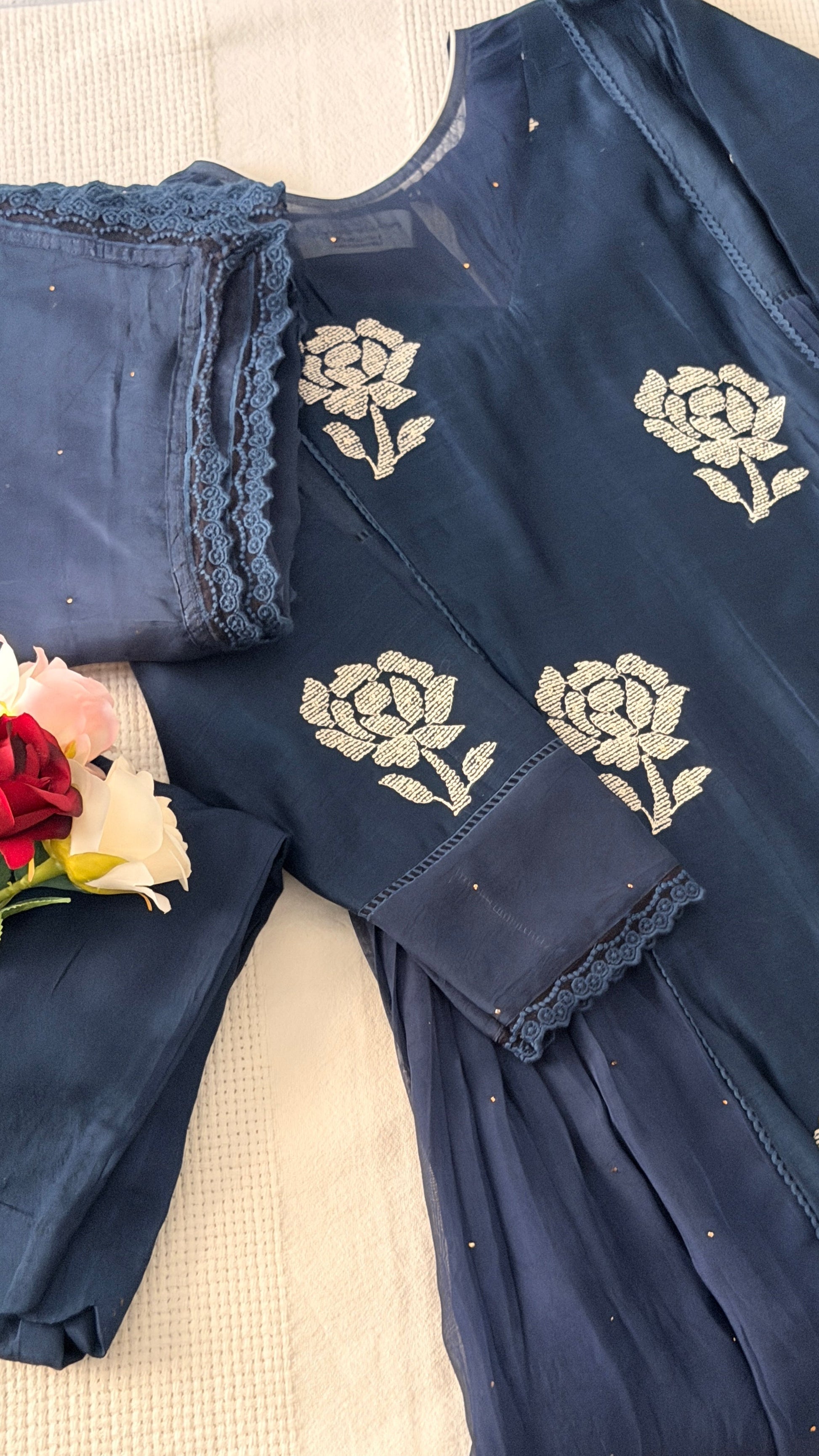 Done in the softest pure Chanderi, this set is truly a delight. Its intricate pattern is what makes it stand apart. It comes with a pair of cigarette/palazzo/straight pants and the prettiest organza Badla work dupatta, bordered with beautiful lace detailing.