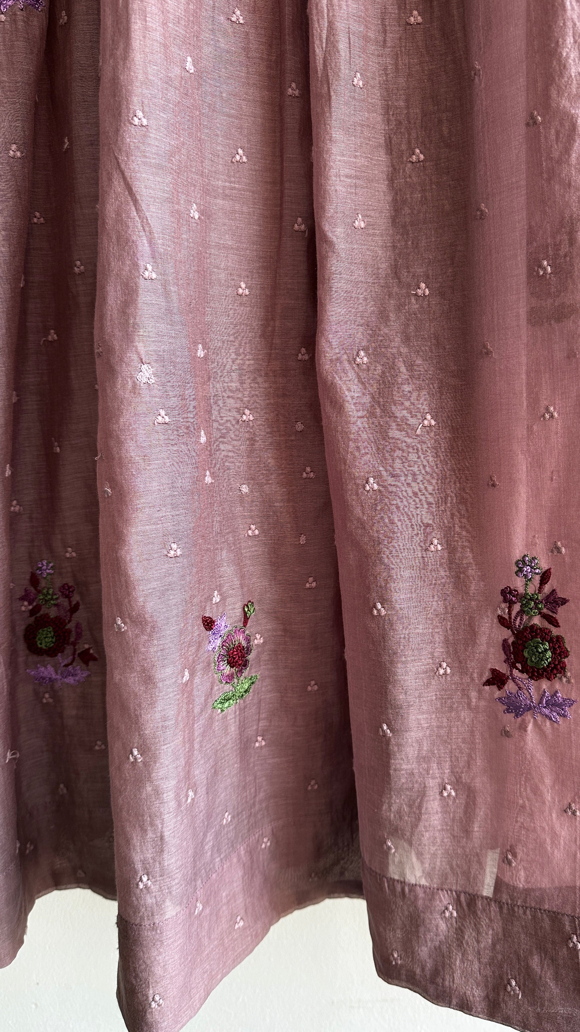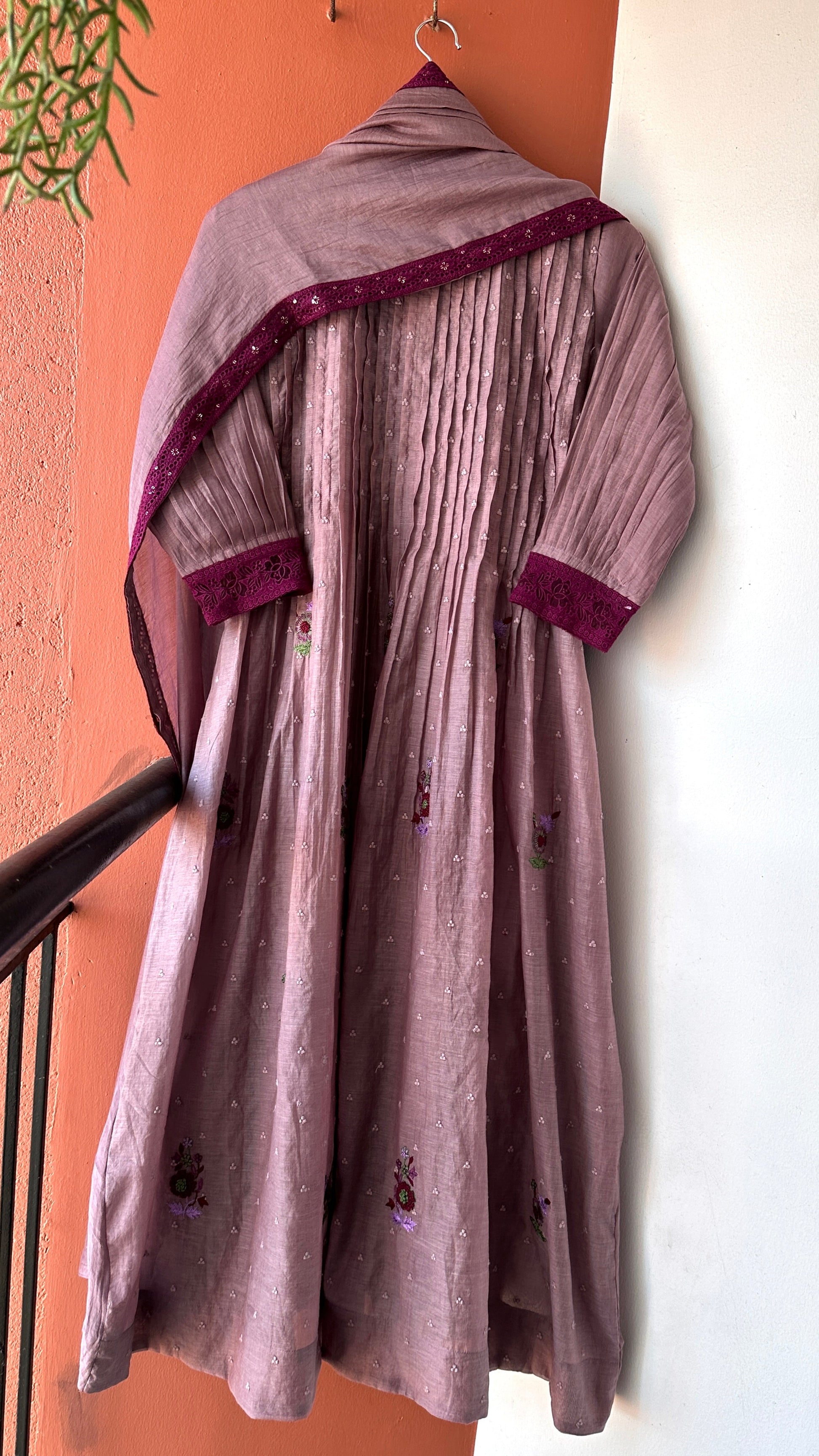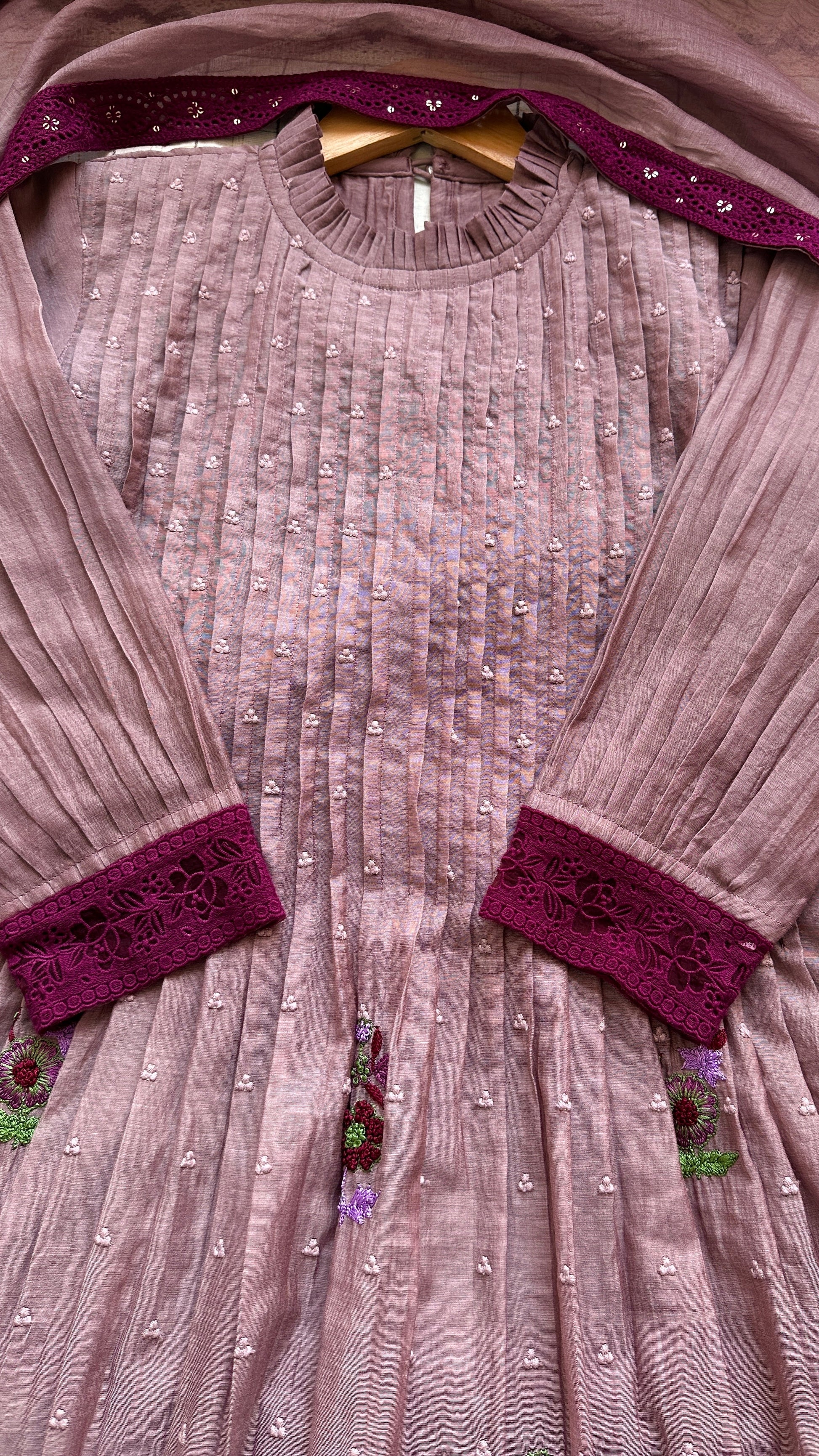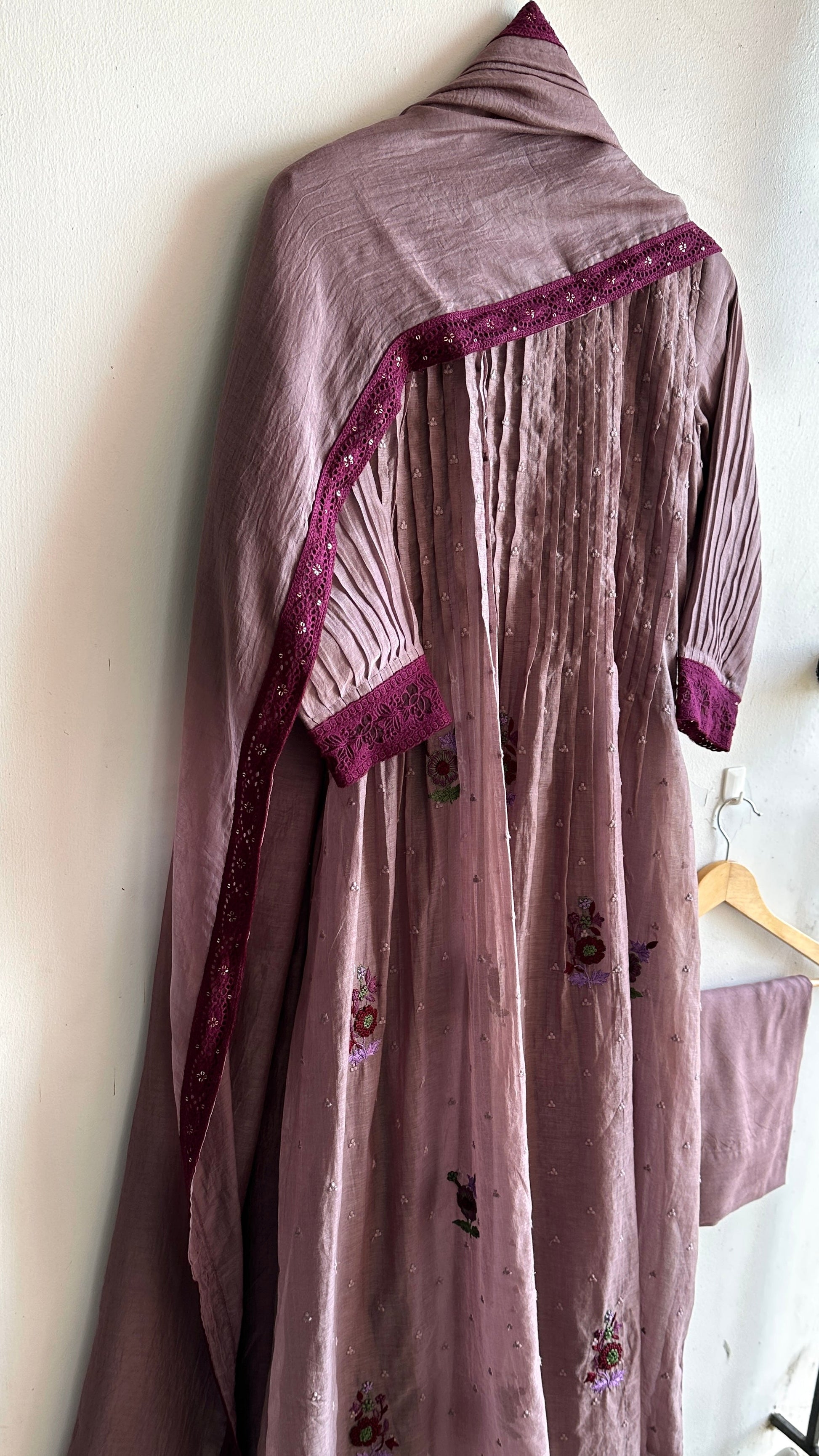 This beauty is done in Chanderi self-threaded fabric with delicate hand embroidery. It’s a 3-piece suit set featuring pintucks in the front, pleated sleeves finished with embroidered lace borders, and a dupatta highlighted with beautiful embroidery lace edges. Paired with soft shantoon pants, it’s a set that blends uniqueness with classy!
