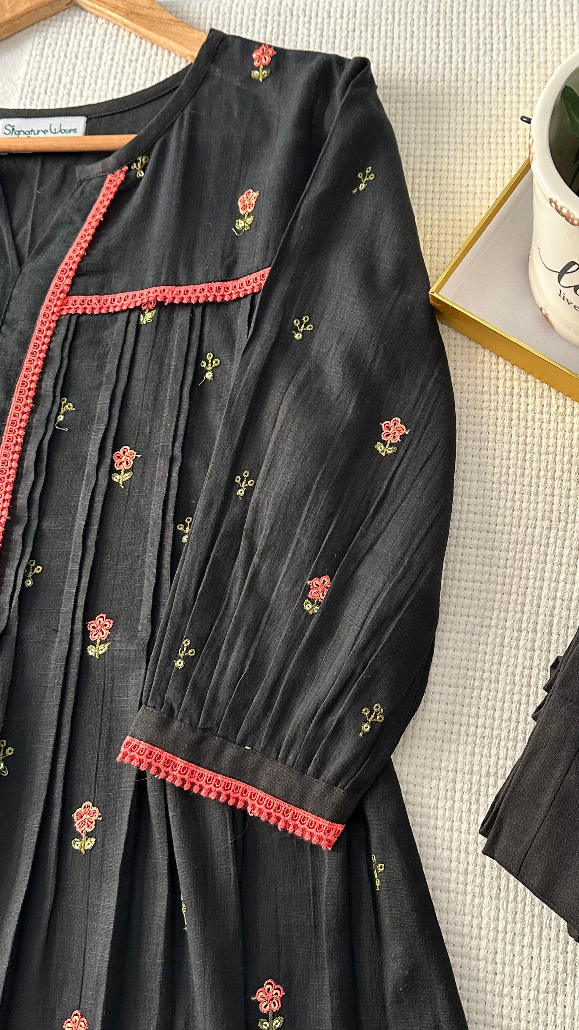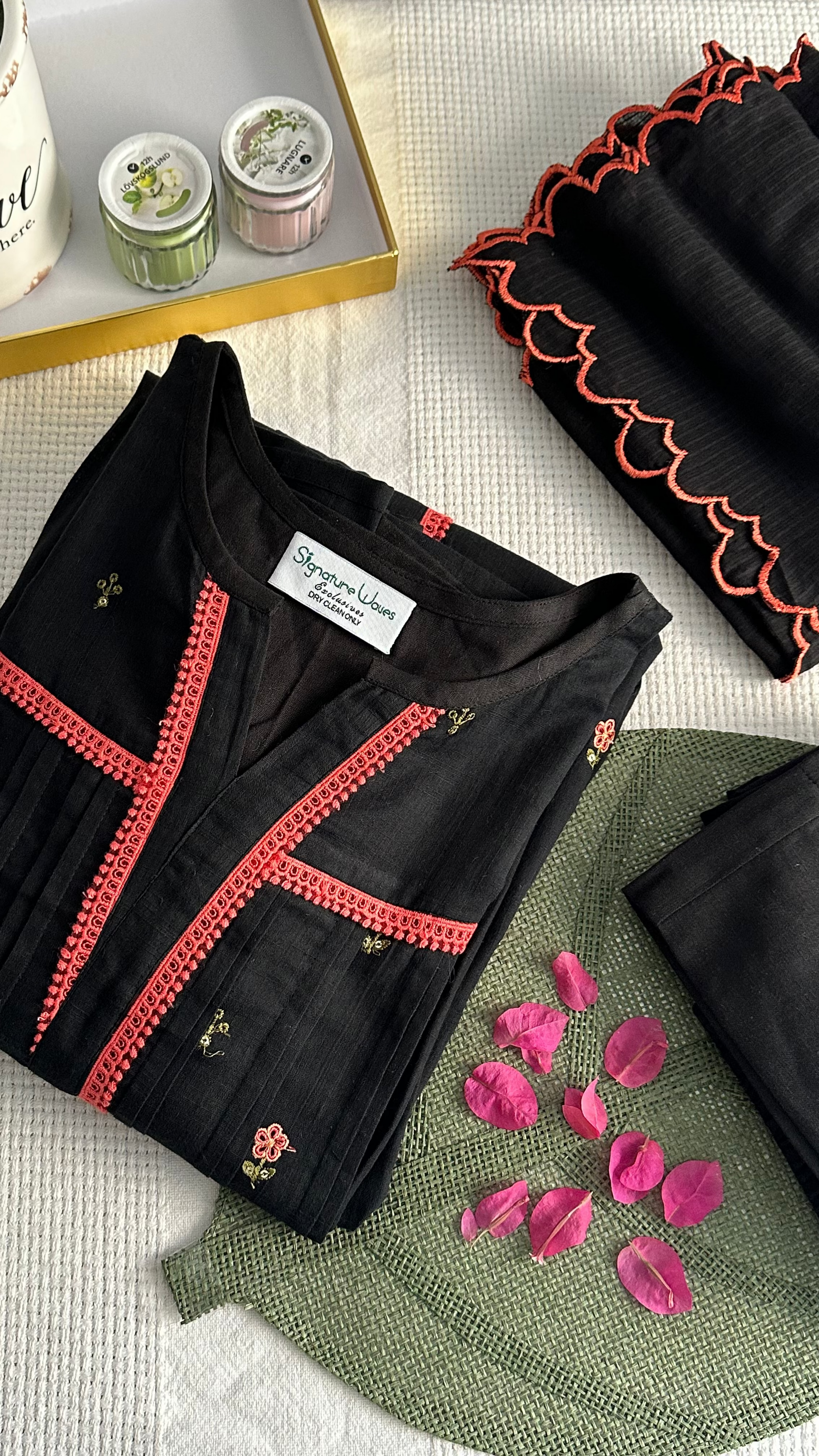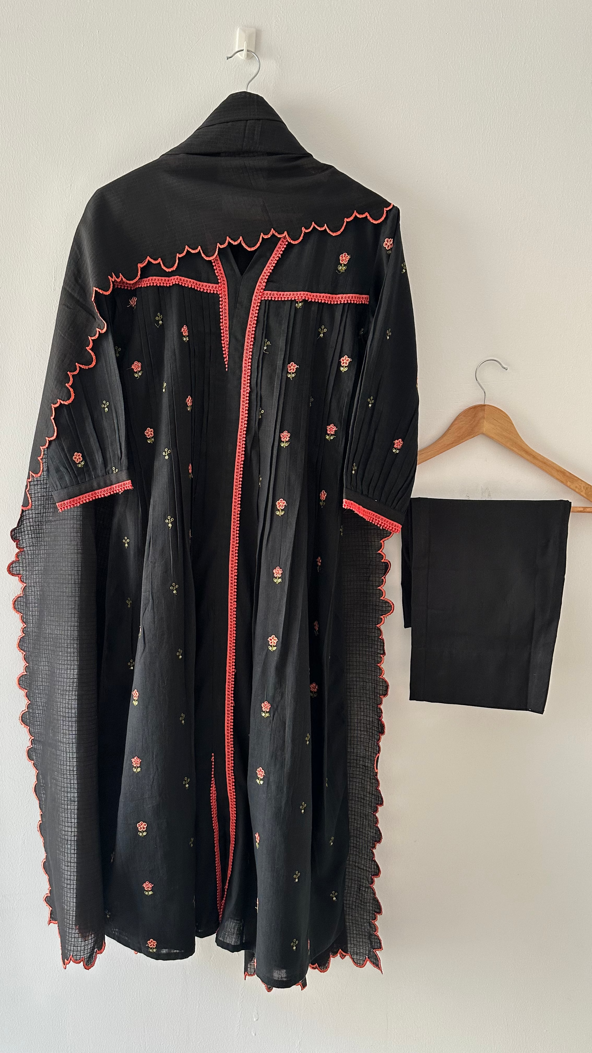 A pure cotton suit set detailed with beautiful thread embroidery, paired with a soft Kotta dupatta finished with scallop edges. A classic black piece highlighted with subtle coral tones — elegant yet easy to wear.