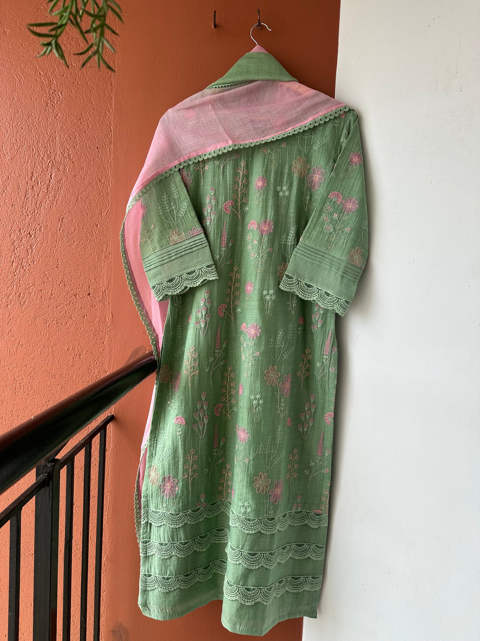 Every stitch on this set looks like it’s lifted straight out of a spring garden — soft stemwork, dainty florals, and that soothing pistachio green base holding it all together so effortlessly. The dupatta comes in a pink and green dip-dye shade, bordered with playful looped laces that feel almost nostalgic. Sleeves are finished with scallop lace and neat pleats — no overdoing, just the right touch of detailing.