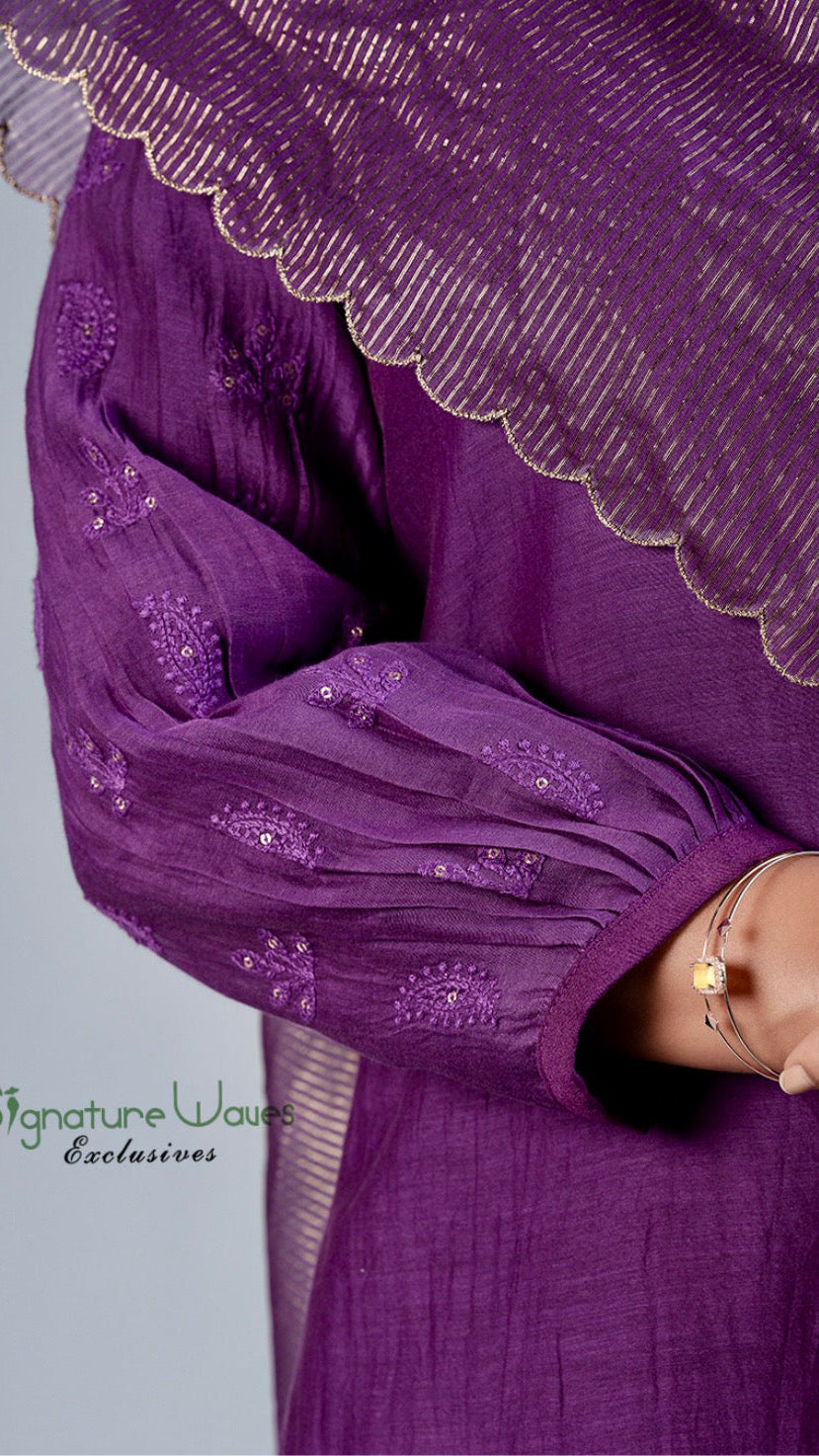 She walks with a quite grace, she embodies her beauty, effortlessly blending her style. Draped in the regal hue of jamun purple, this ensemble celebrates sophistication and craft. From the delicate zari-weaved dupatta with hand-worked scallops to the pleated sleeves, every detail in this Chanderi fabric Kurti whispers elegance. Embrace the allure of tradition, redefined.