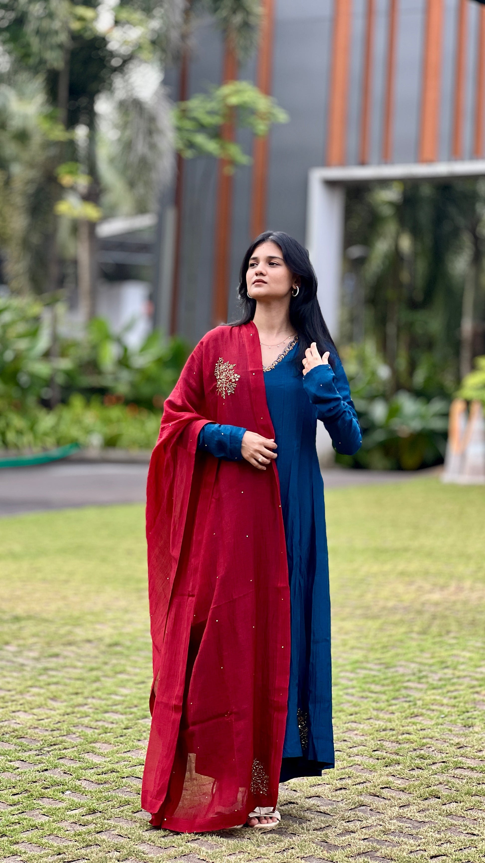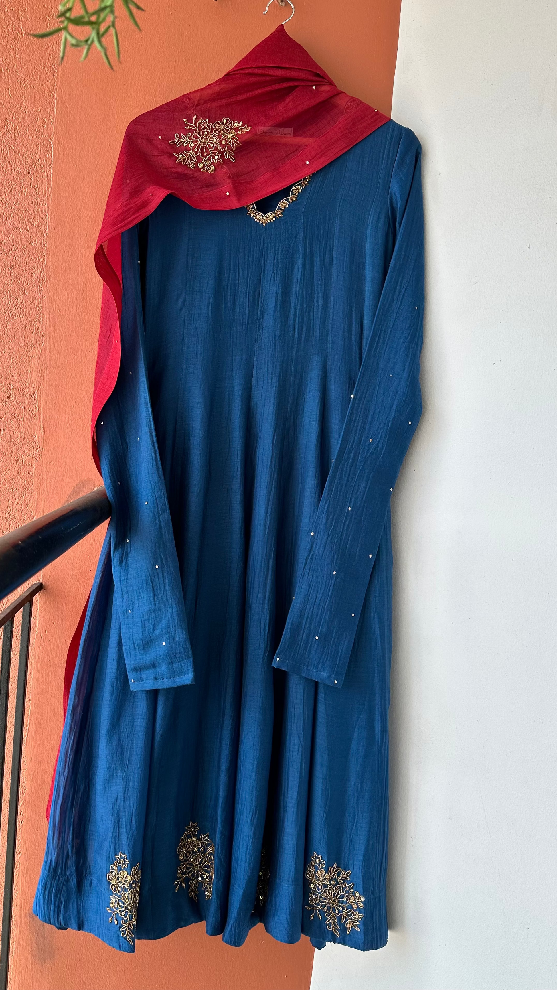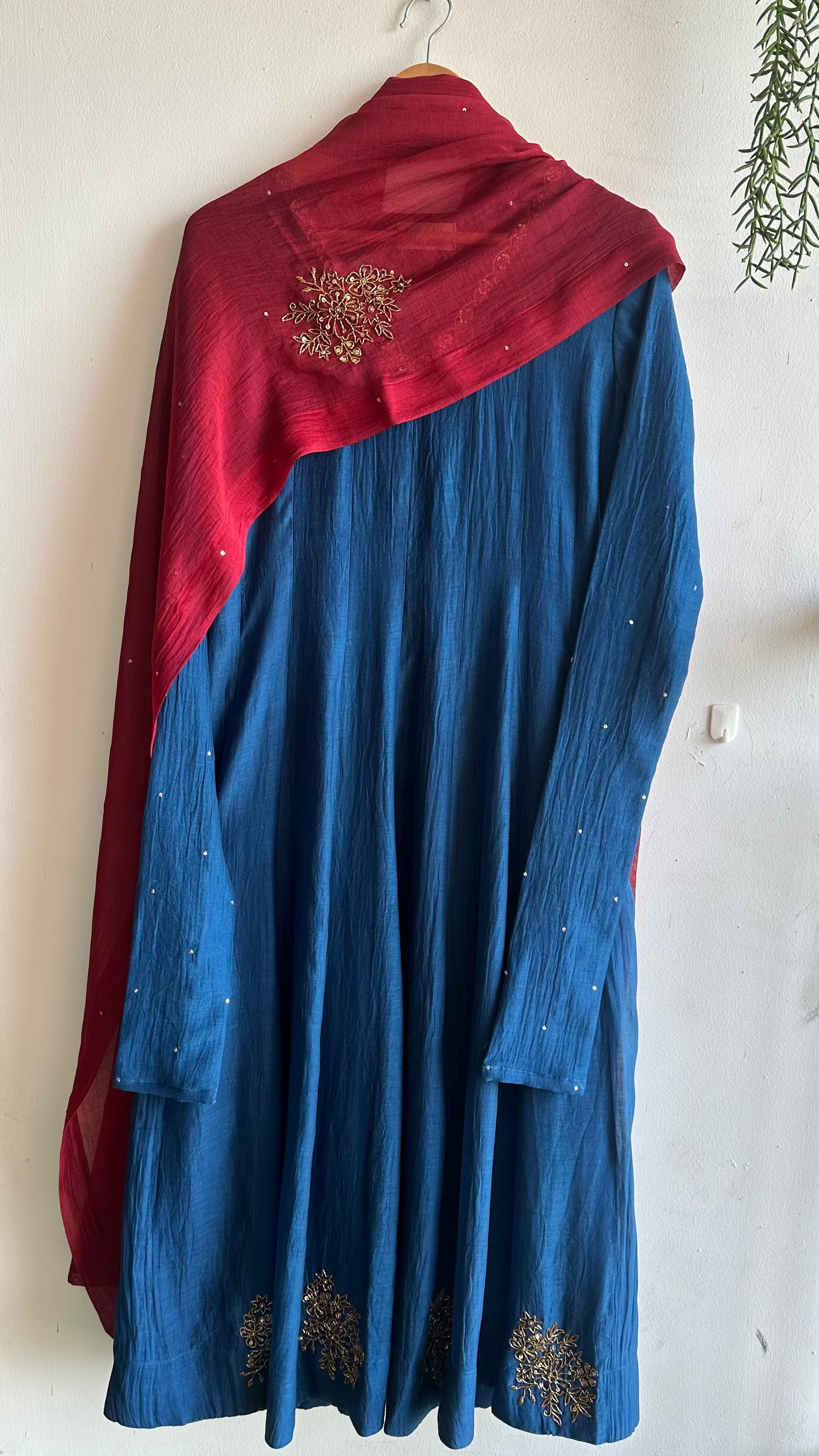 A 3-piece Chanderi panel-cut Anarkali suit set, paired with palazzo pants. The long gathered Churi sleeves are delicately sprinkled with tiny sequins, adding just the right amount of festive shimmer. The hemline and dupatta feature intricate handwork, making every detail worth a closer look.