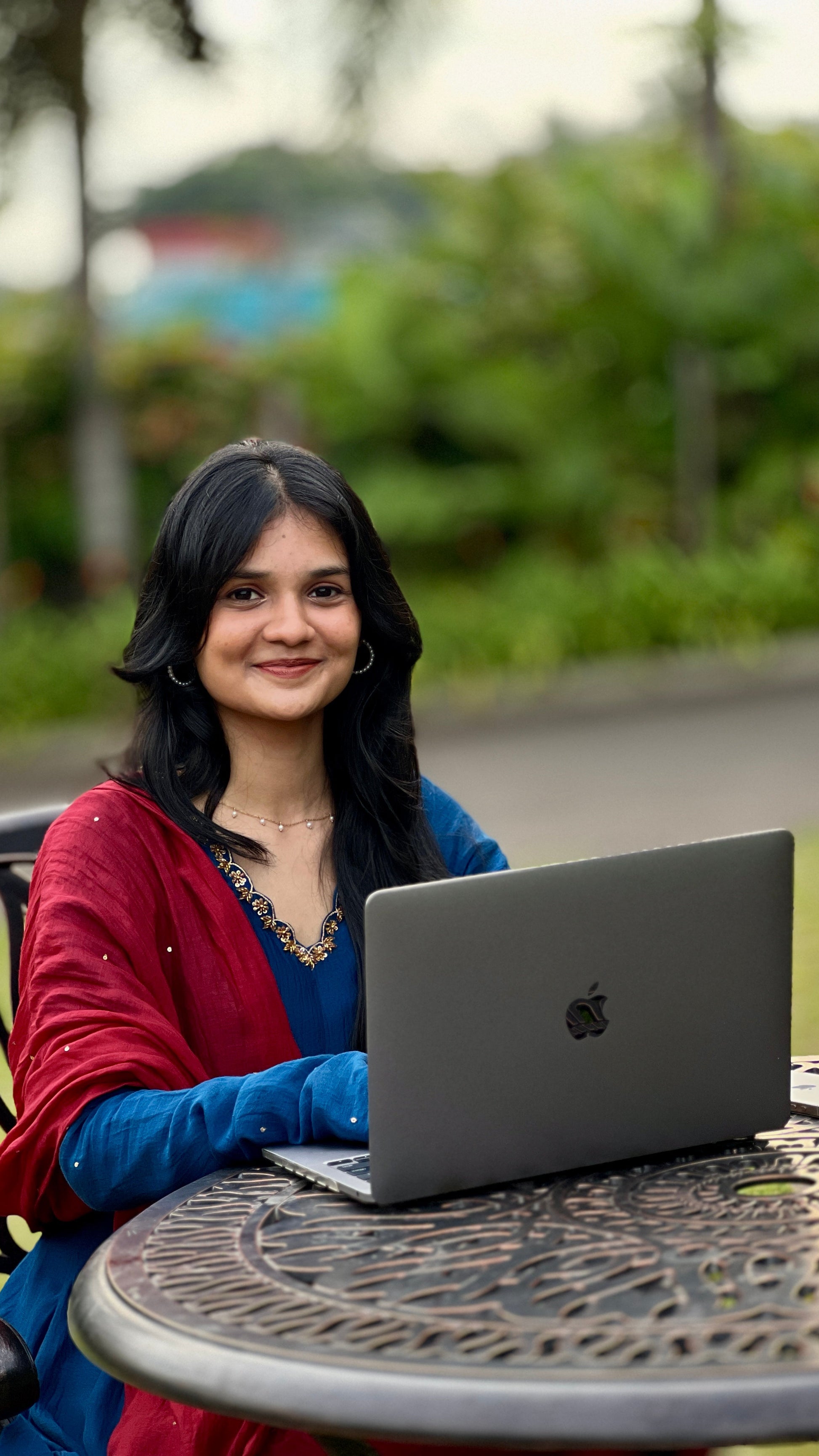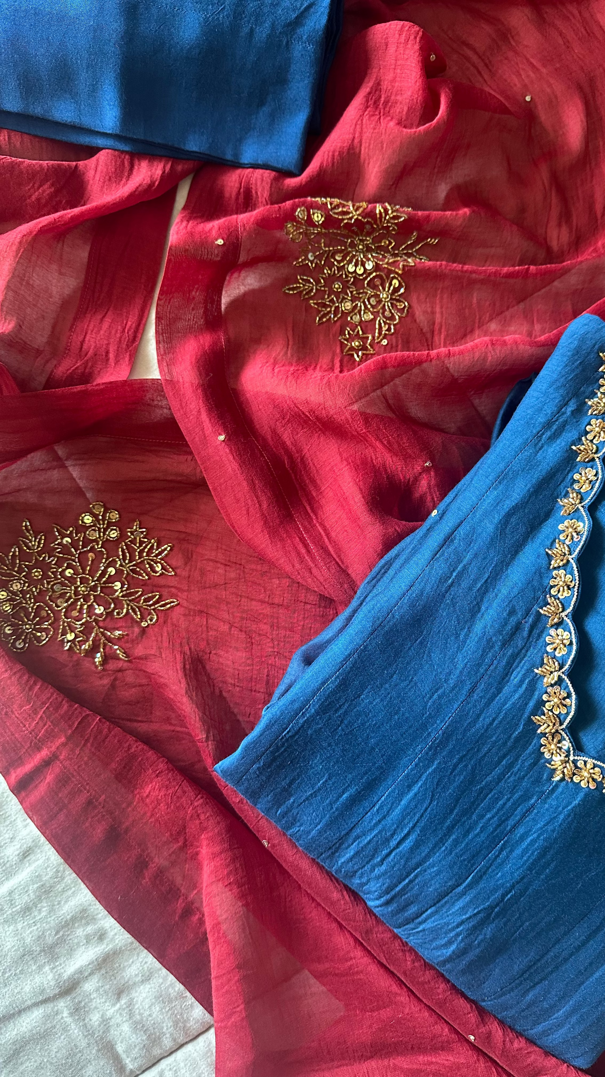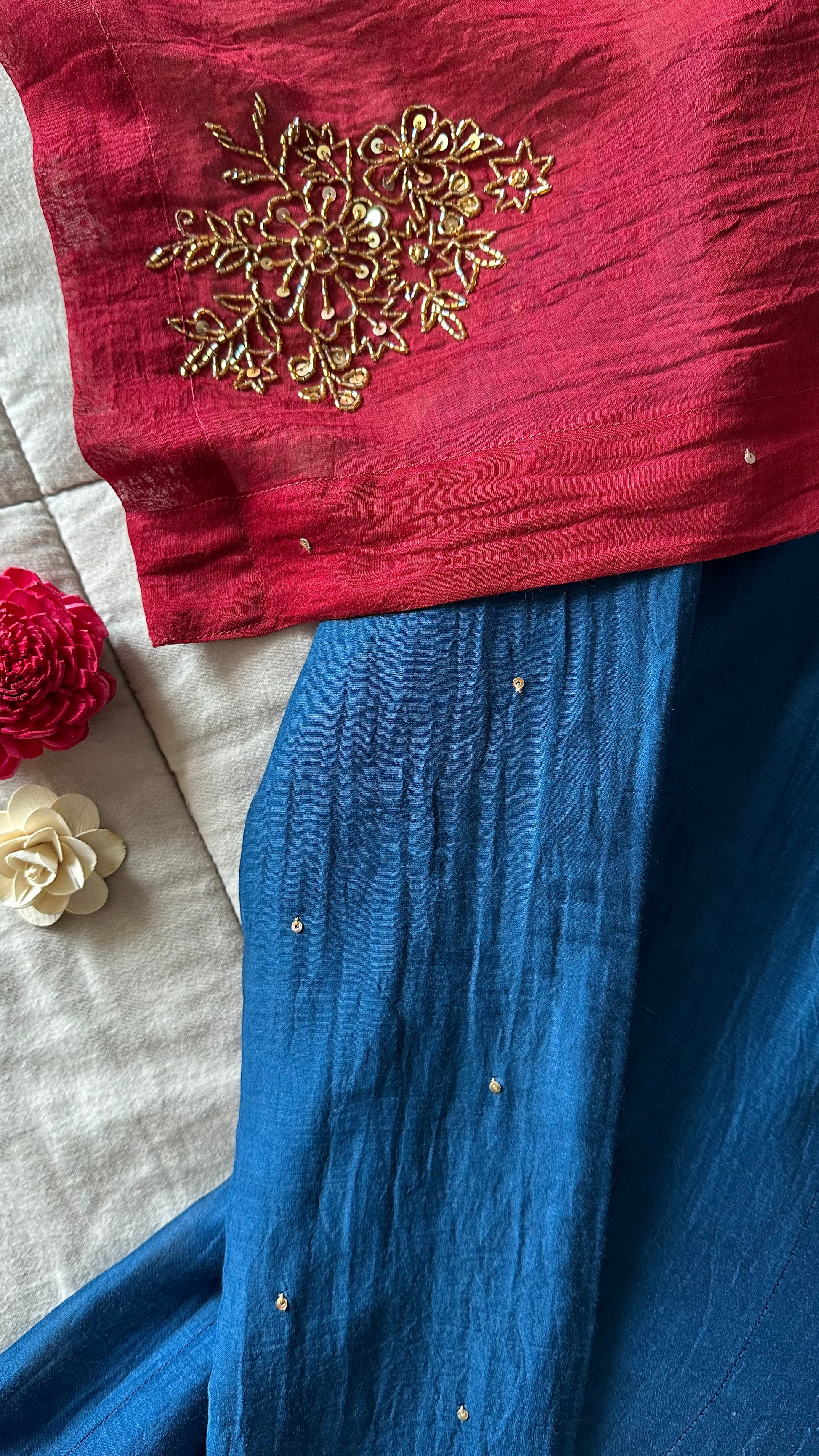 A 3-piece Chanderi panel-cut Anarkali suit set, paired with palazzo pants. The long gathered Churi sleeves are delicately sprinkled with tiny sequins, adding just the right amount of festive shimmer. The hemline and dupatta feature intricate handwork, making every detail worth a closer look.