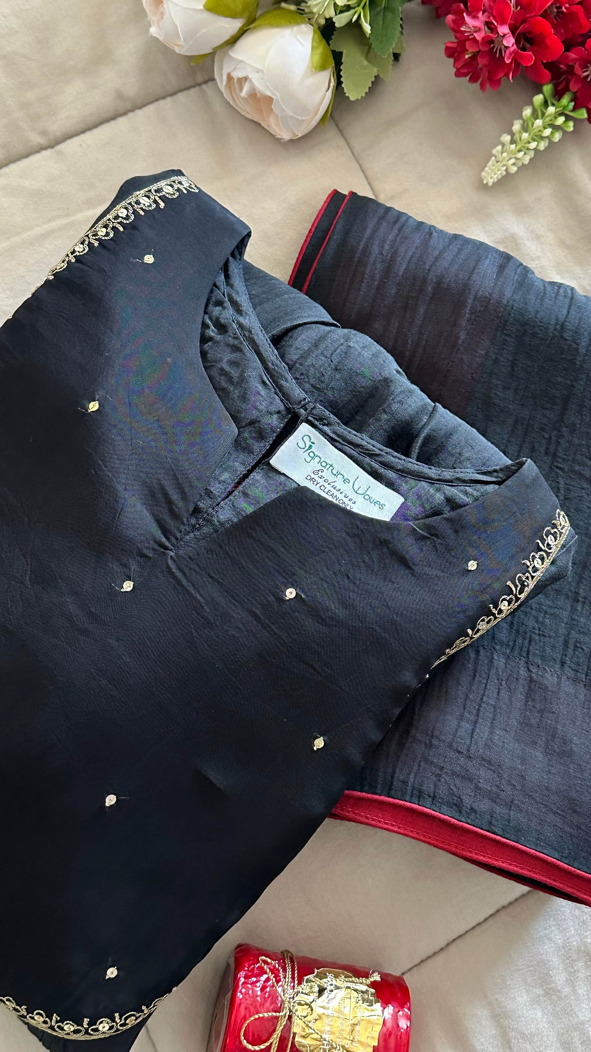 This stunning three-piece suit set in pure Chanderi fabric beautifully blends black and deep red.The handwork detailing on the yoke and sleeve edges adds just the right hint of shimmer, while the contrast red finishing elevates its charm. Paired with matching pants and a Chanderi dupatta featuring 4-side piping with finishing borders, this set is a timeless addition to any festive or evening wardrobe.