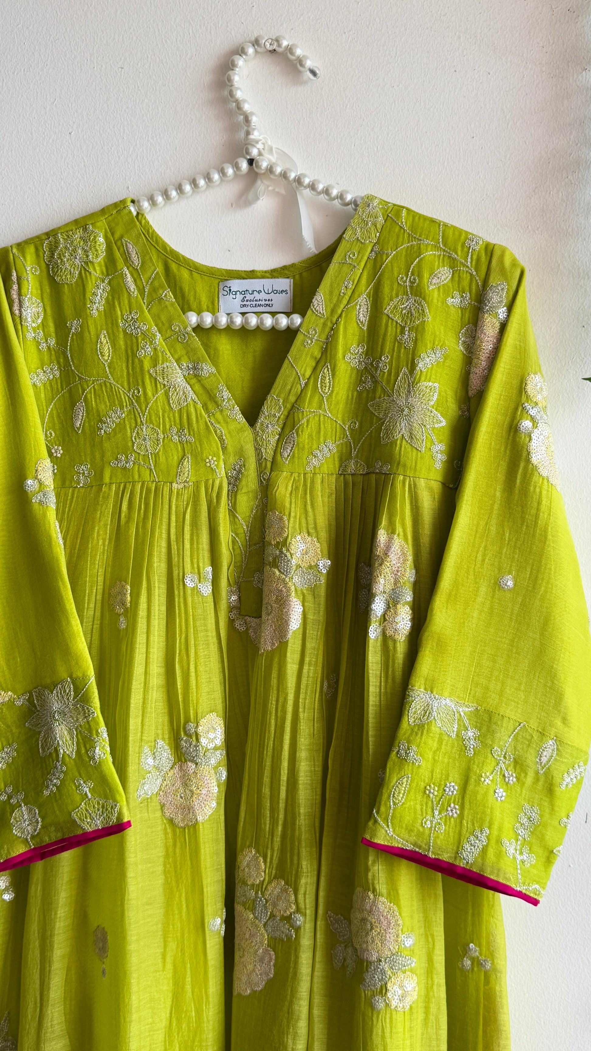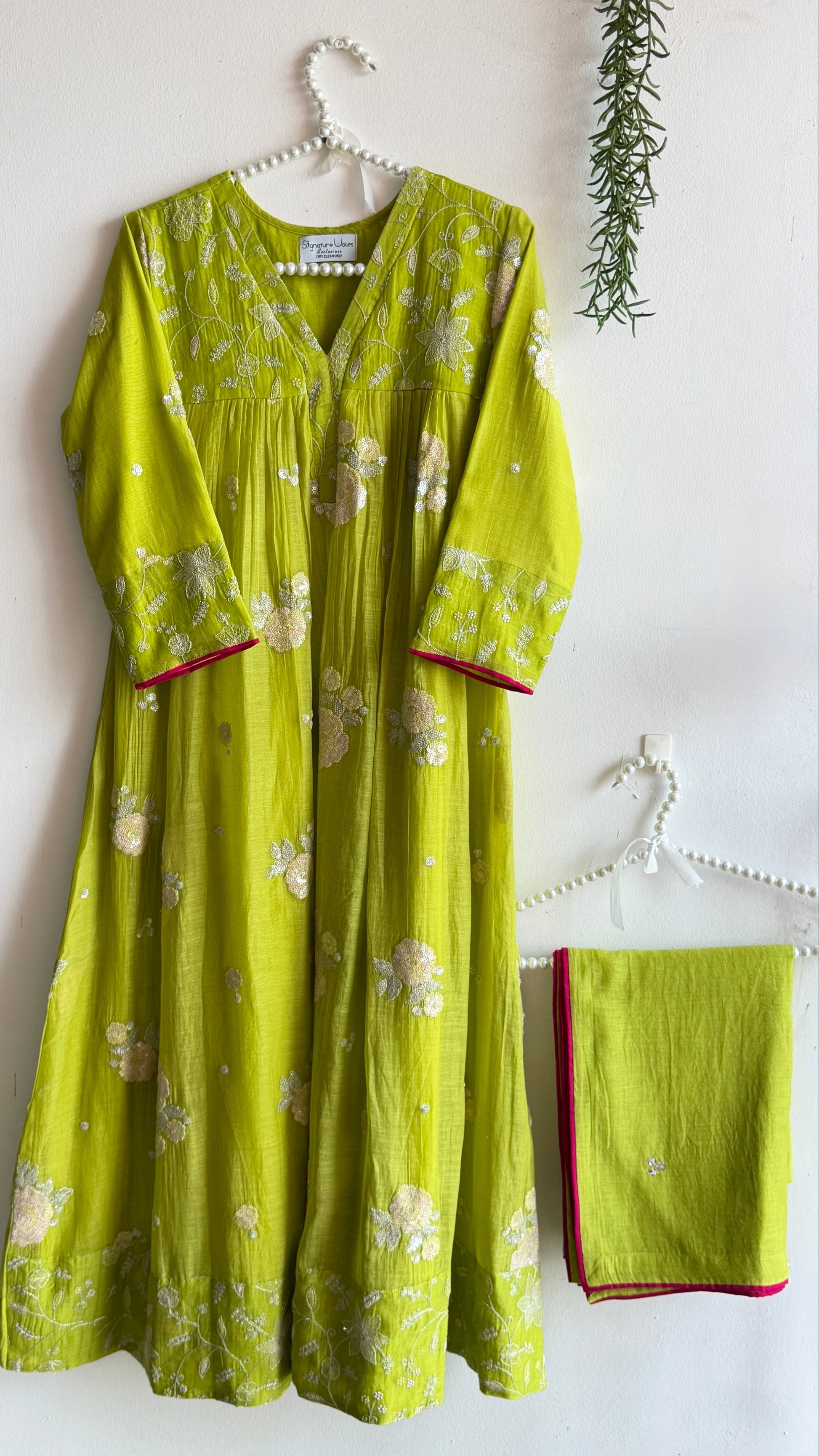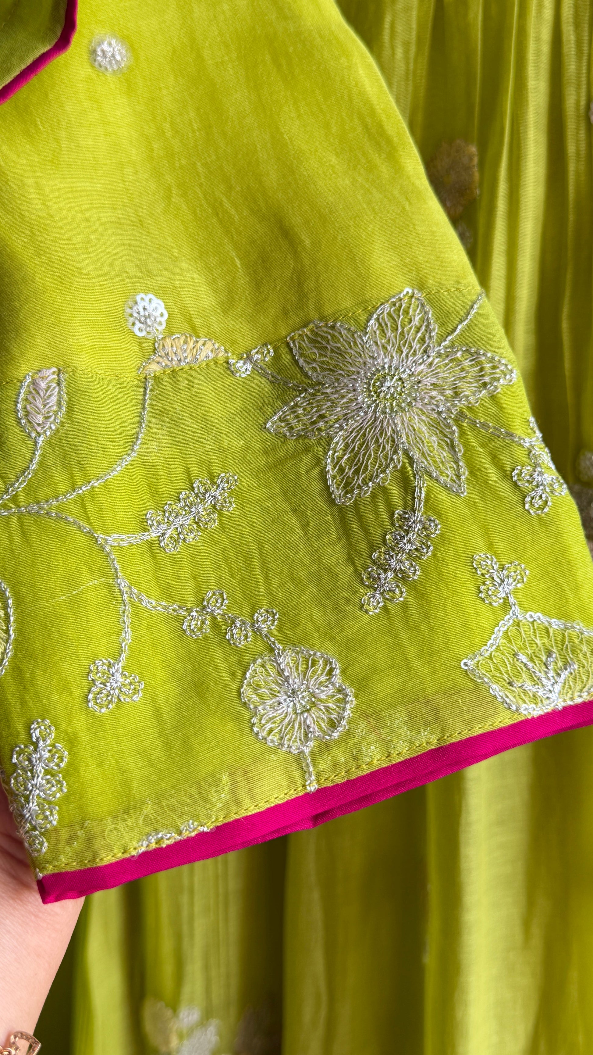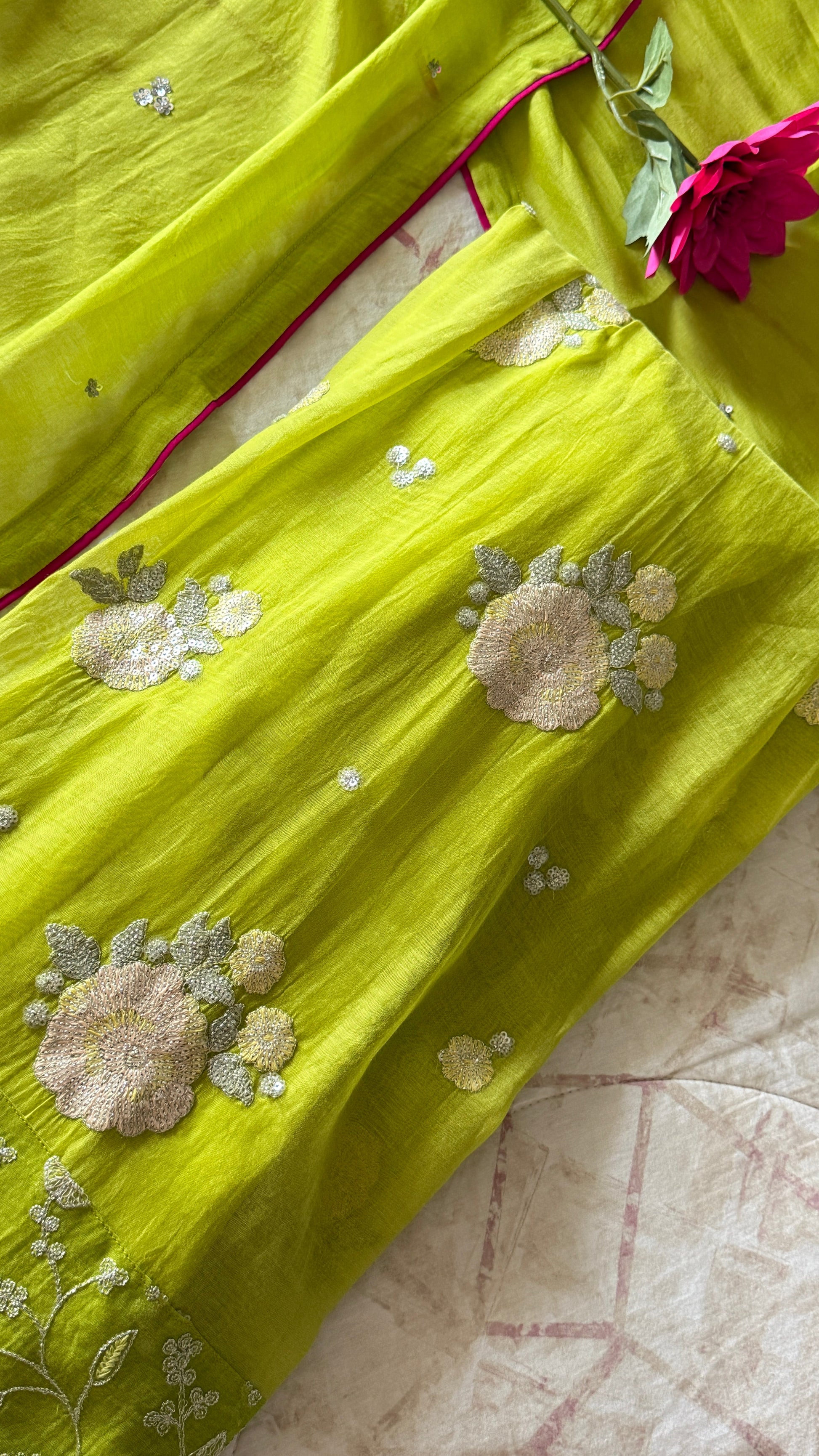 It’s a pure mul Chanderi 3 piece suit set with intricate silver based embroidery delicately accented with hints of pink, yellow, and silver that shimmer softly against the fabric. Yolk, sleeves and hemline having a different embroidery spread across beautifully. Paired with a santoon pants and a Chanderi dupatta with handicrafted silver floral flowers along with hot pink piping detailing.