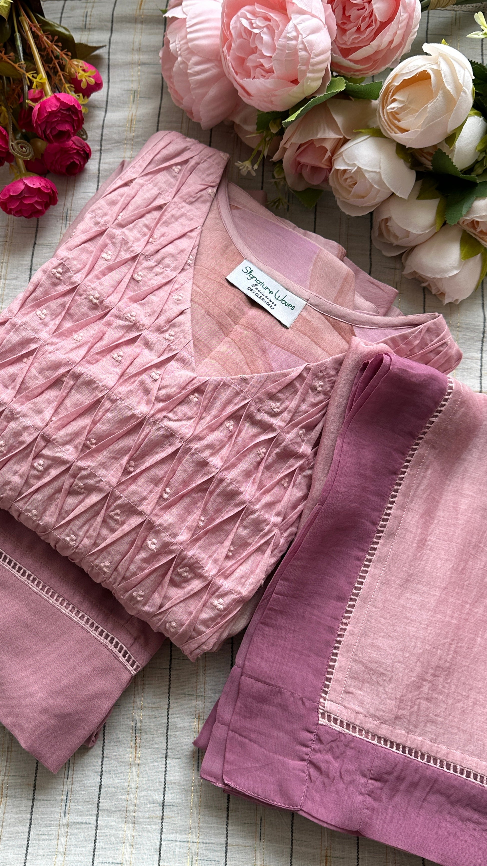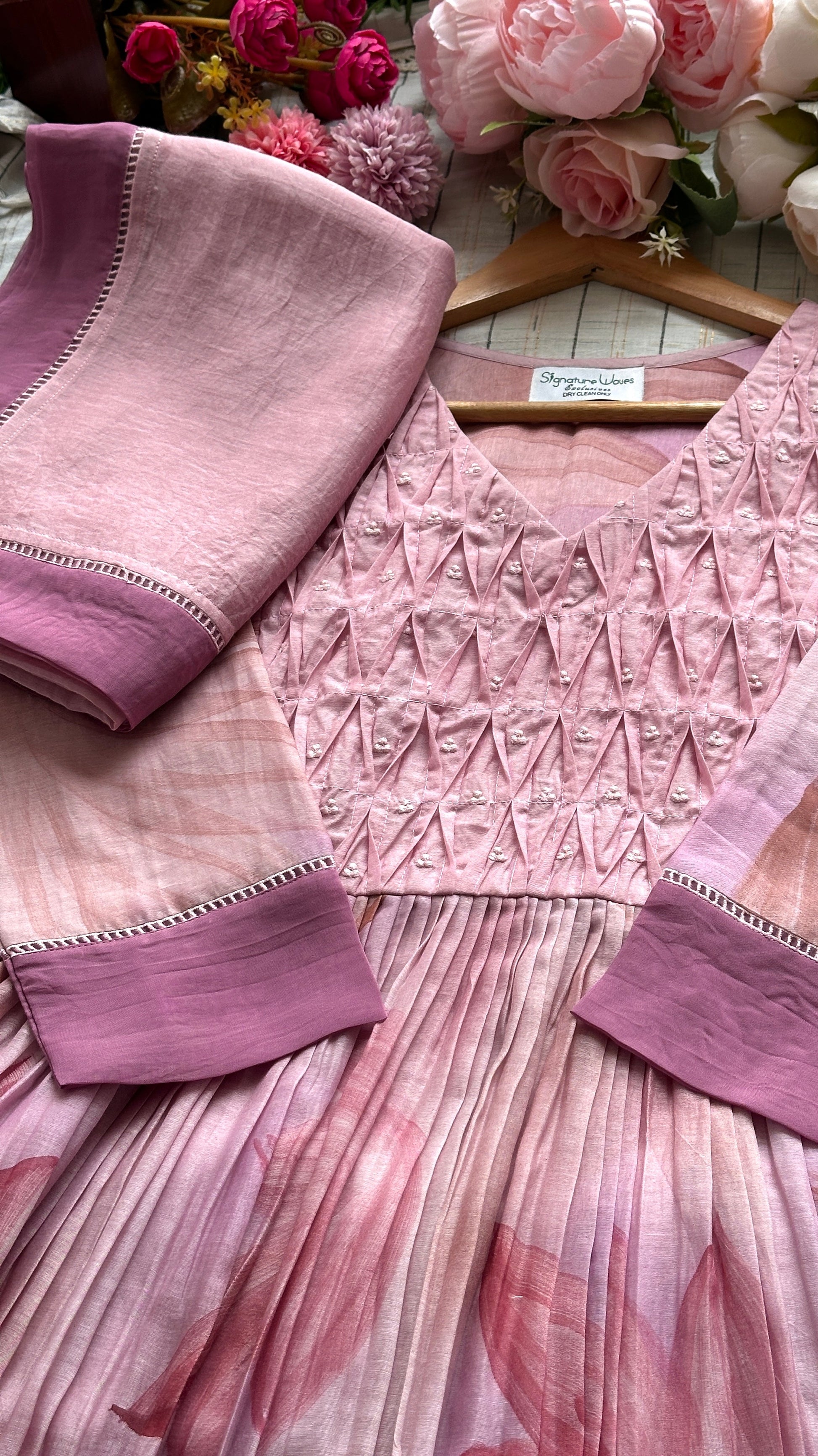 The kurti is designed with delicate brush-painted strokes, each hand-done directly on the fabric, making every piece unique and personal. Smocking on the yoke adds definition, while the pleats fall naturally to give a soft, flowy shape.