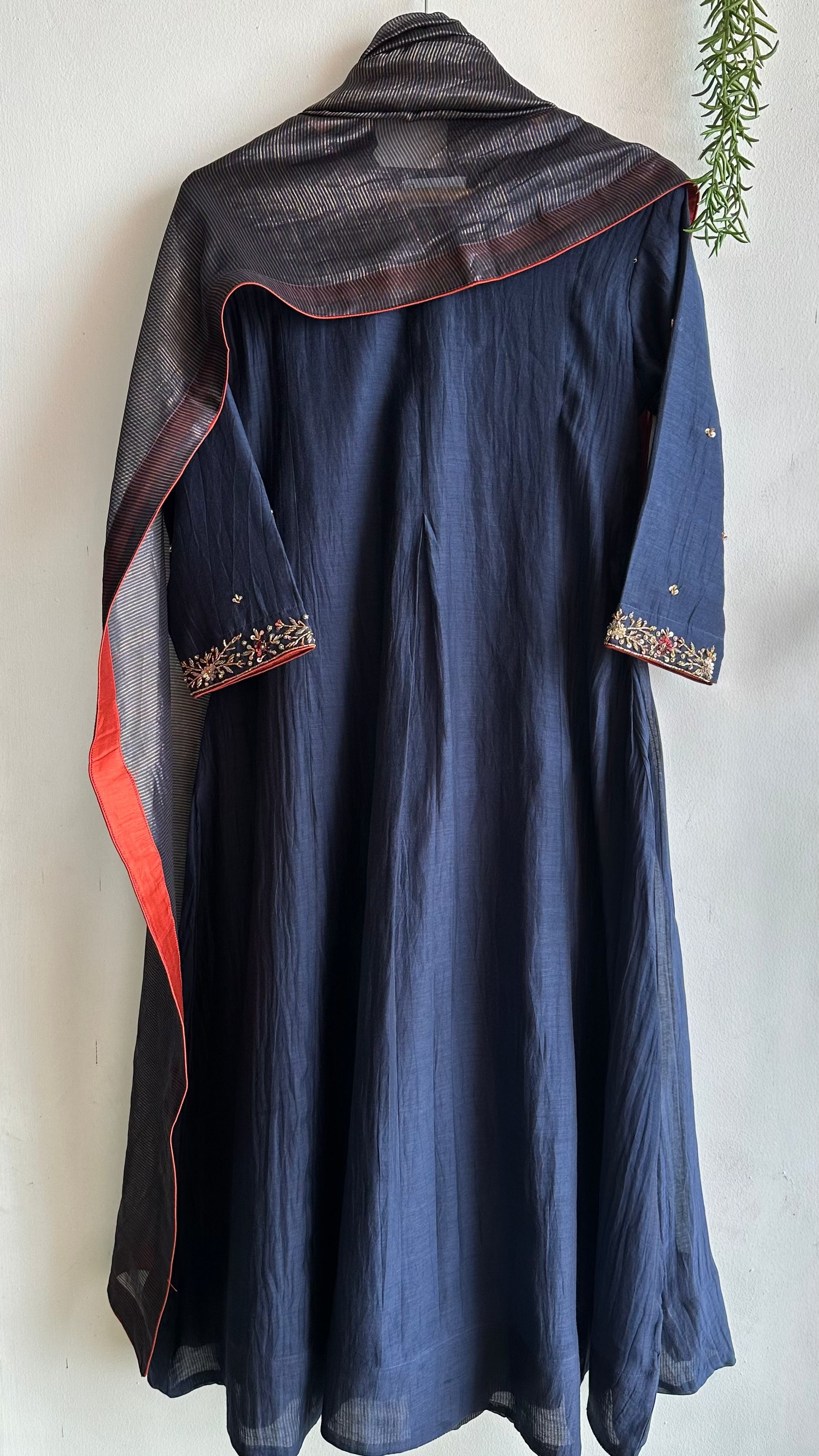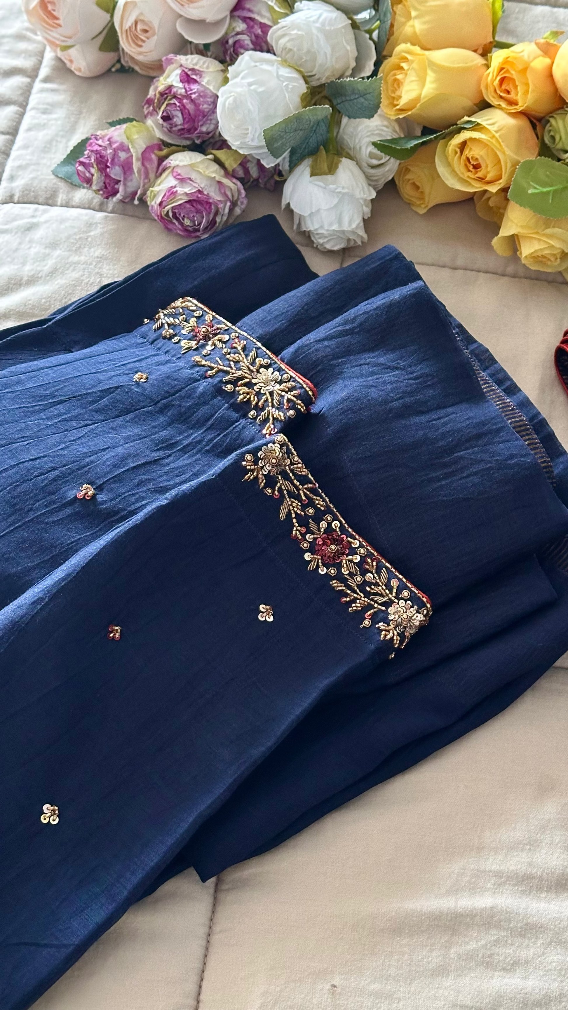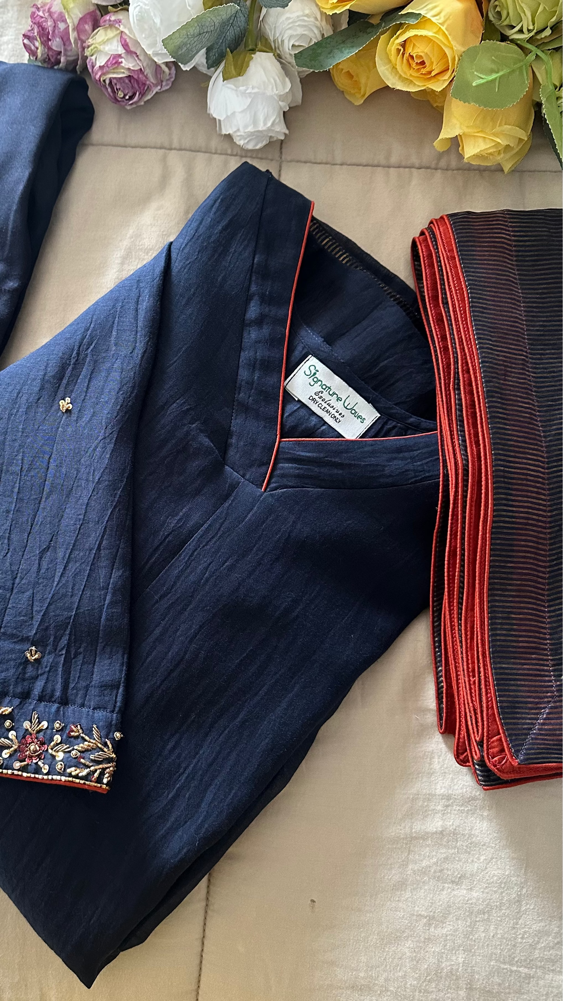 An evergreen shade that speaks of graceful beauty. This three-piece suit set is crafted in a deep navy blue tone with a subtle sheen. The neckline is highlighted with fine burnt orange color piping, while delicate hand embroidery adds a charm to the sleeves. The zari-weaved Chanderi striped dupatta adds a hint of festive shine, perfectly complementing the look. Styled here with a skirt palazzo for a flowy finish (but can be customized to your preference), this set is designed to be both stylish and versatile.