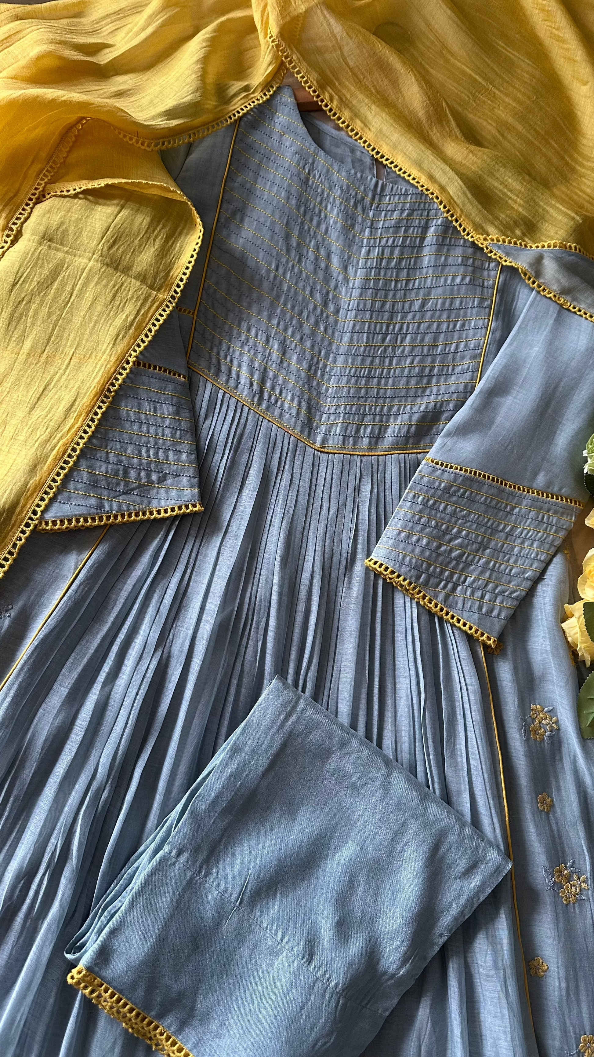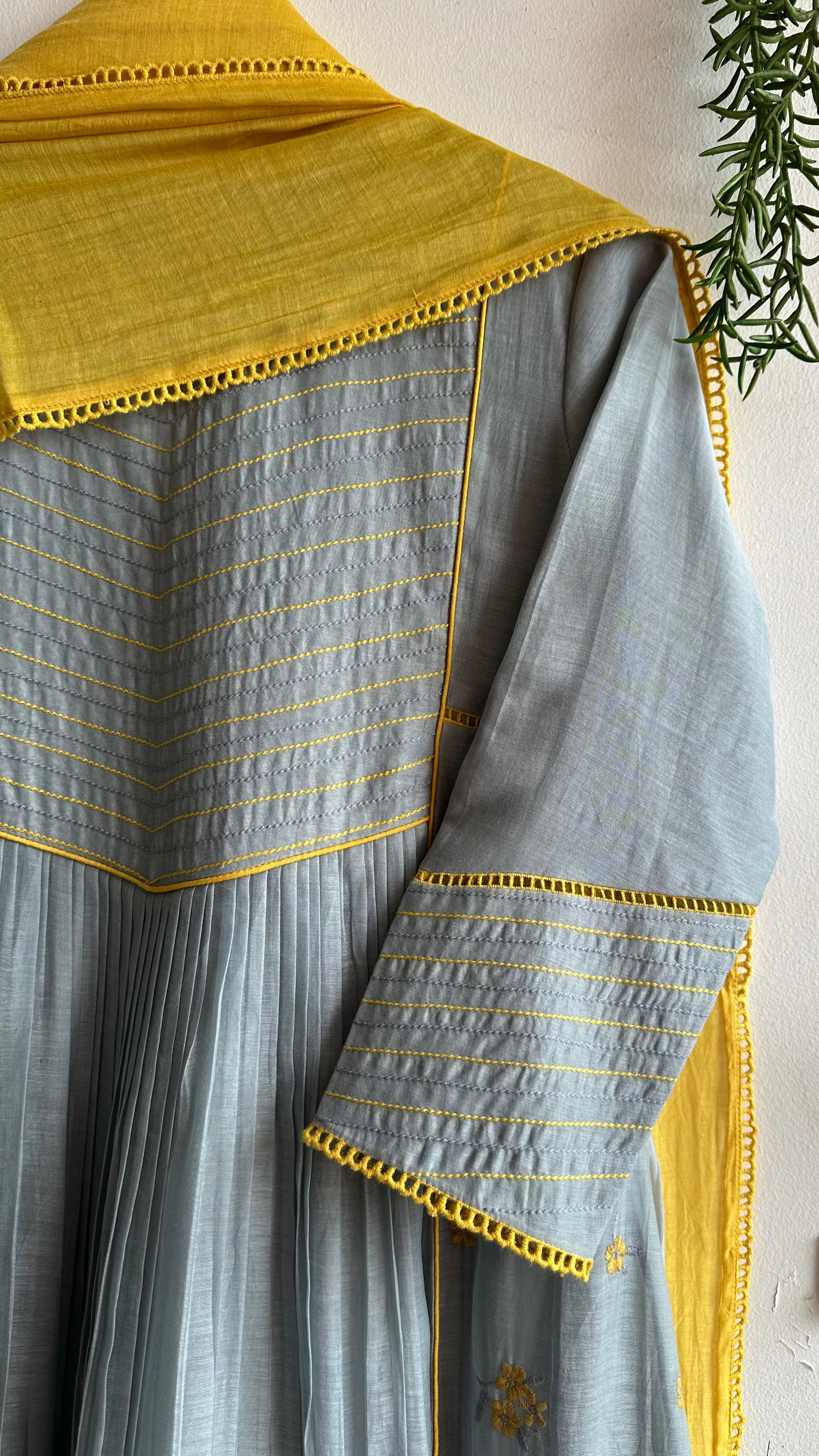 Here’s to blending heritage with modernity. This one is so soothing- that powdery grey-blue base paired with a mellow yellow dupatta is such a refreshing and calm combination.