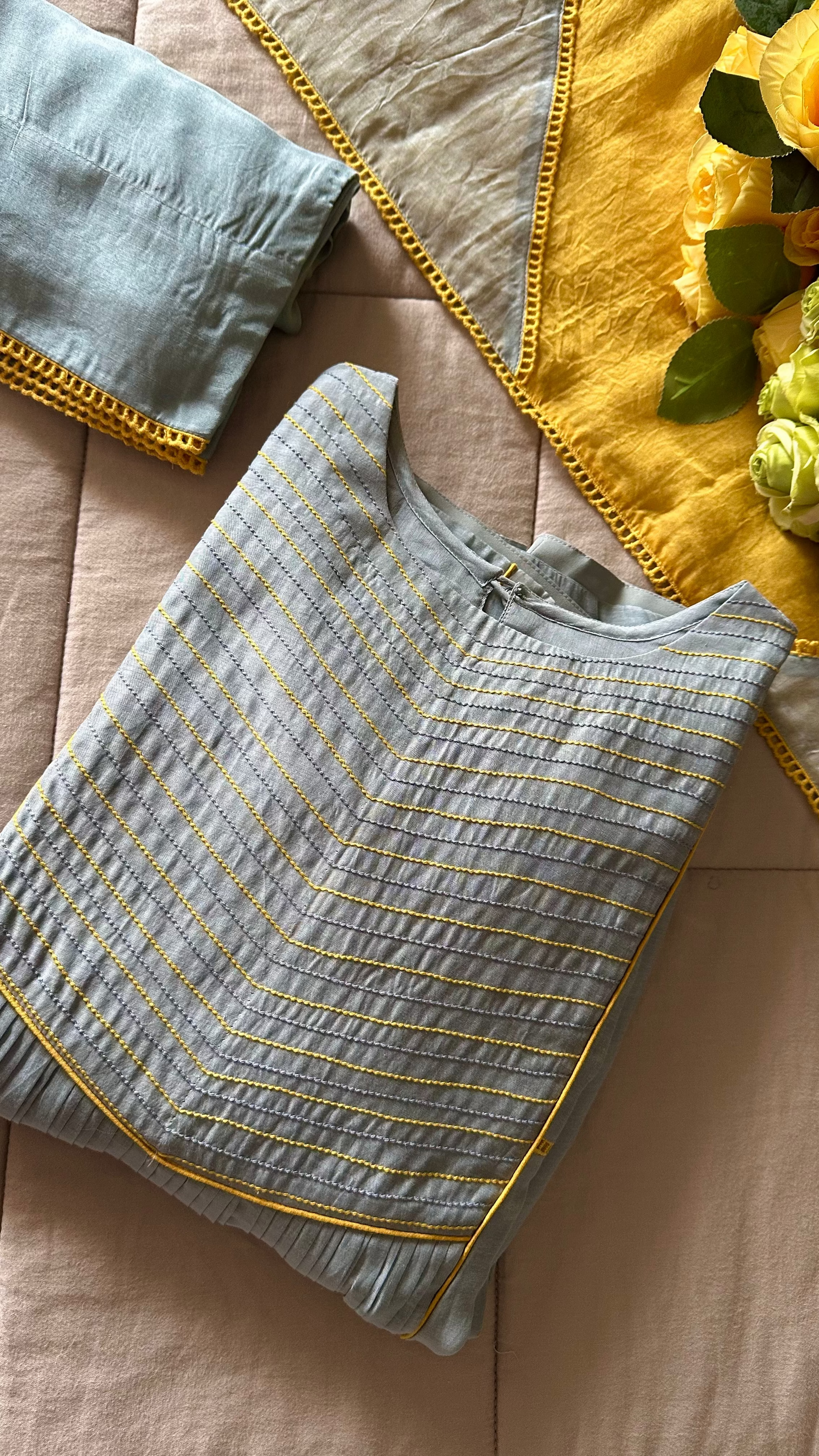 Done in pure Chanderi and delicately done embroidery and running stiches is truly evokes the beauty of moonlight. Along with a shantoon pants and a yellow Chanderi dupatta with contrast triangle shaped patches and lace detailing.