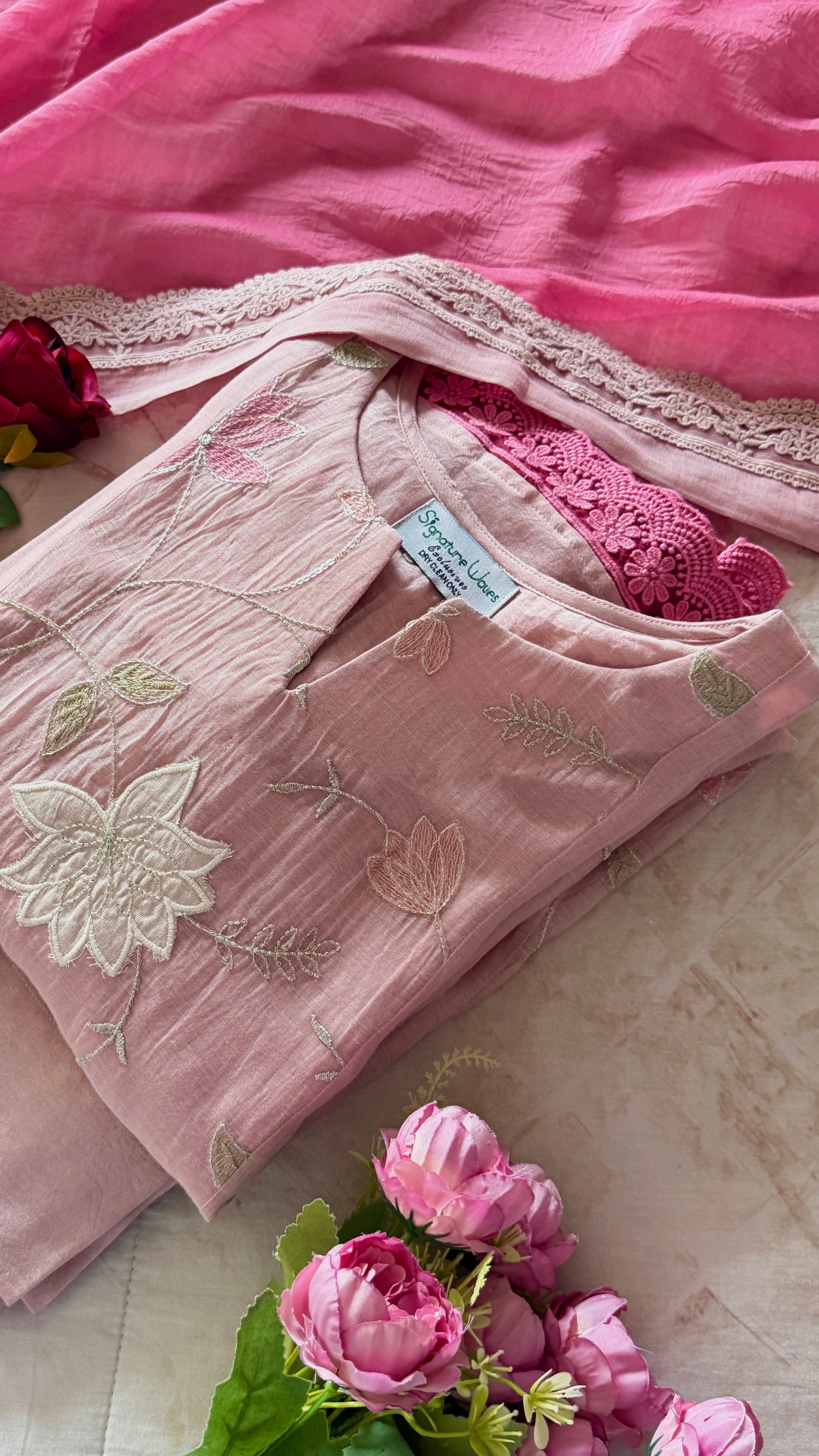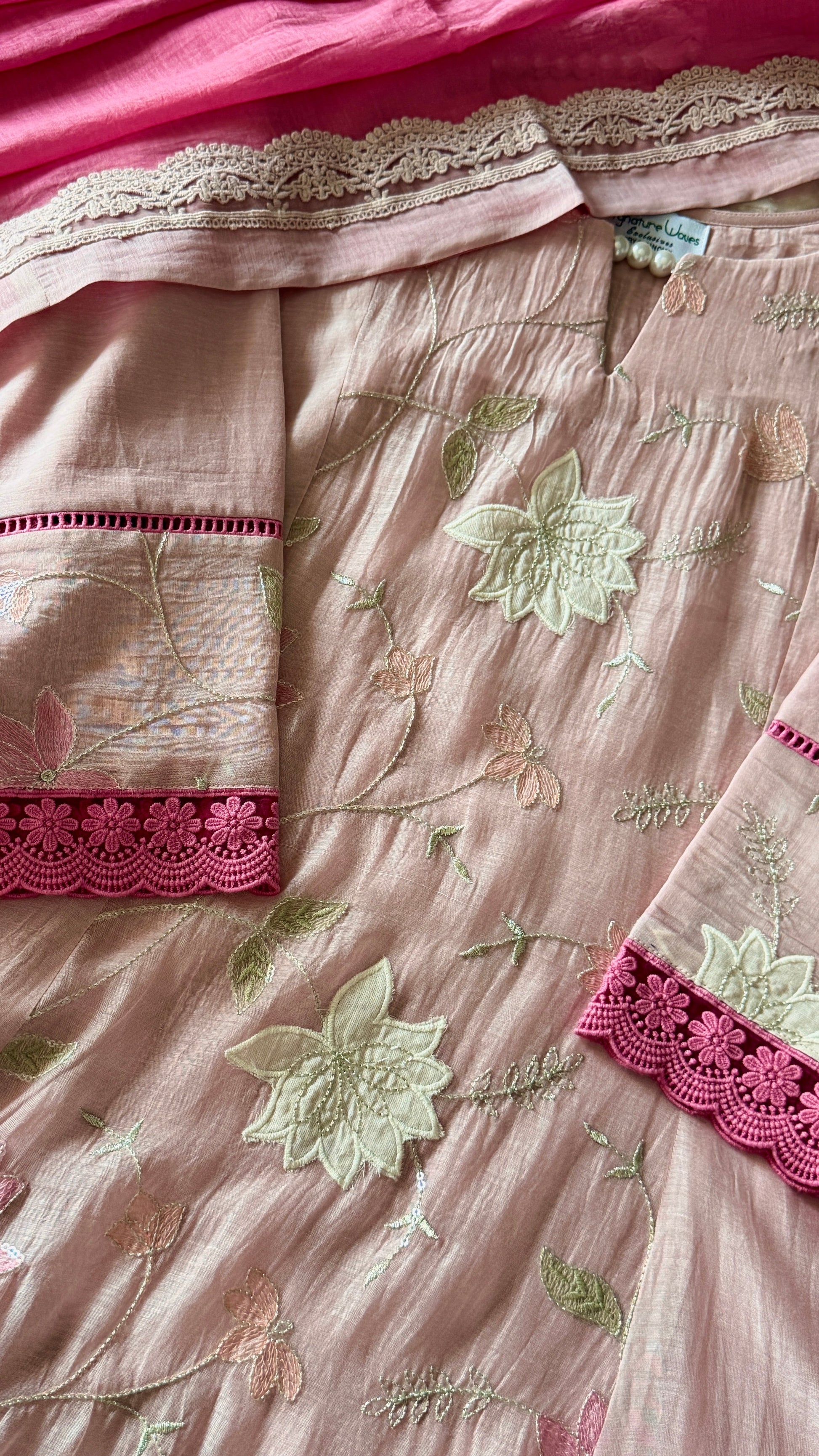 Crafted in pure Chanderi fabric and adorned with delicate embroidery and appliqué work flowing across the bodice and panels, this piece carries a gentle romantic charm. Warm blush tones, deeper pink accents, and pastel thread details come together to create a look that feels graceful and refined. The lace bordered dupatta, and the border has a lighter tone reveals a soft sheen as it moves and sways.