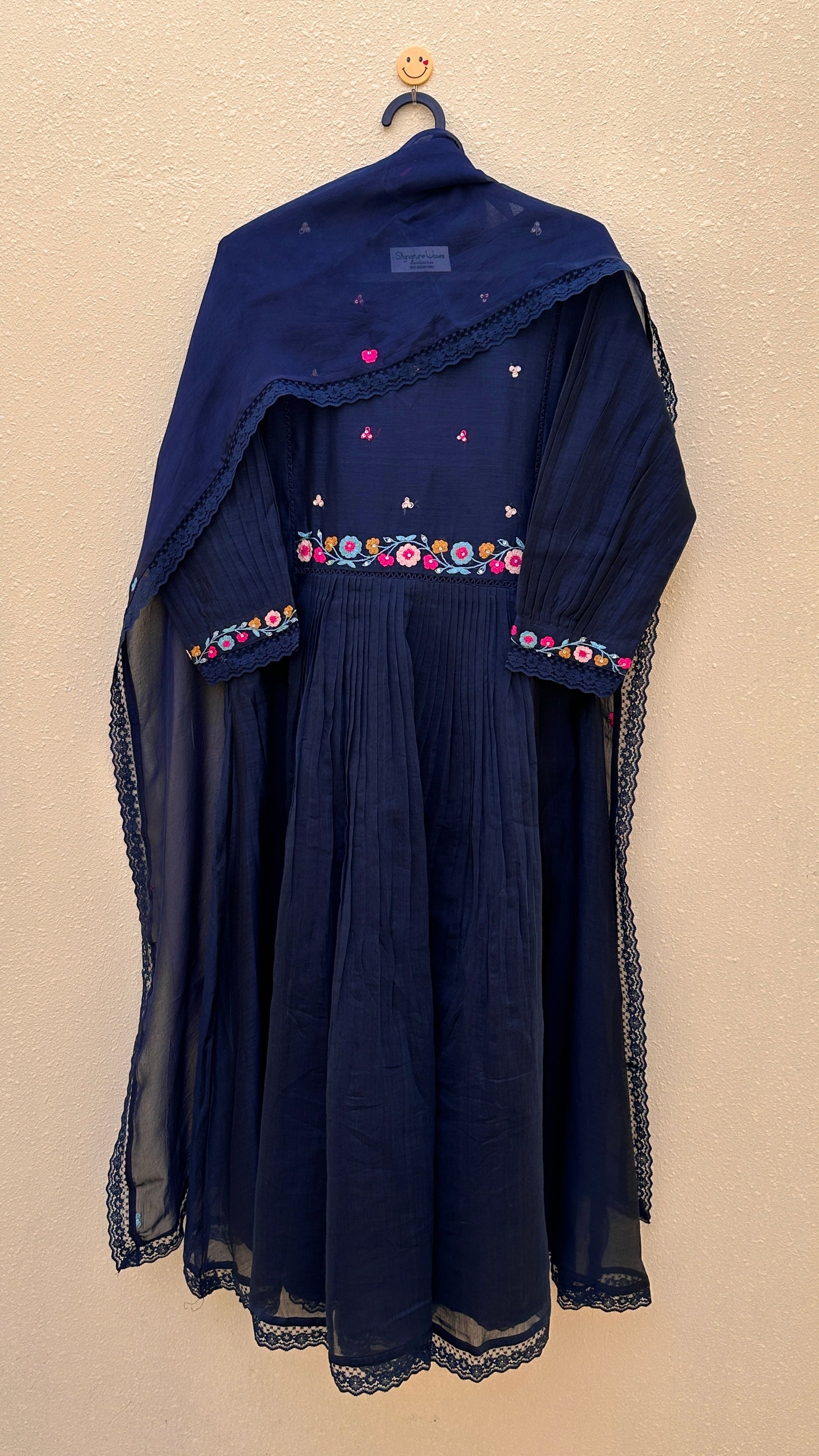 This three-piece suit set brings together the richness of Chanderi Kurta, soft Santoon pants, and a light Organza dupatta ,all in a deep navy hue that makes the embroidery stand out like tiny blooms at night.