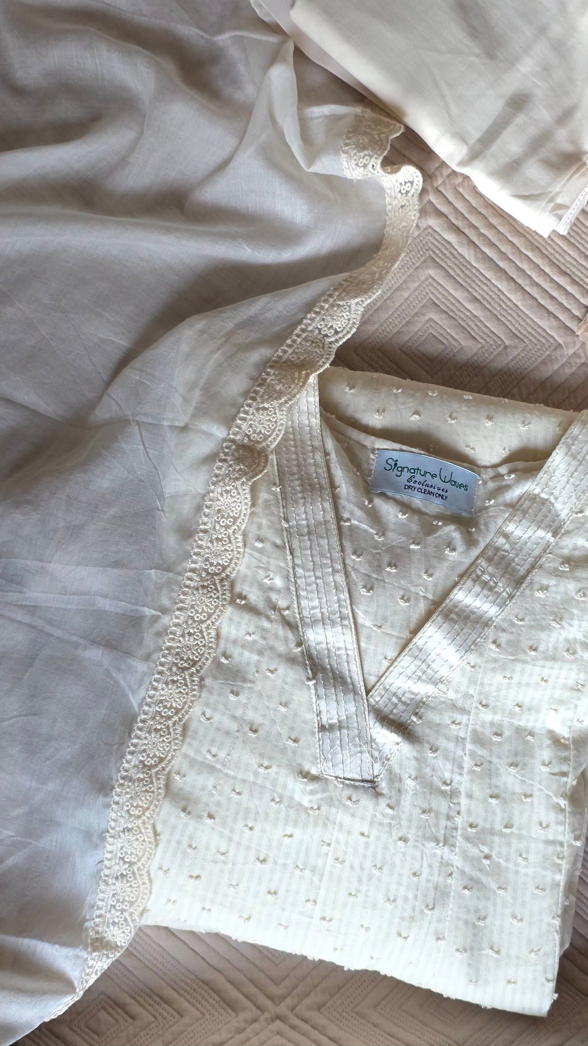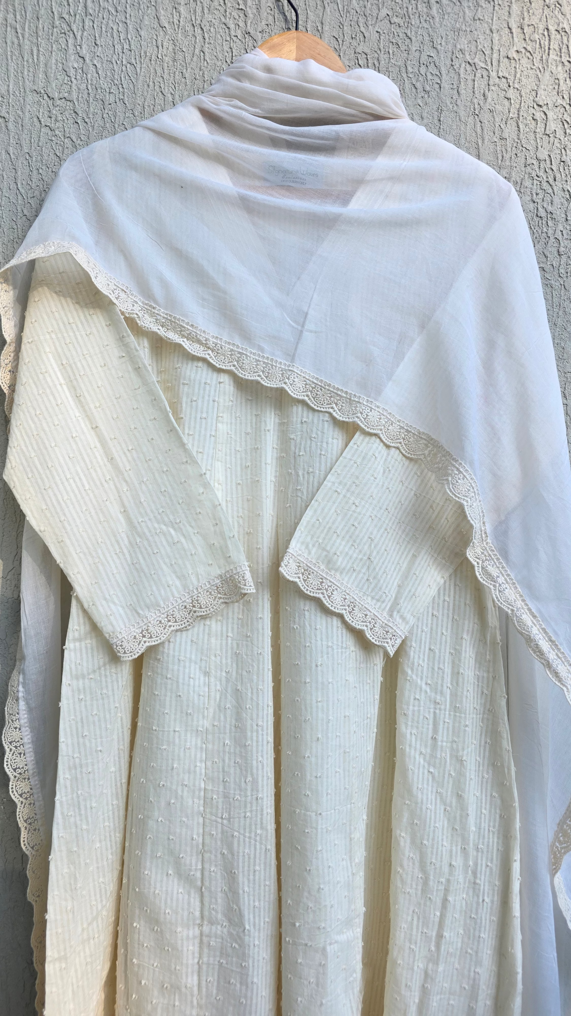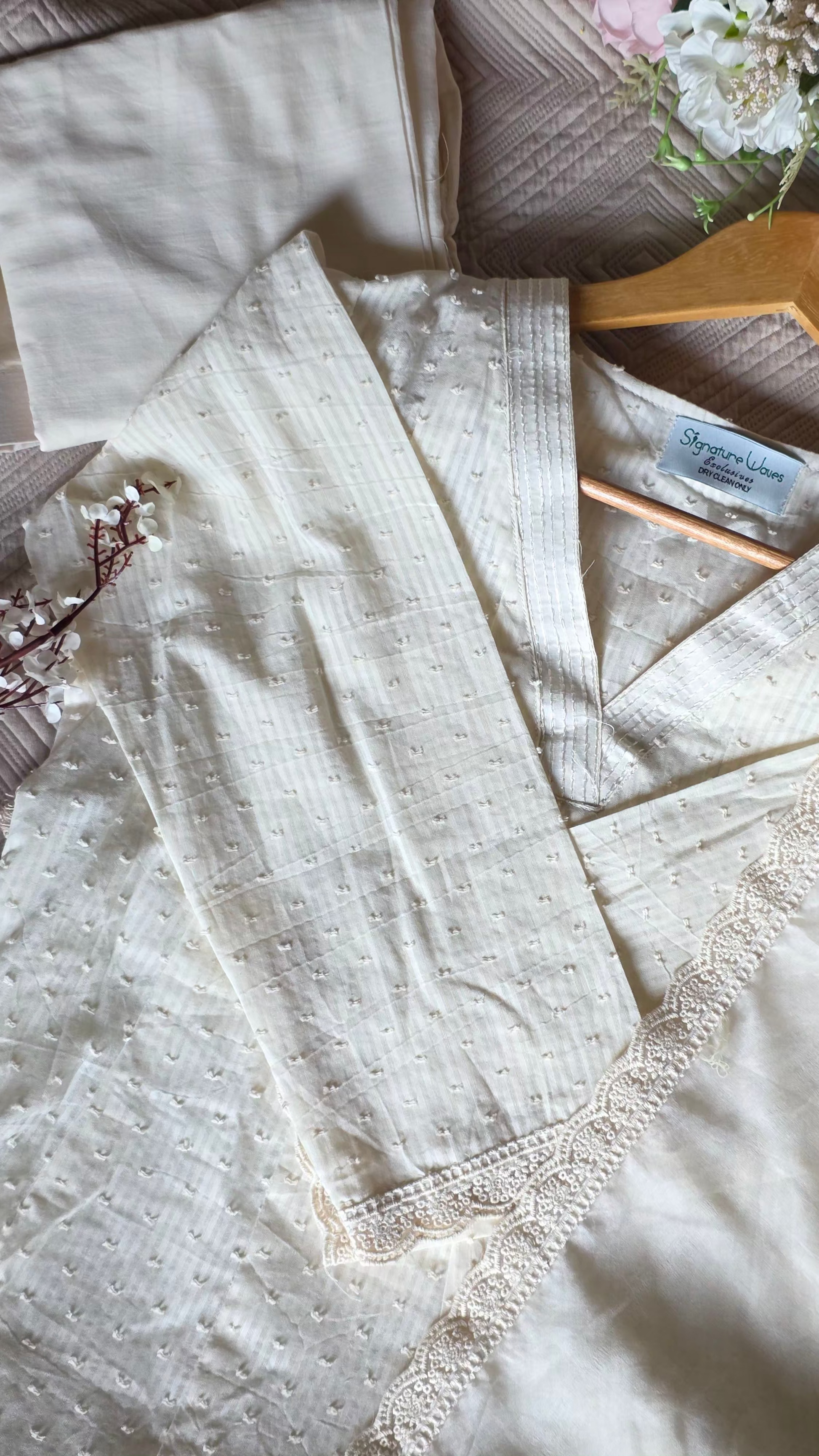 Inspired from Indian summers which is a season of travel and romance. It’s a 3 piece suit set done in soft cotton fabric while dupatta done in mul mul with beautiful lace detailing along with a pair of cotton pants.