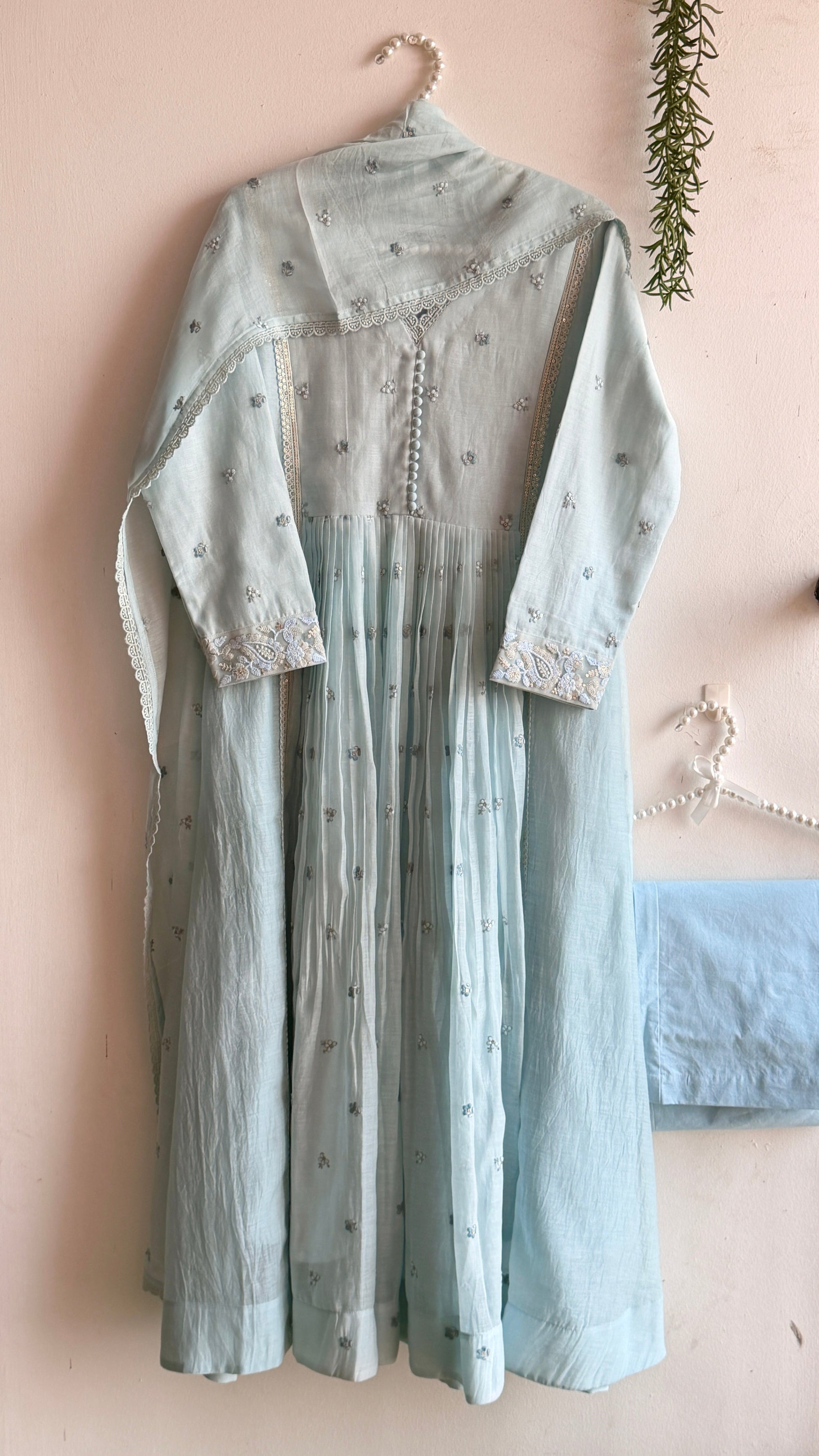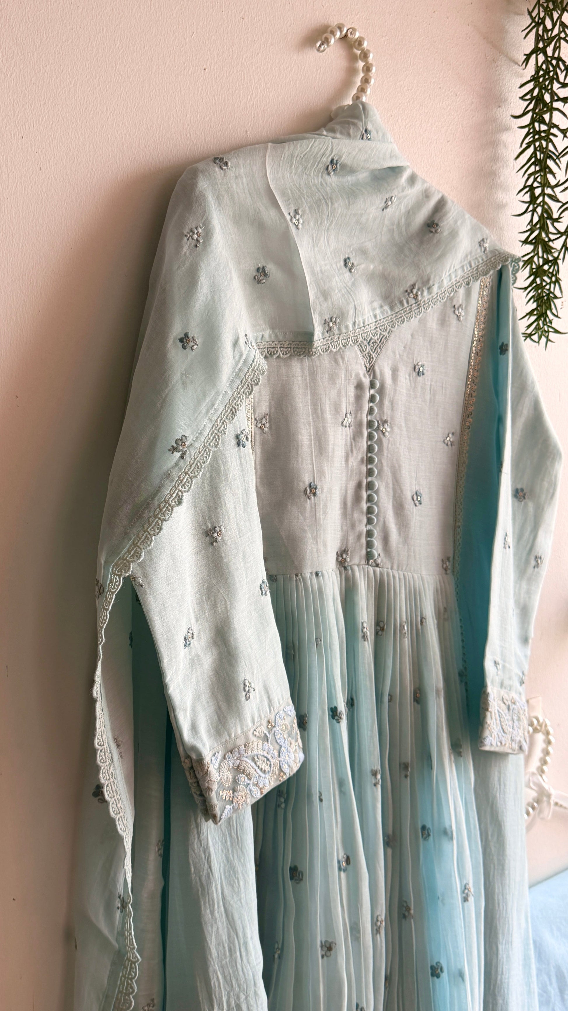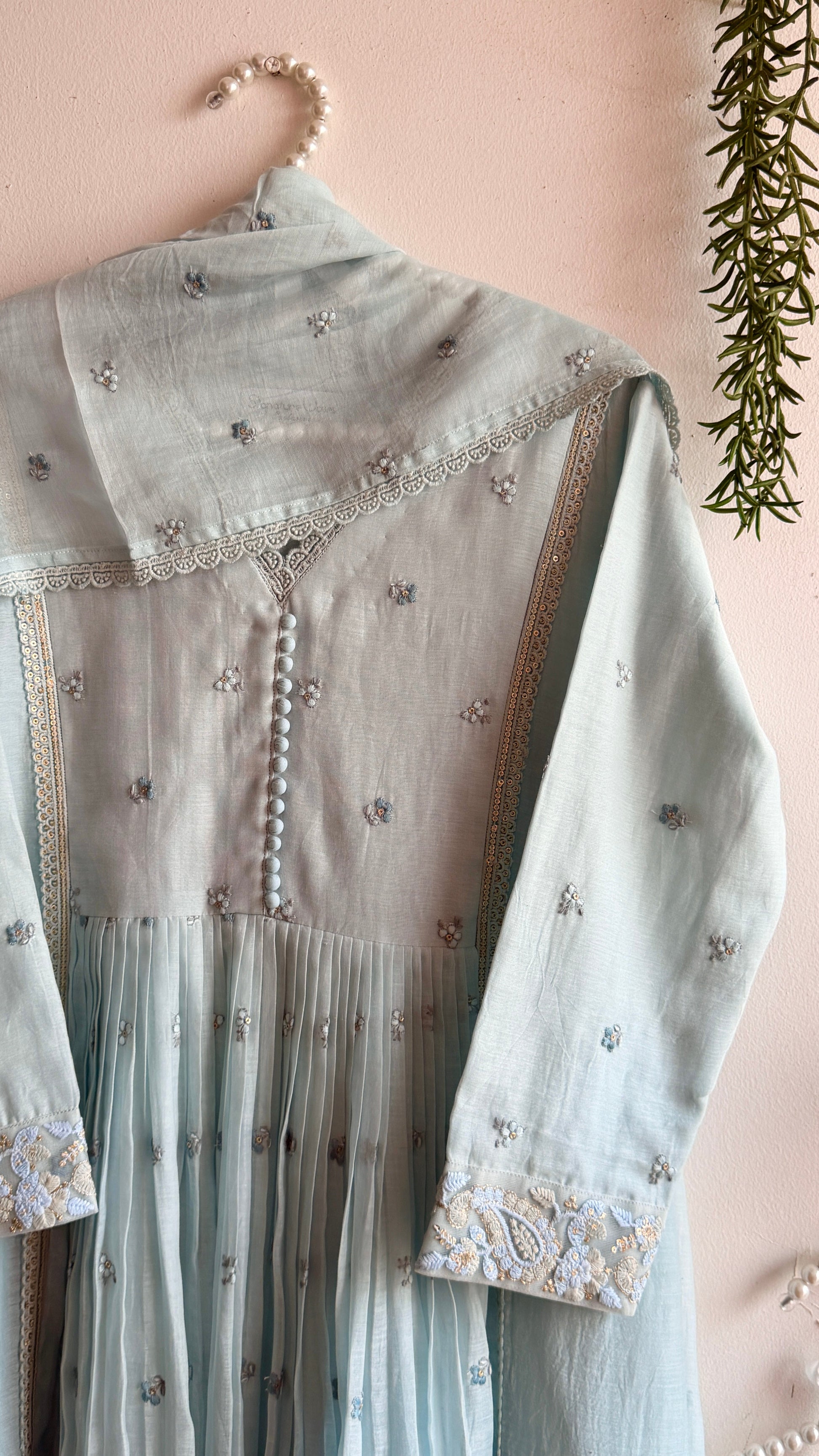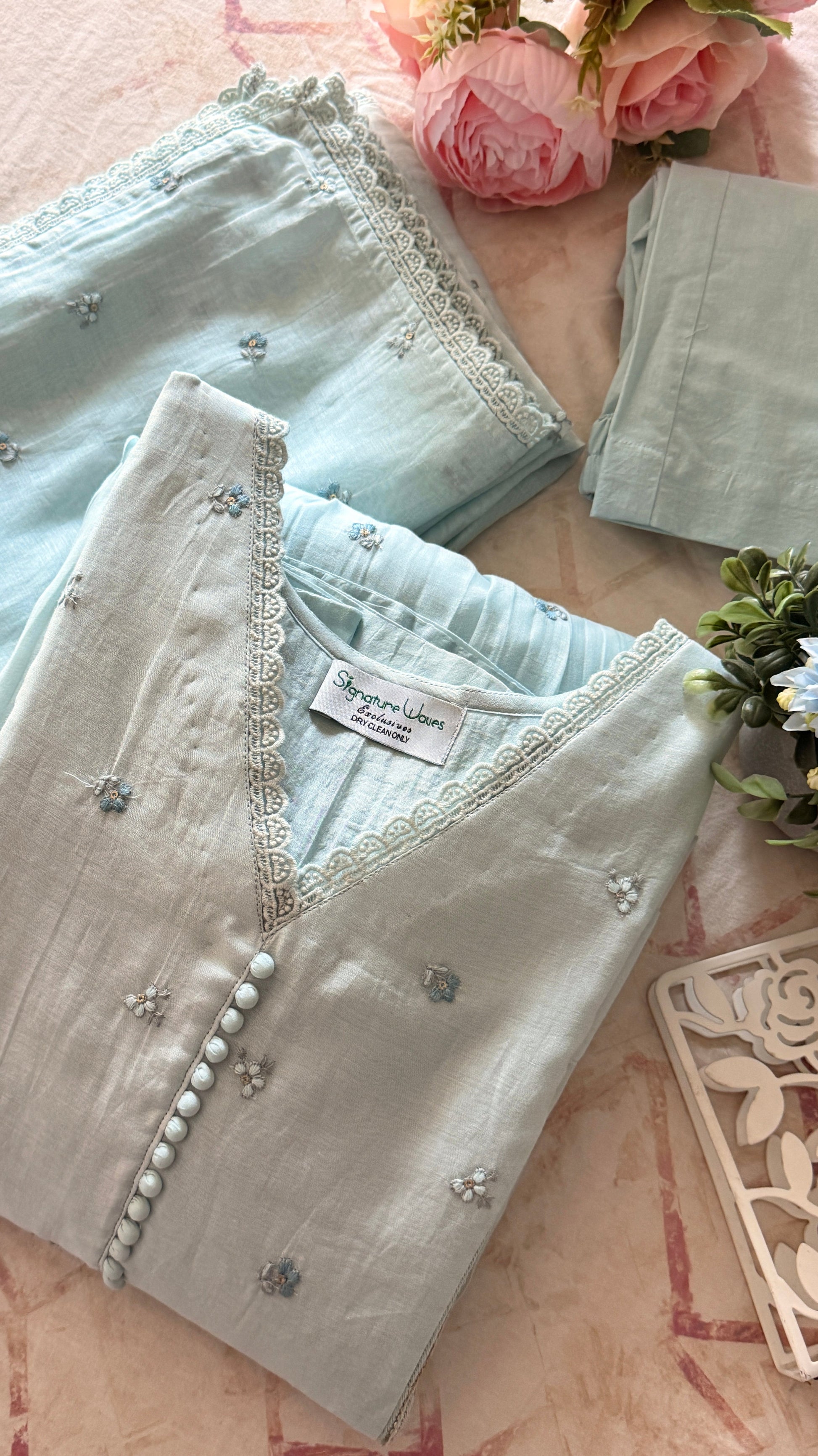 Delicate floral hand embroidery is scattered across the fabric like tiny blooms resting on morning mist,the entire set done in mul Chanderi with embroidery along with cotton pants and dupatta having four side lace borders.The neckline is finished with subtle lace edging and fabric covered buttons,Lace detailed sleeves enhance the softness of the design.