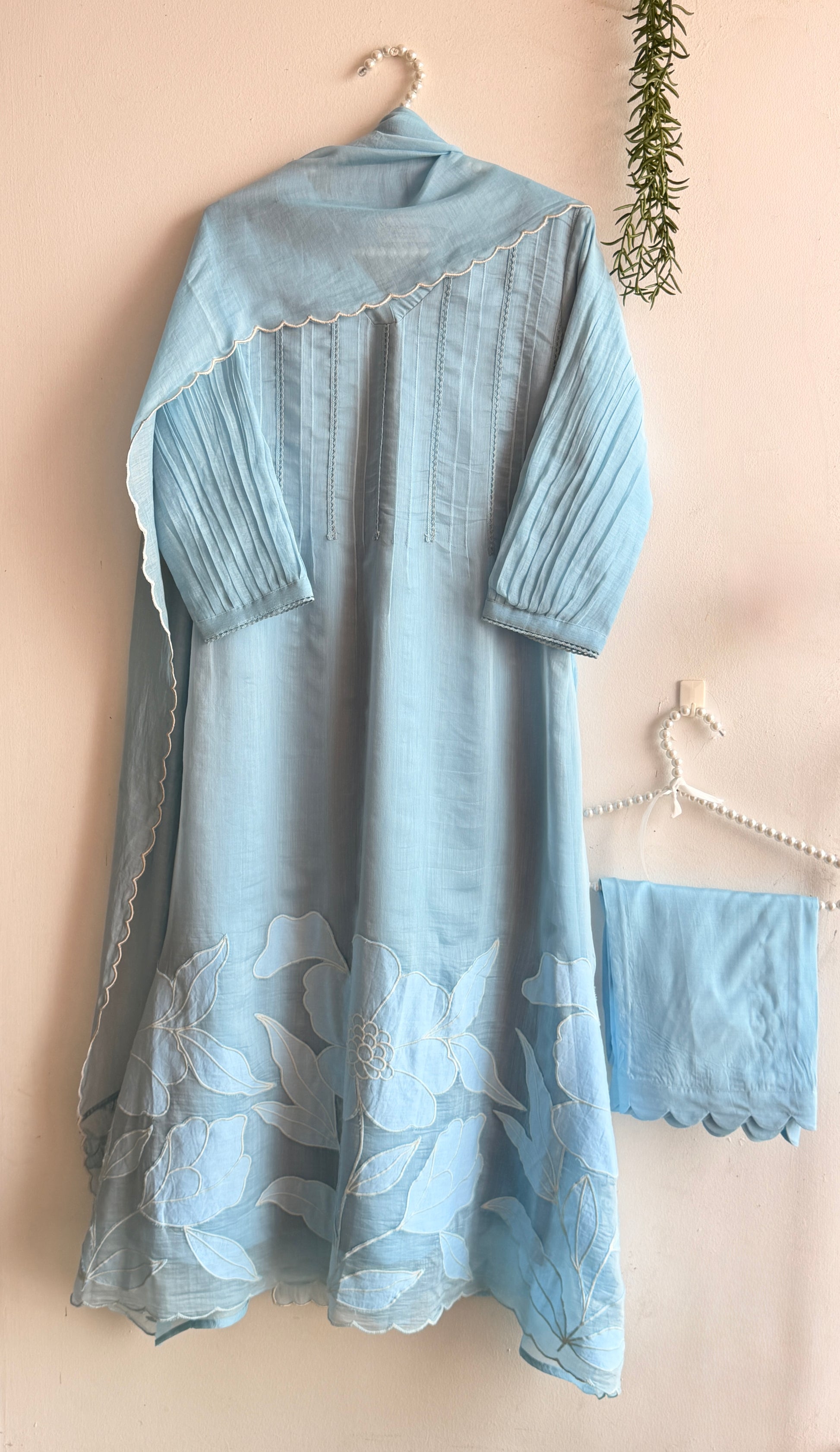 The highlight is the delicate appliqué work blooming along the hem and dupatta edges. It’s a 3 piece Aline suit set done in pure mul Chanderi fabric. Paired with a scalloped pants and a cute aplique work scalloped dupatta.