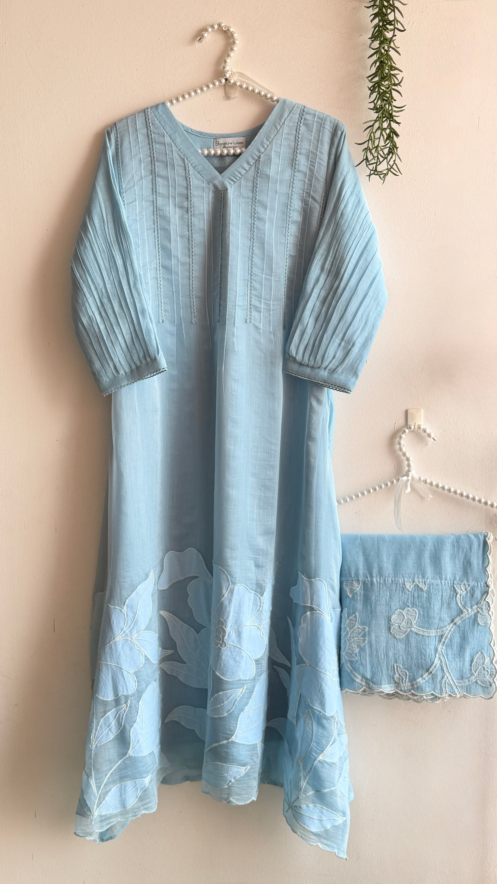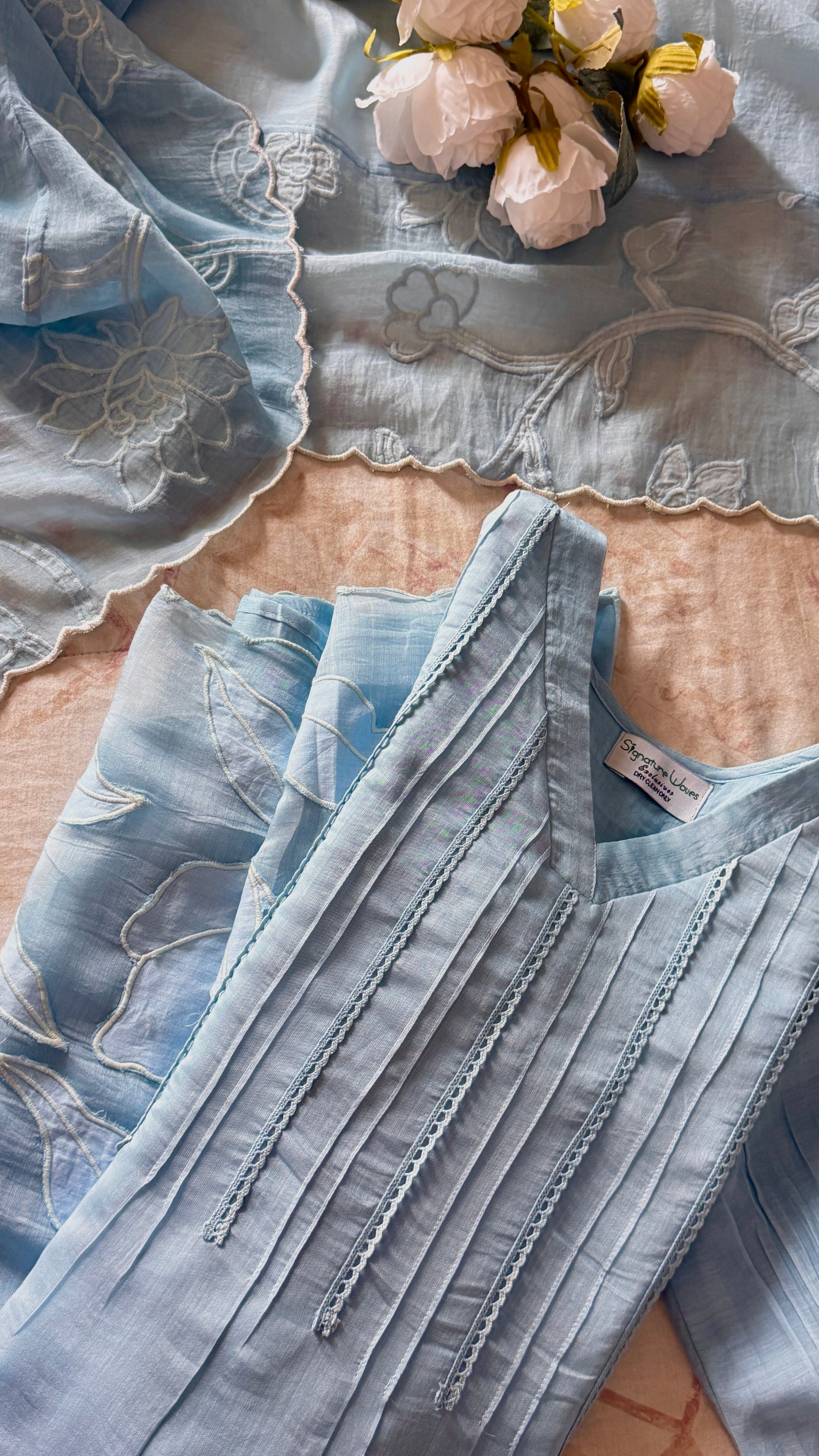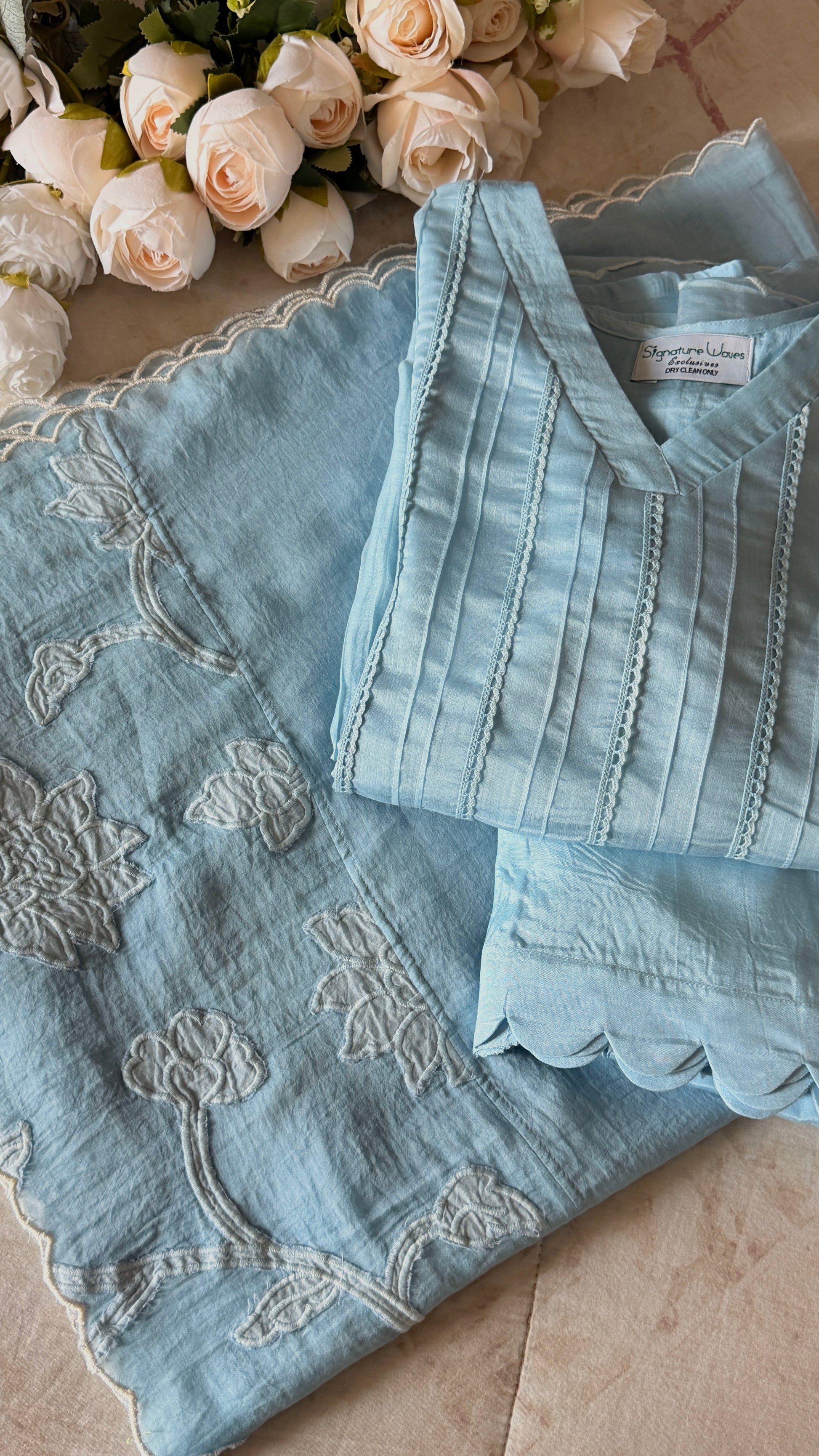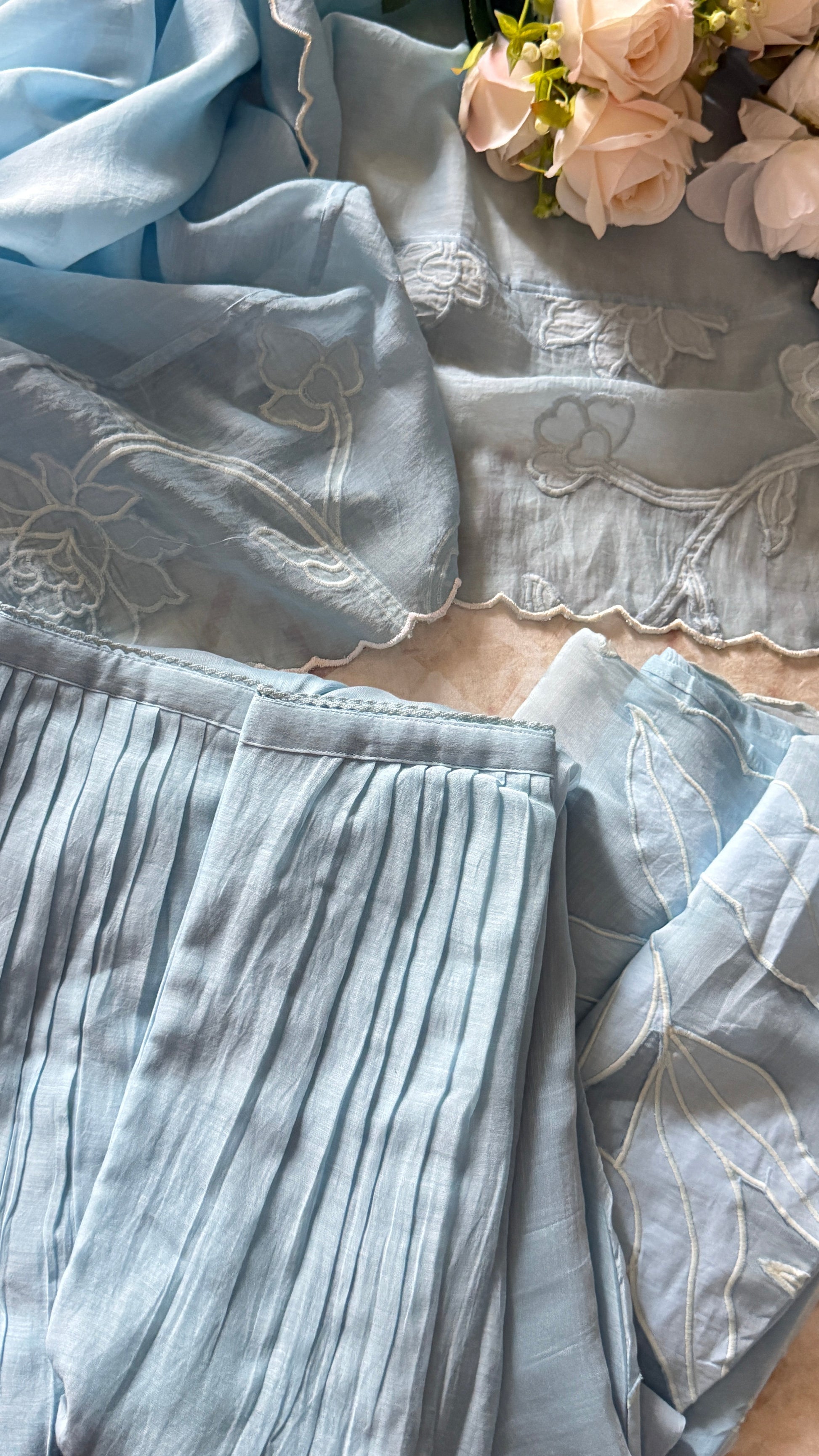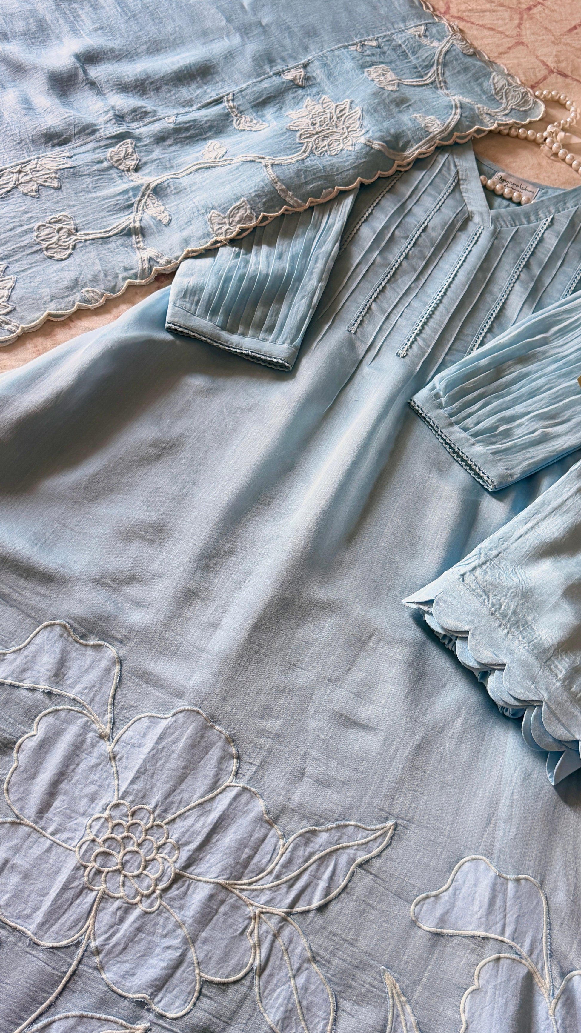 This oufit reflects the soothing blue tone and light texture, and Rose connects beautifully with the floral appliqué work.