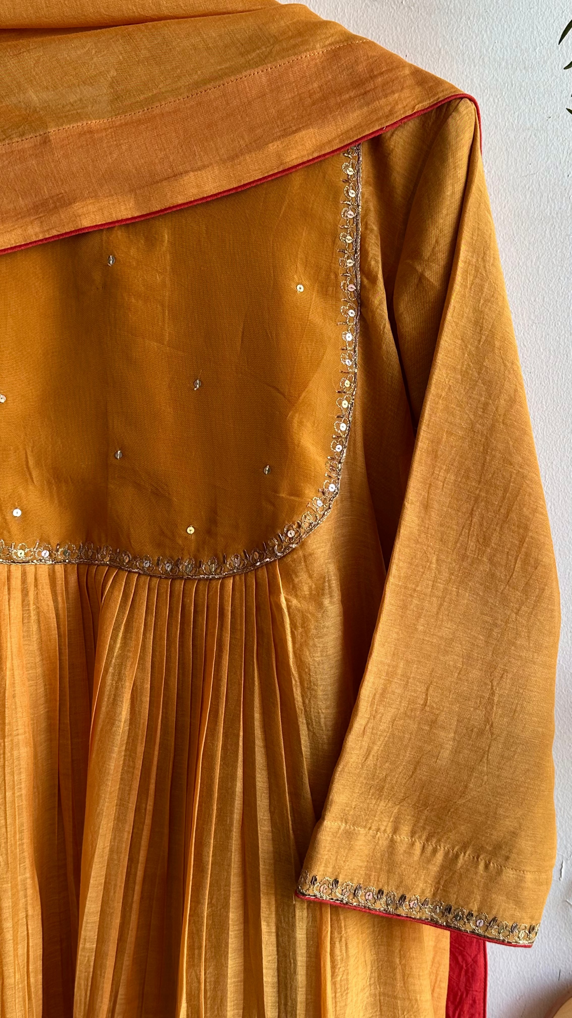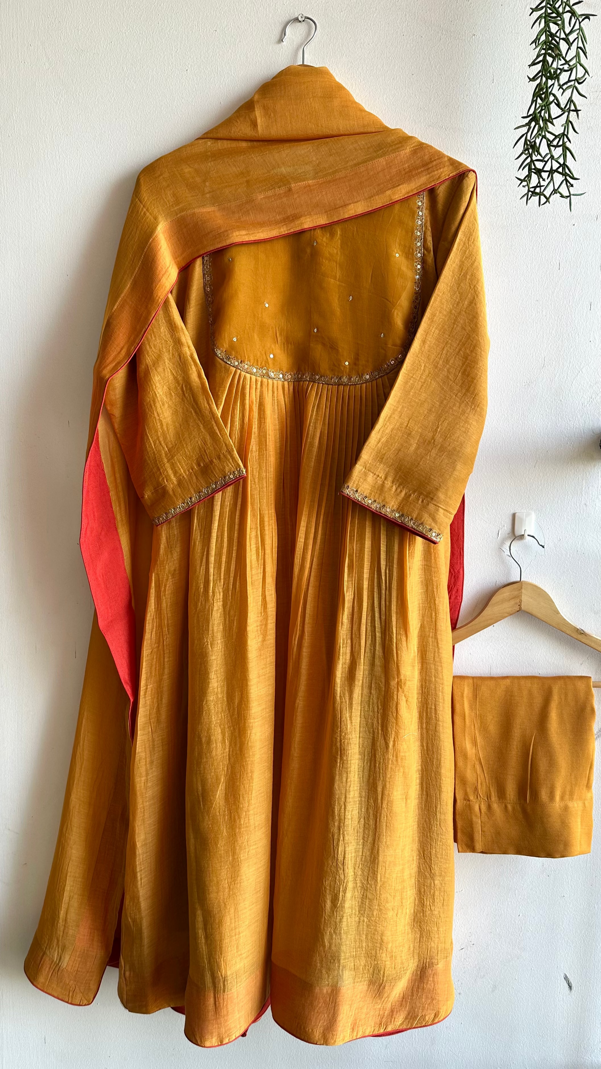Crafted in rich Chanderi fabric, this beauty comes with hand work highlights, a graceful organza-detailed yoke, and striking brick-orange piping that brings the whole look alive.