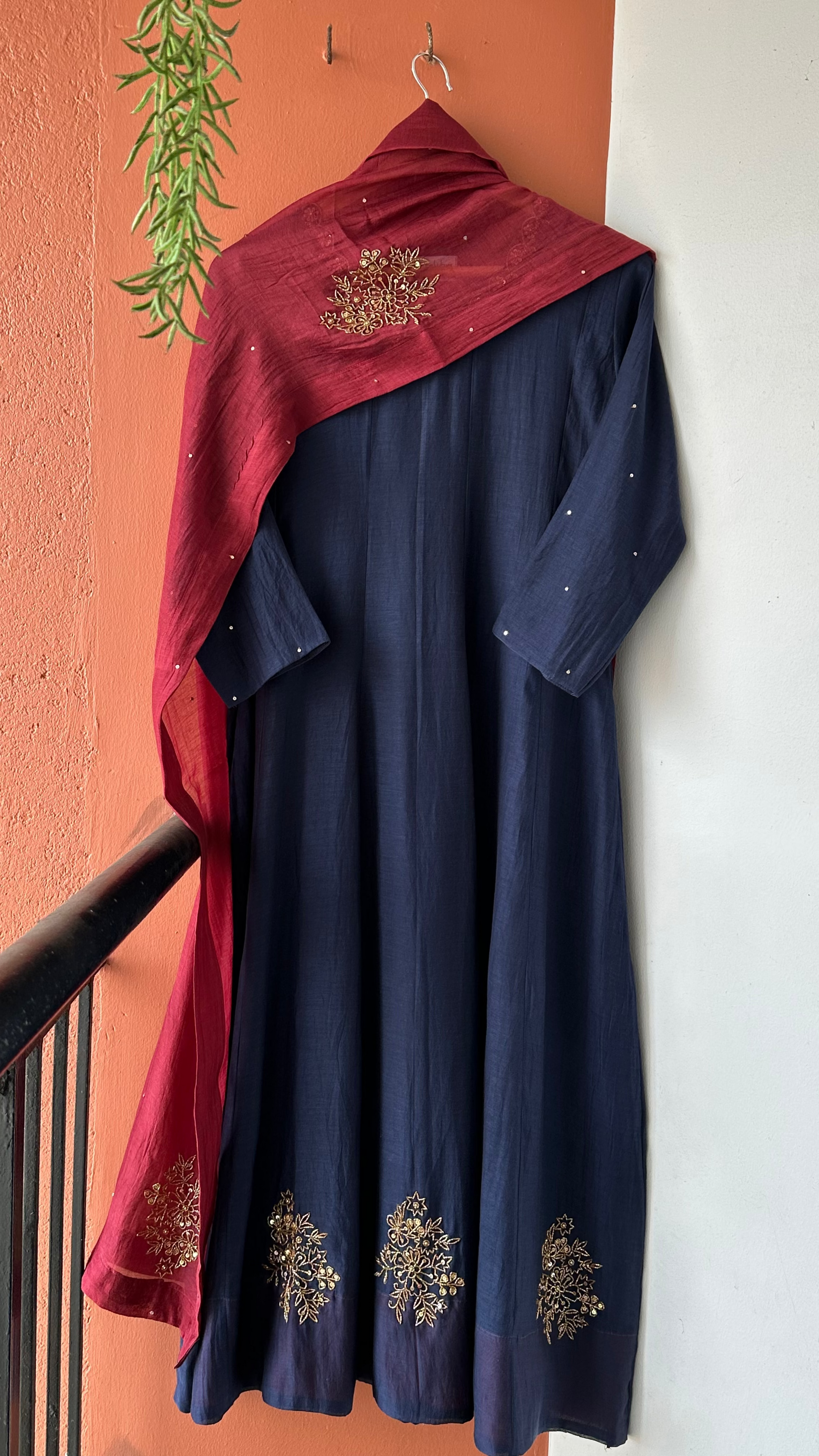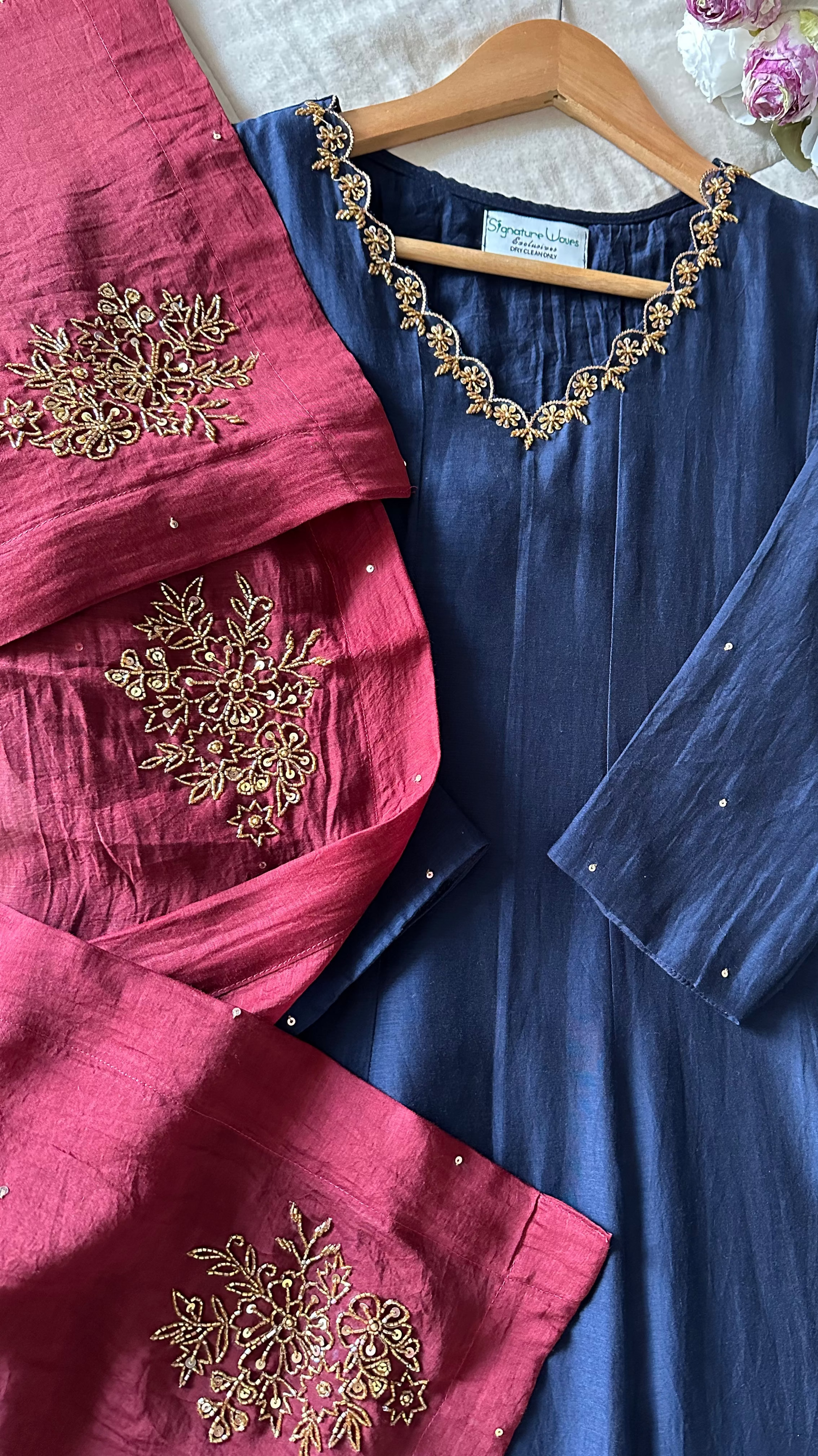 There’s something timeless about the union of navy blue and dark maroon — a story that speaks of dusk meeting desire. “Gulaabi Raat” is a three-piece Panel cut, Anarkali suit set crafted in soft Chanderi, where simplicity meets subtle grandeur.