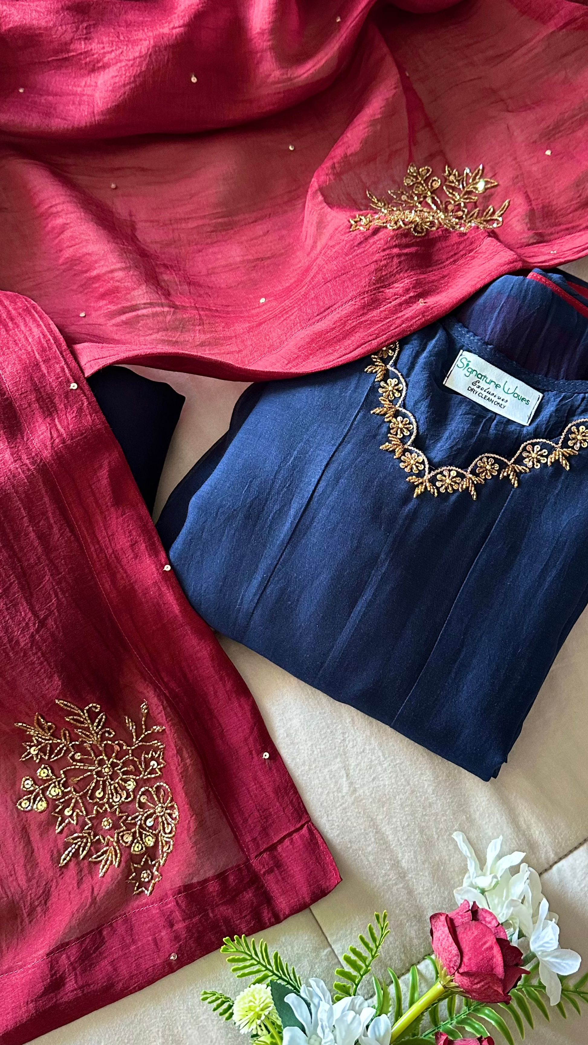 The top features delicate floral handwork tracing the neckline, while the dupatta drapes in sheer maroon with golden zari embroidery blooming like evening lights. Tiny scattered sequins add a whisper of shimmer, and the plain blue pants balance the richness with quiet poise.