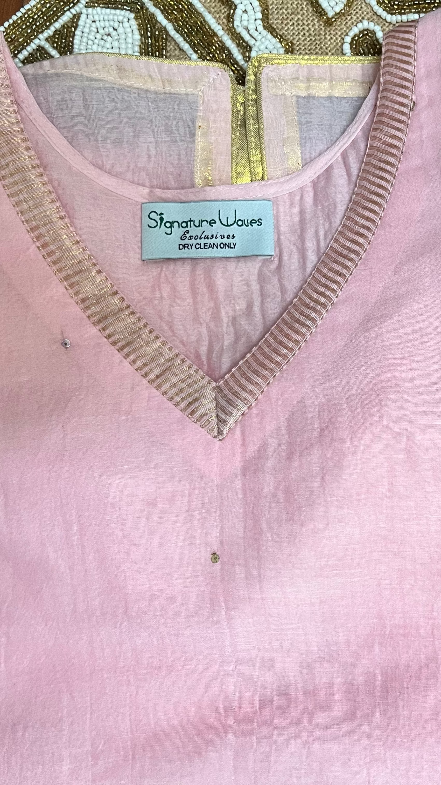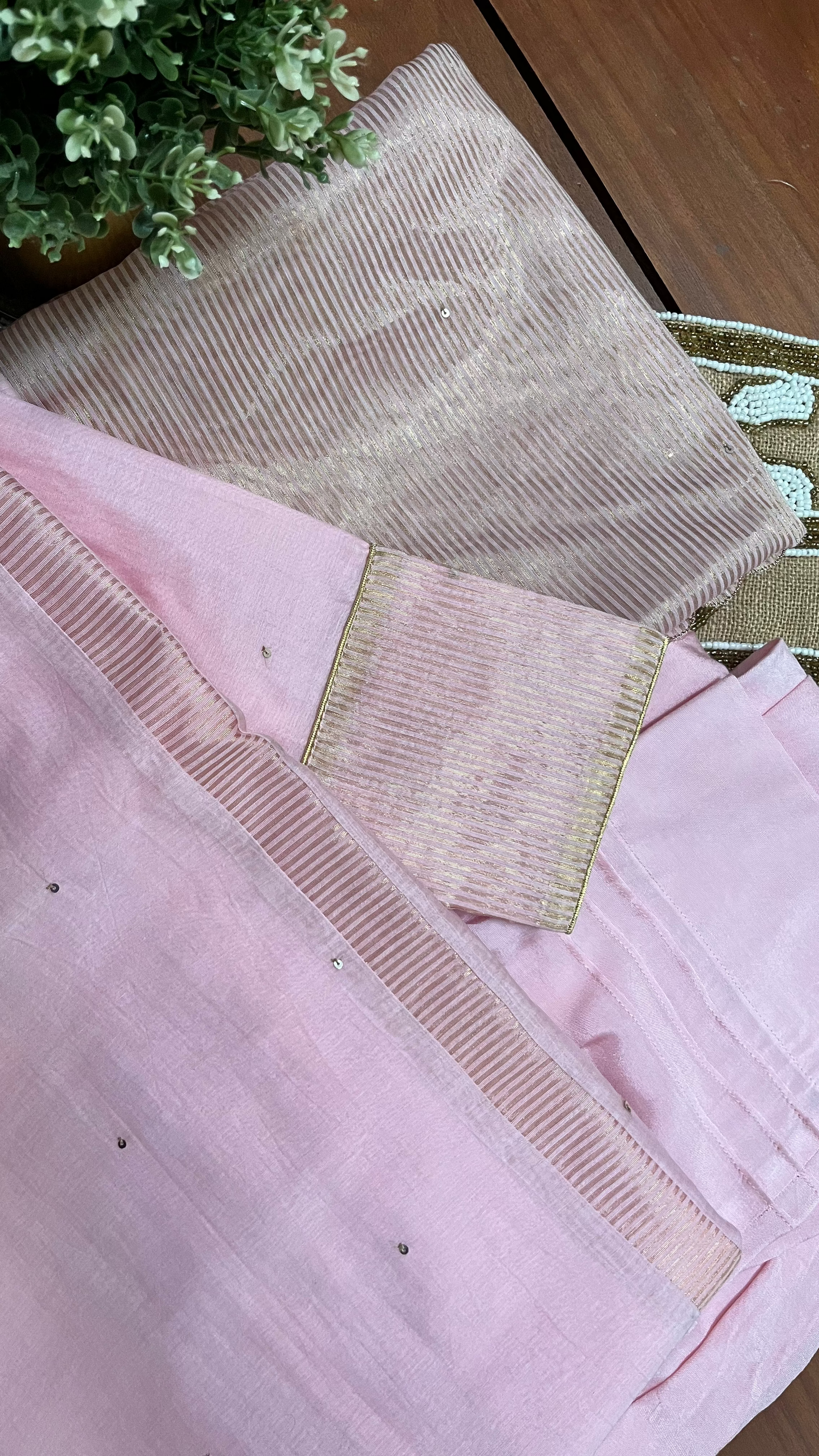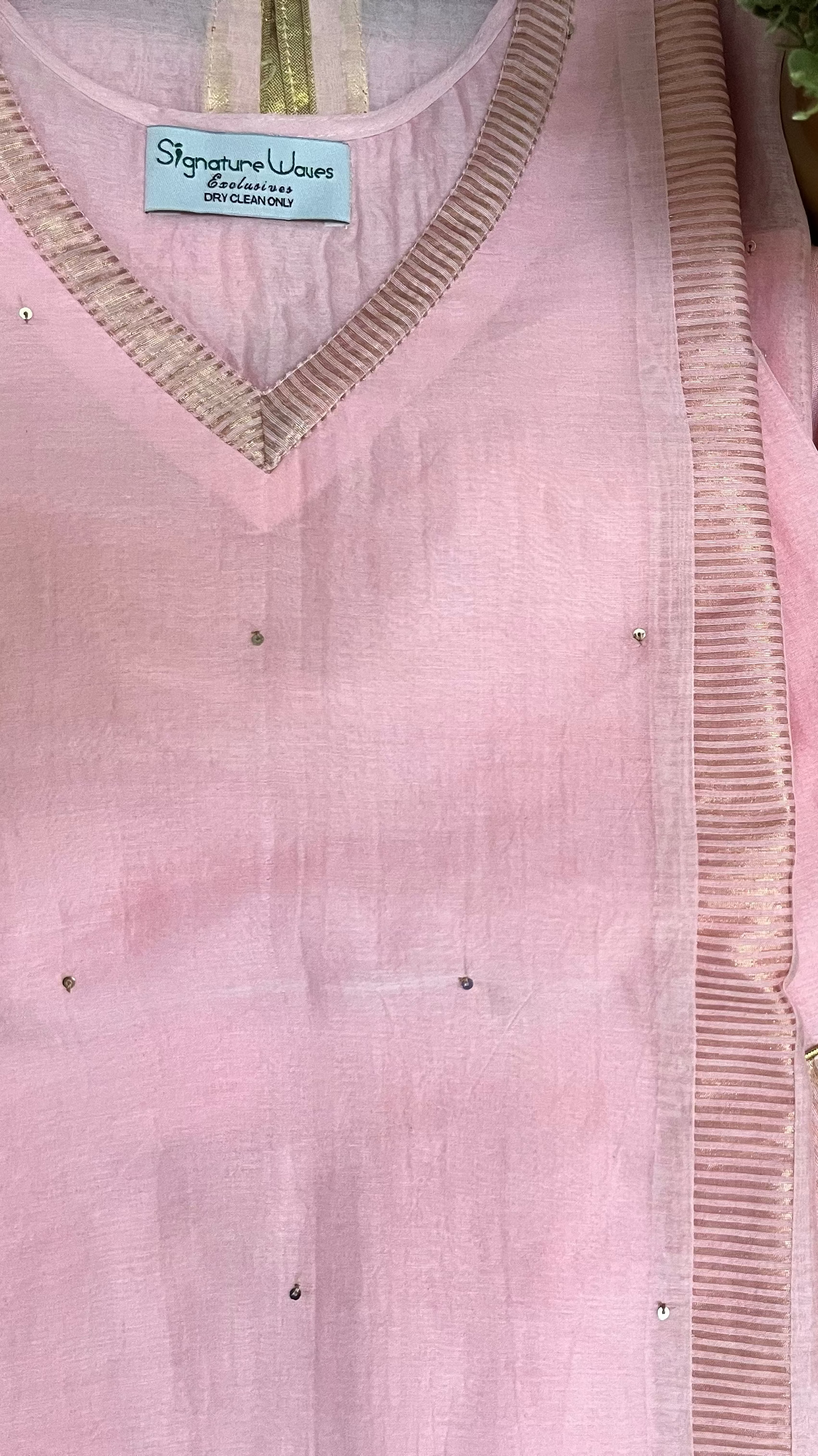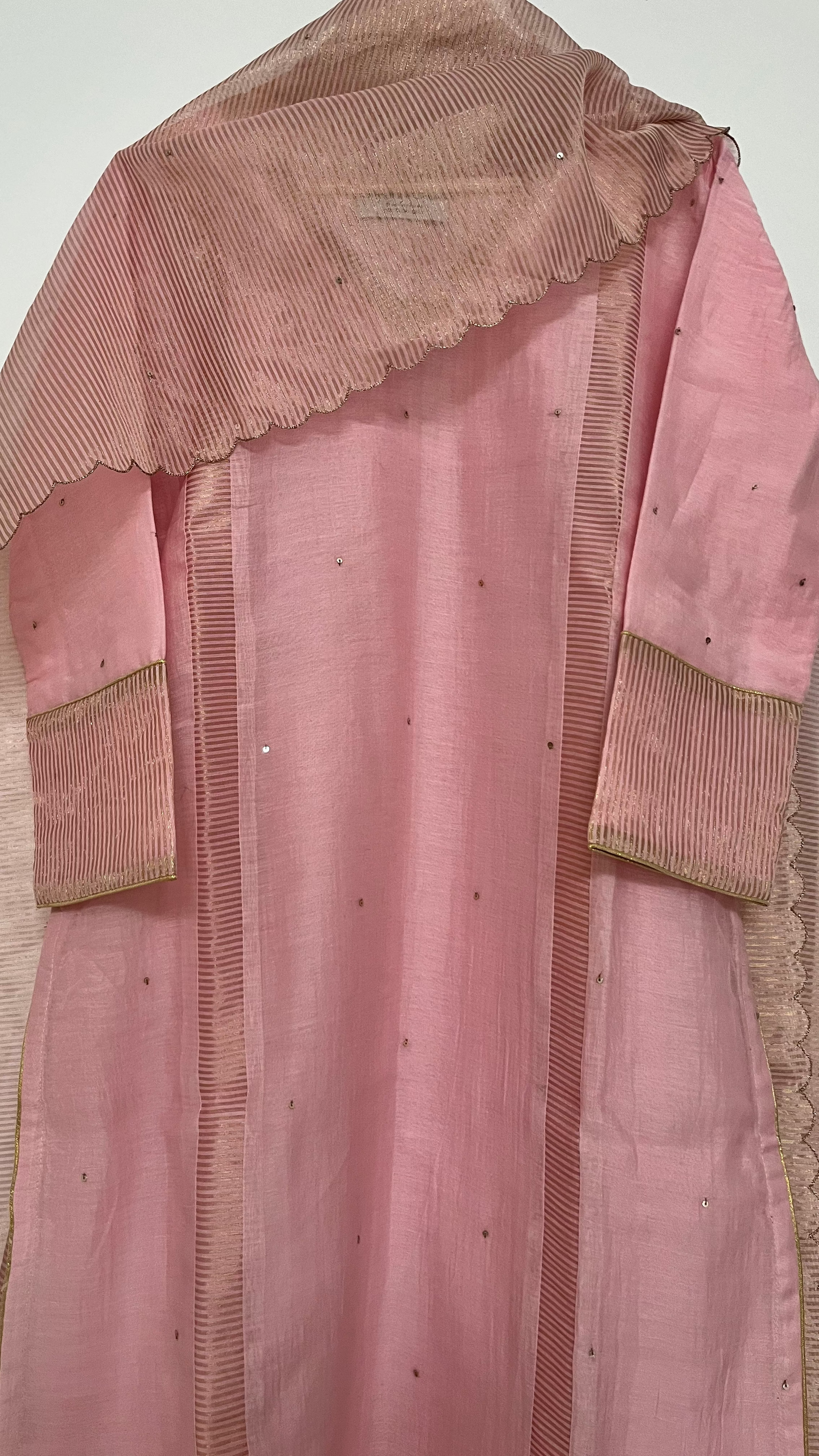 Celebrating the fusion of classic silhouettes finds its way to the Zaari weaved beautifully done dupatta embellished with handcrafted scallops and sequins spreaded all over. Very soft Banarasi Chanderi suit set done in pink shade.