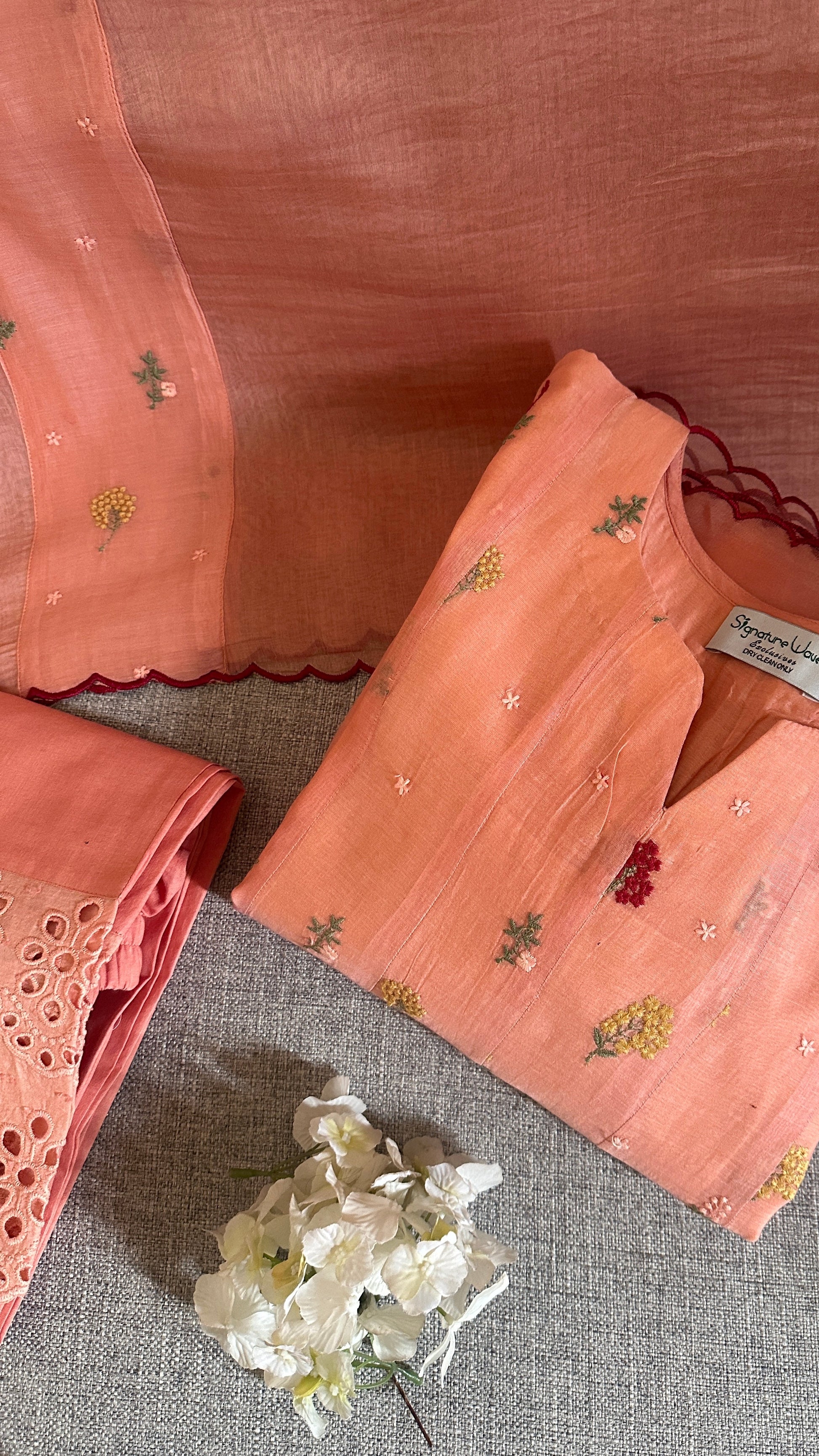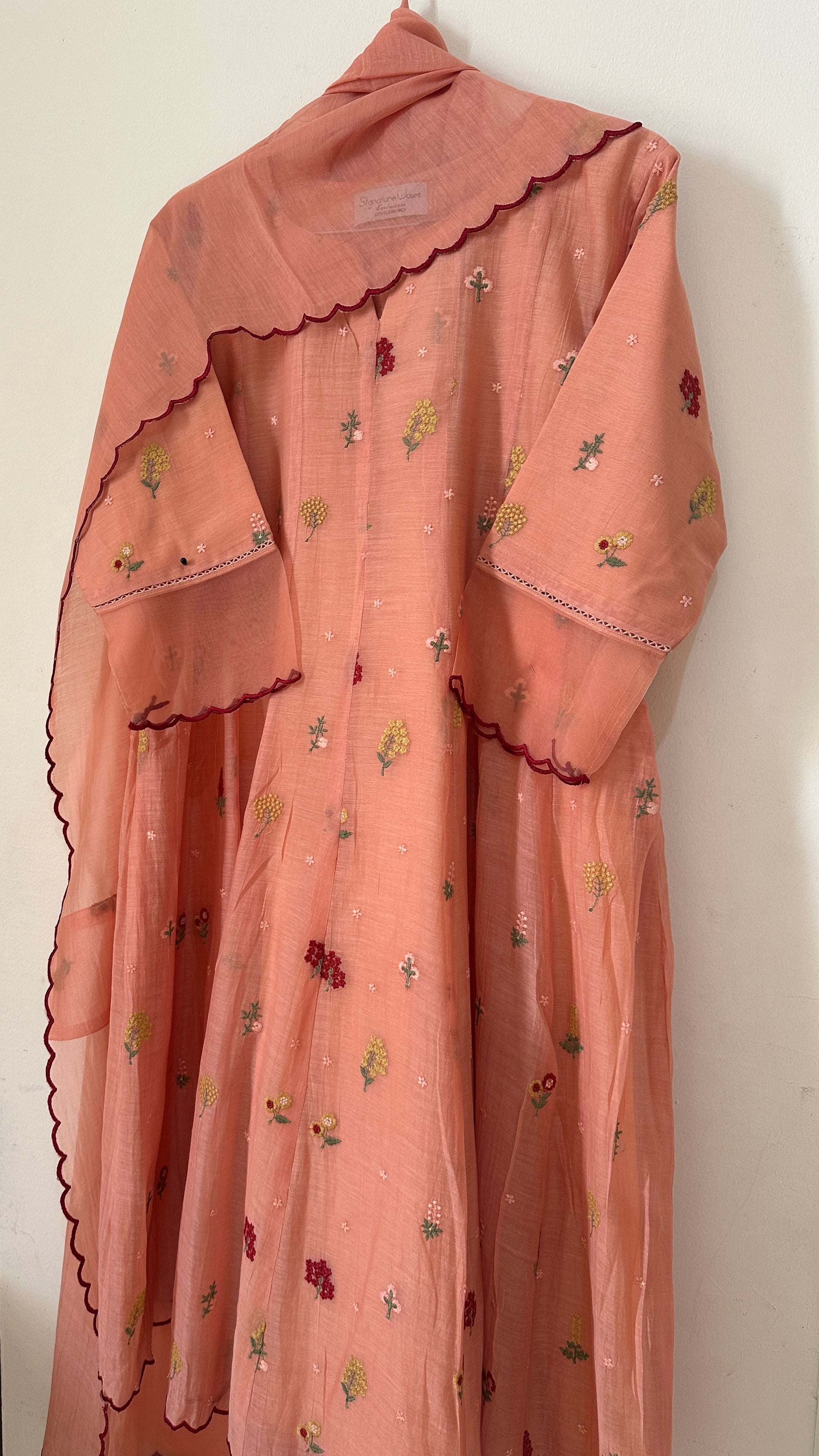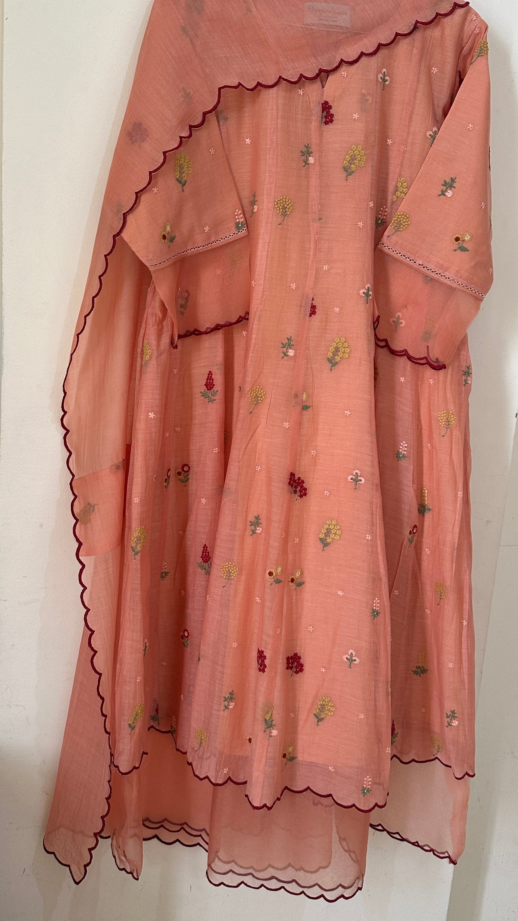 Presenting “Peach Serenade” — a rich dark peach Chanderi panel-cut Anarkali, designed with structured front and back panels. Adorned with intricate threadwork embroidery and finished with elegant red scallop detailing for a graceful contrast.
