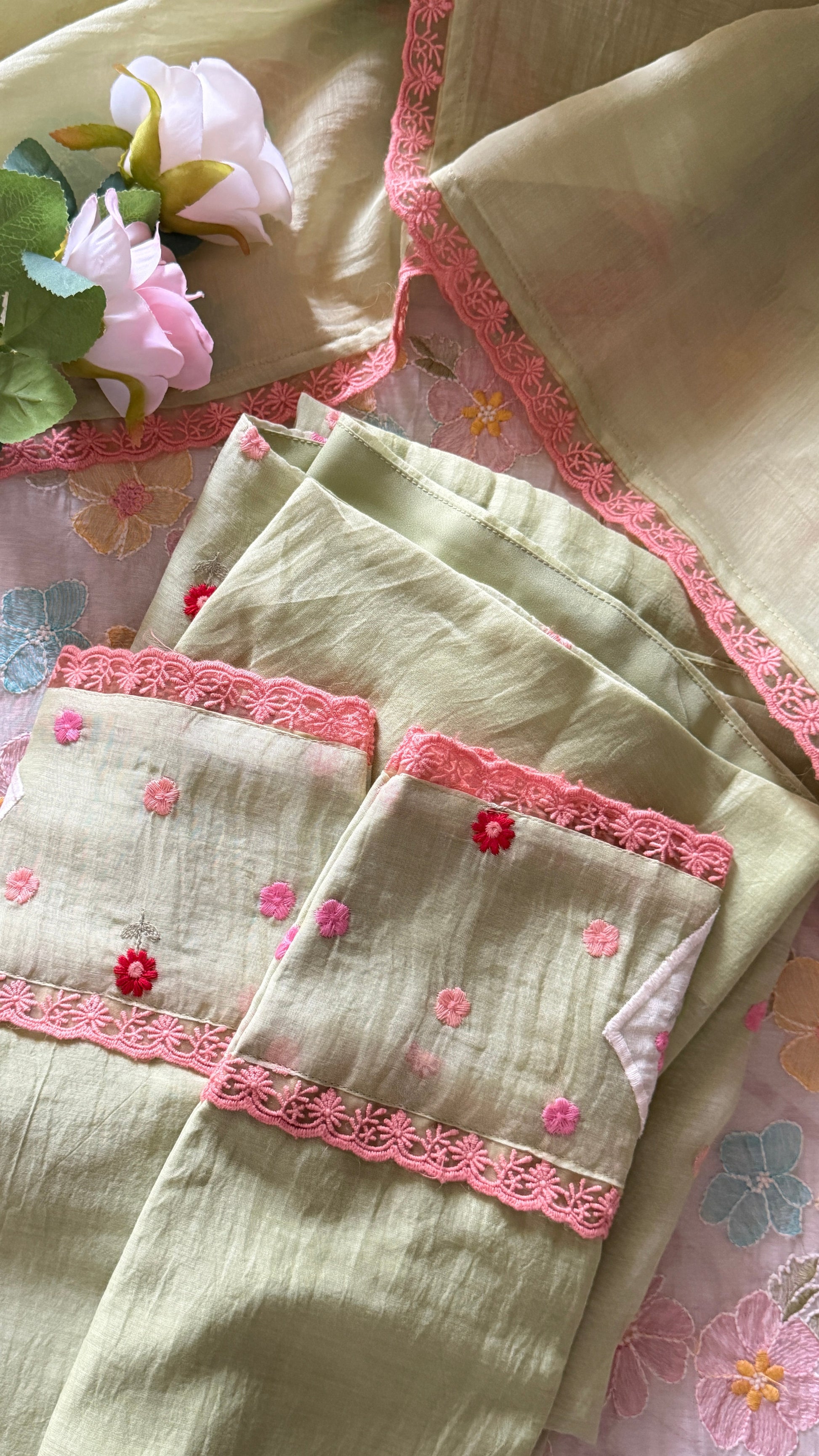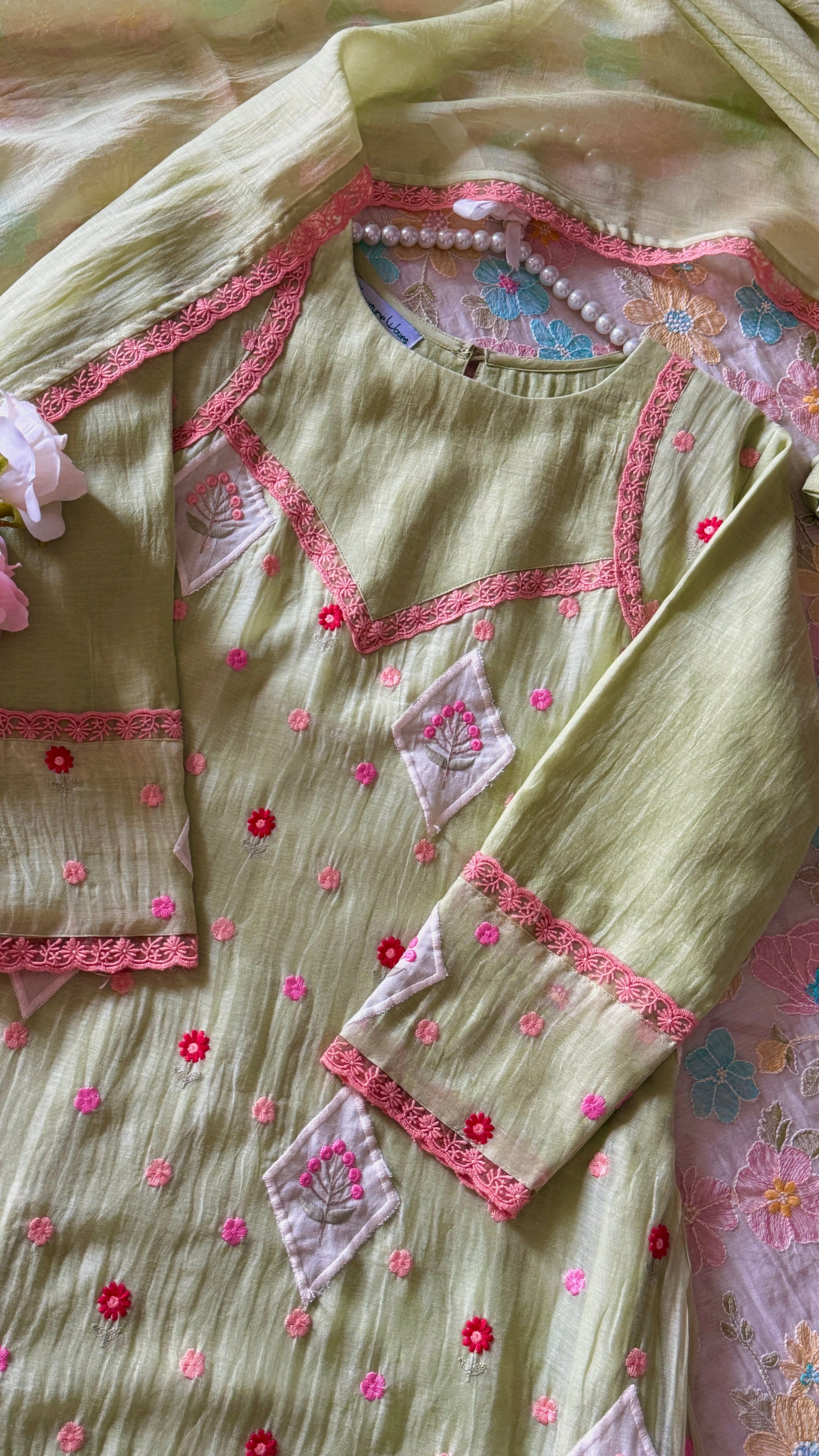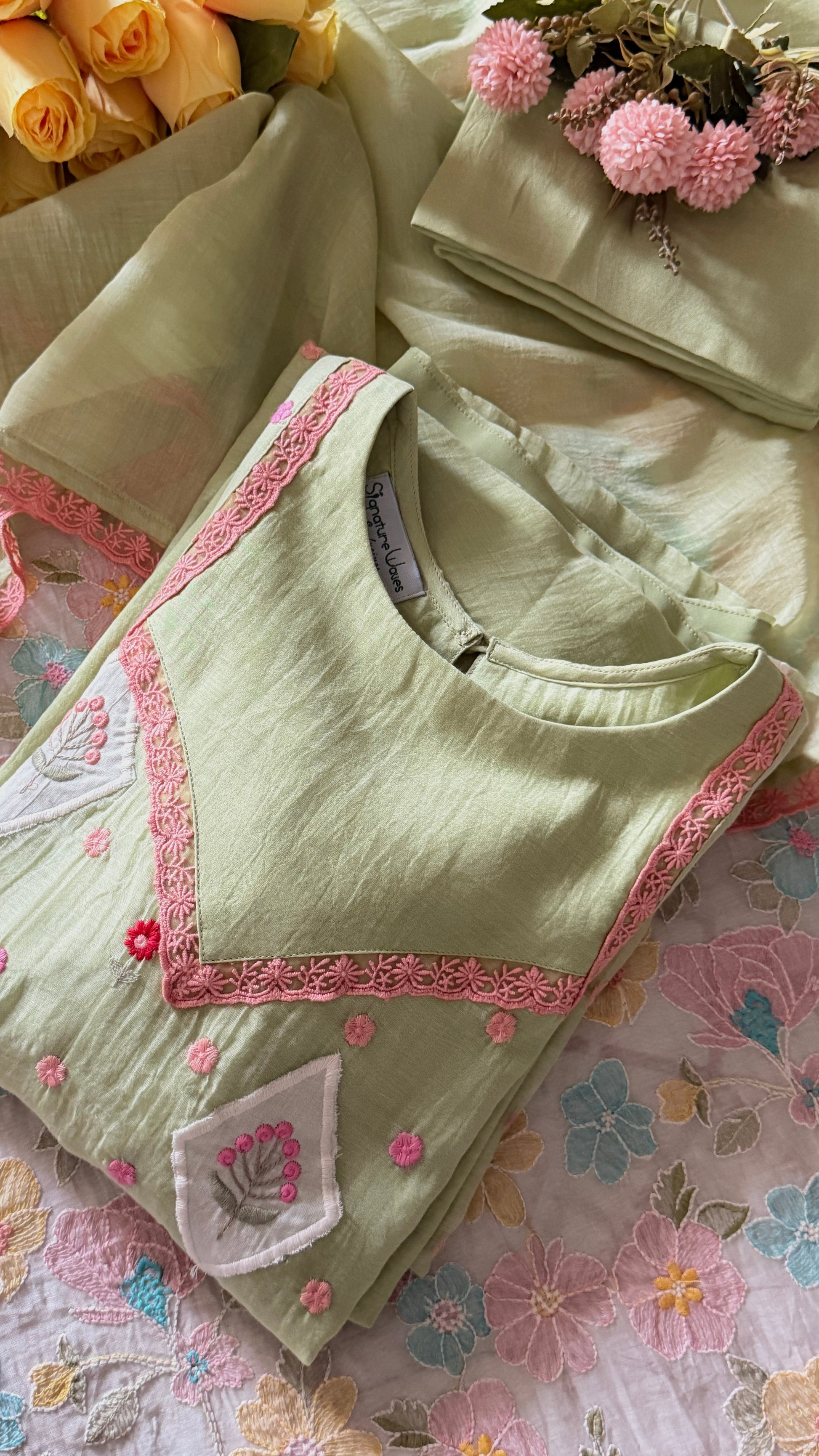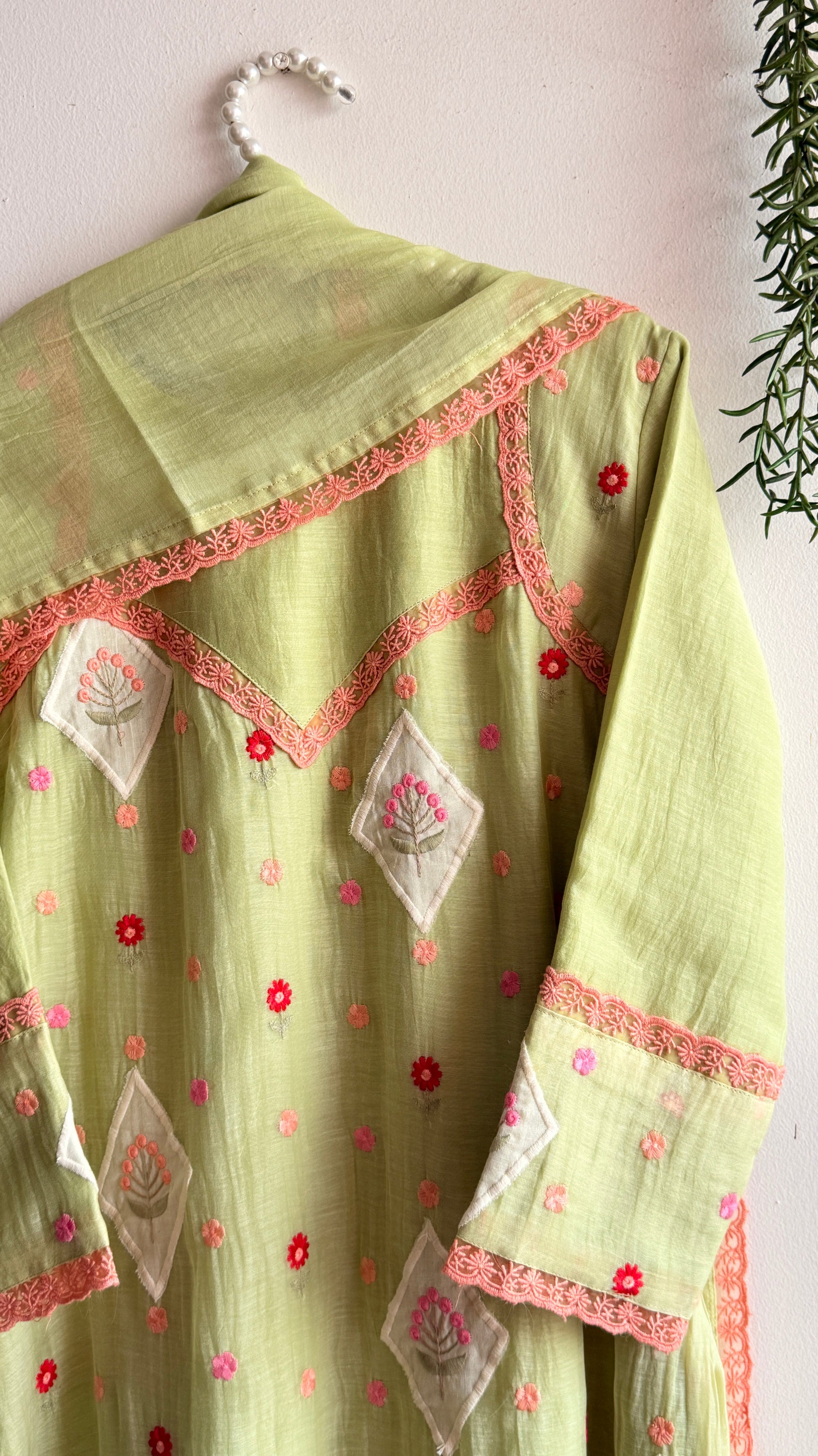 A soothing pistachio-green three-piece suit set highlighted with delicate peach lace accents and scattered floral applique works and embroidery.