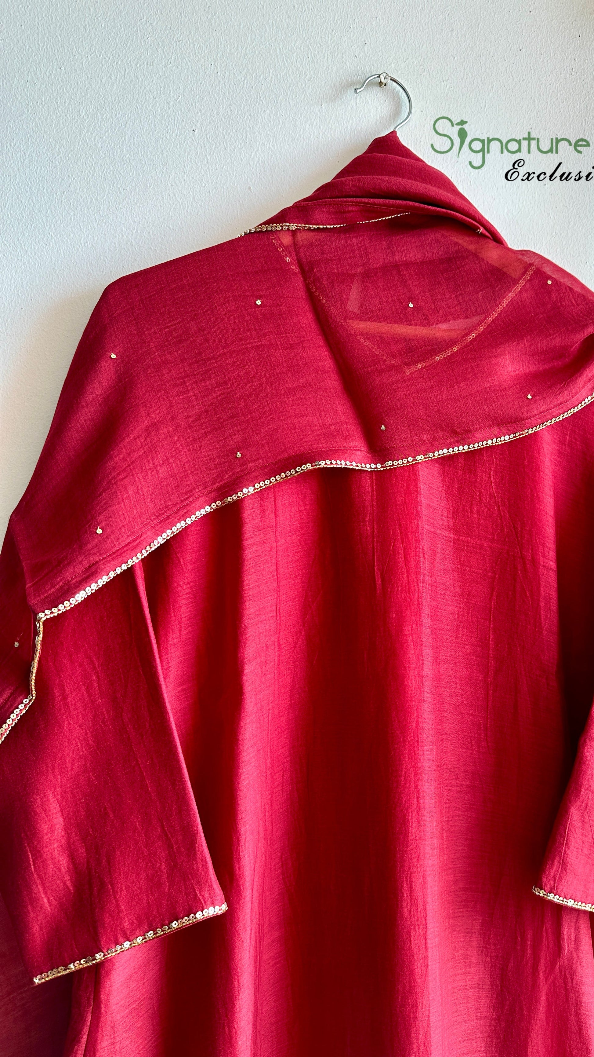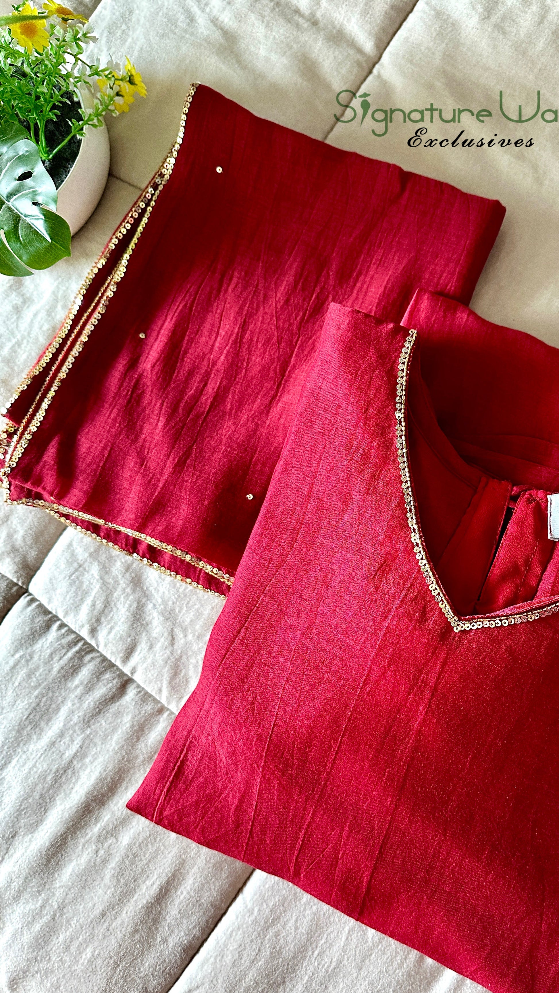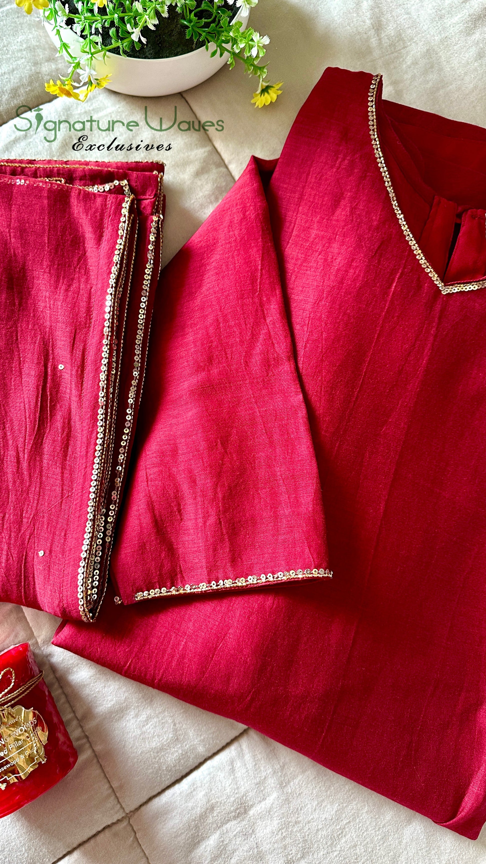 It’s a 3 piece stitched flaired suit set done in Crimson RED shade embellished handy crafted work. Done in pure Chanderi fabric.