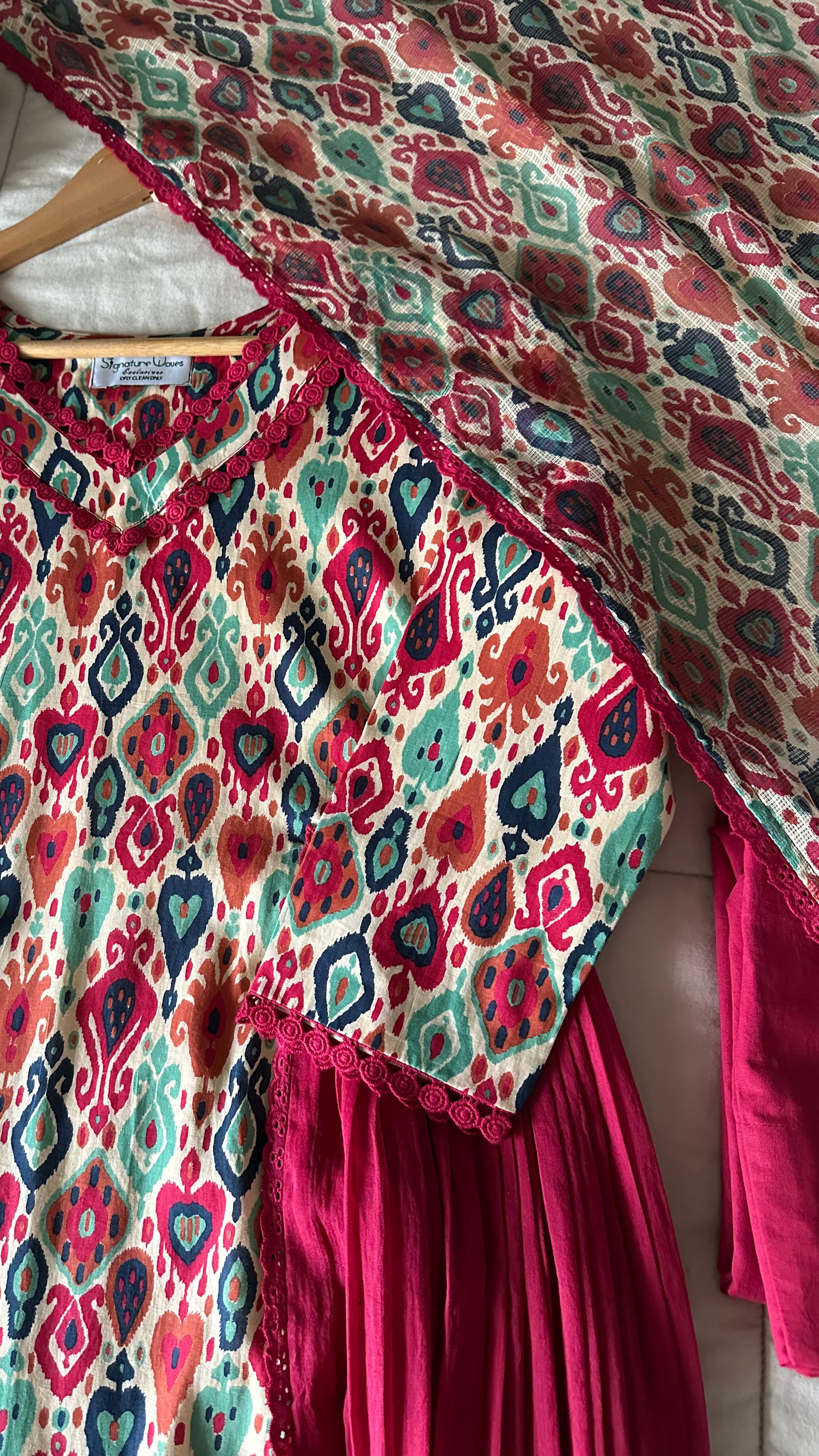 We set this suit with lace detailing on neck , sleeves and dupatta. Its soft fabric gives this one an elegant and luxurious aesthetic. Make it yours today!