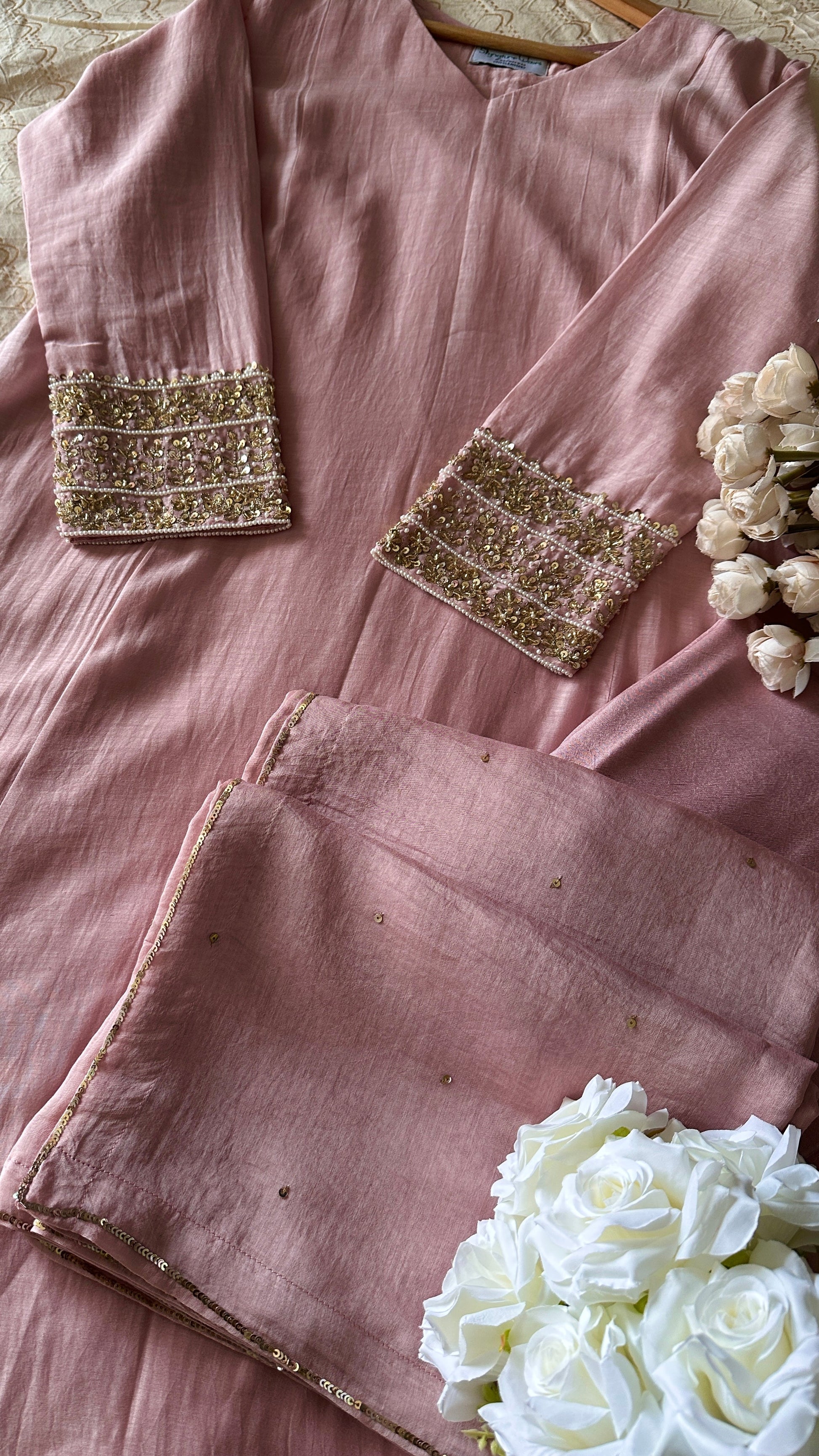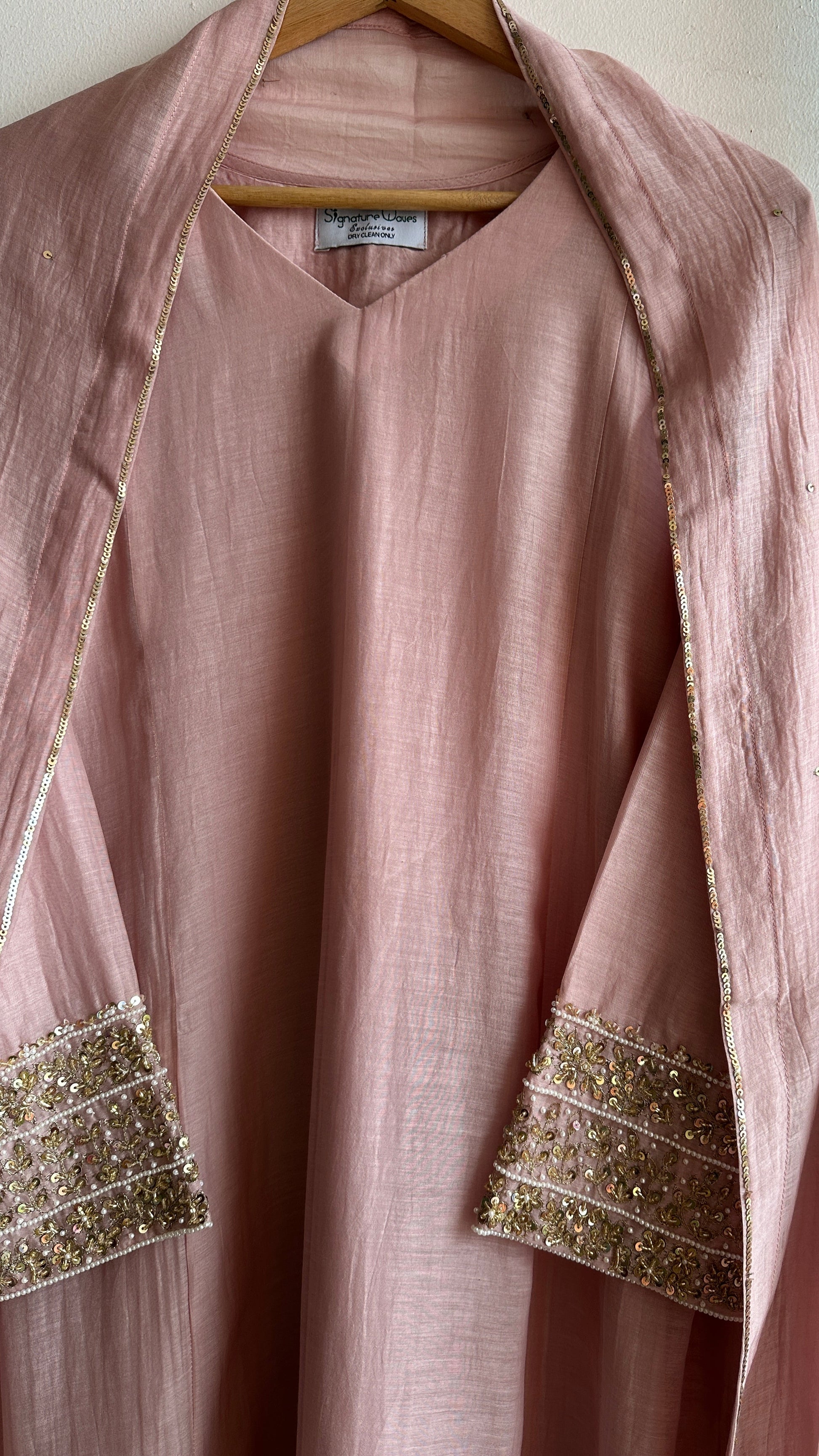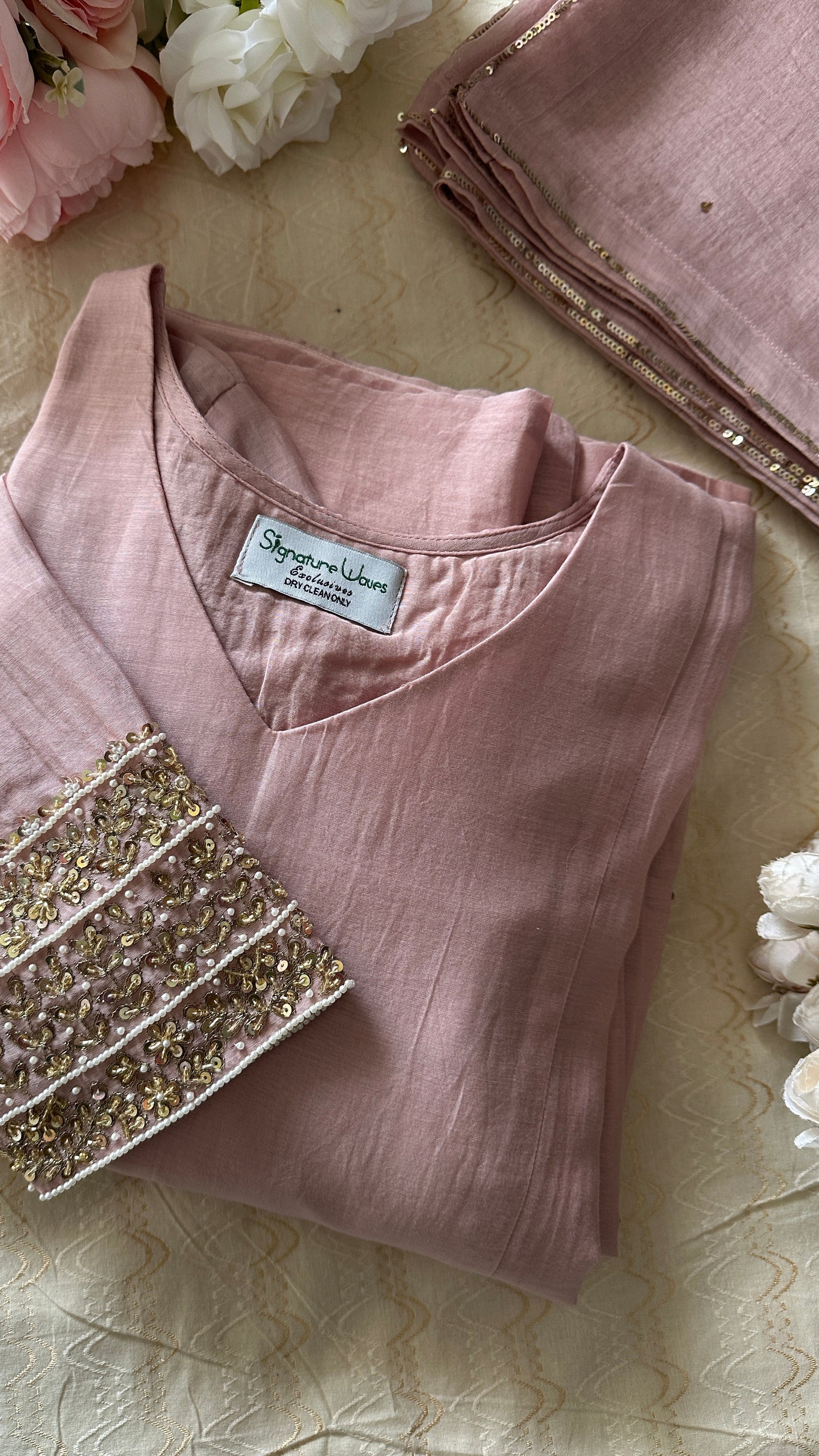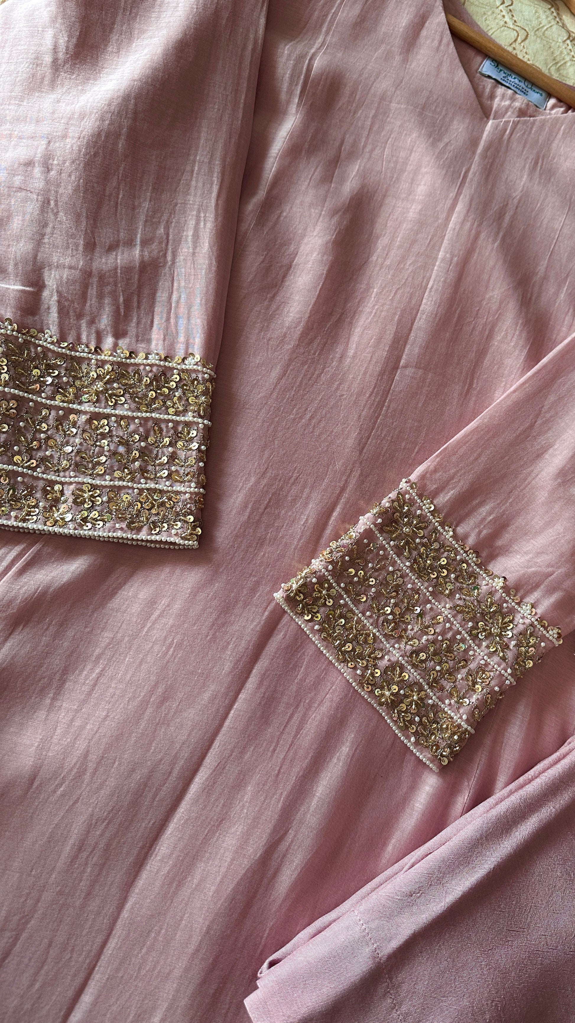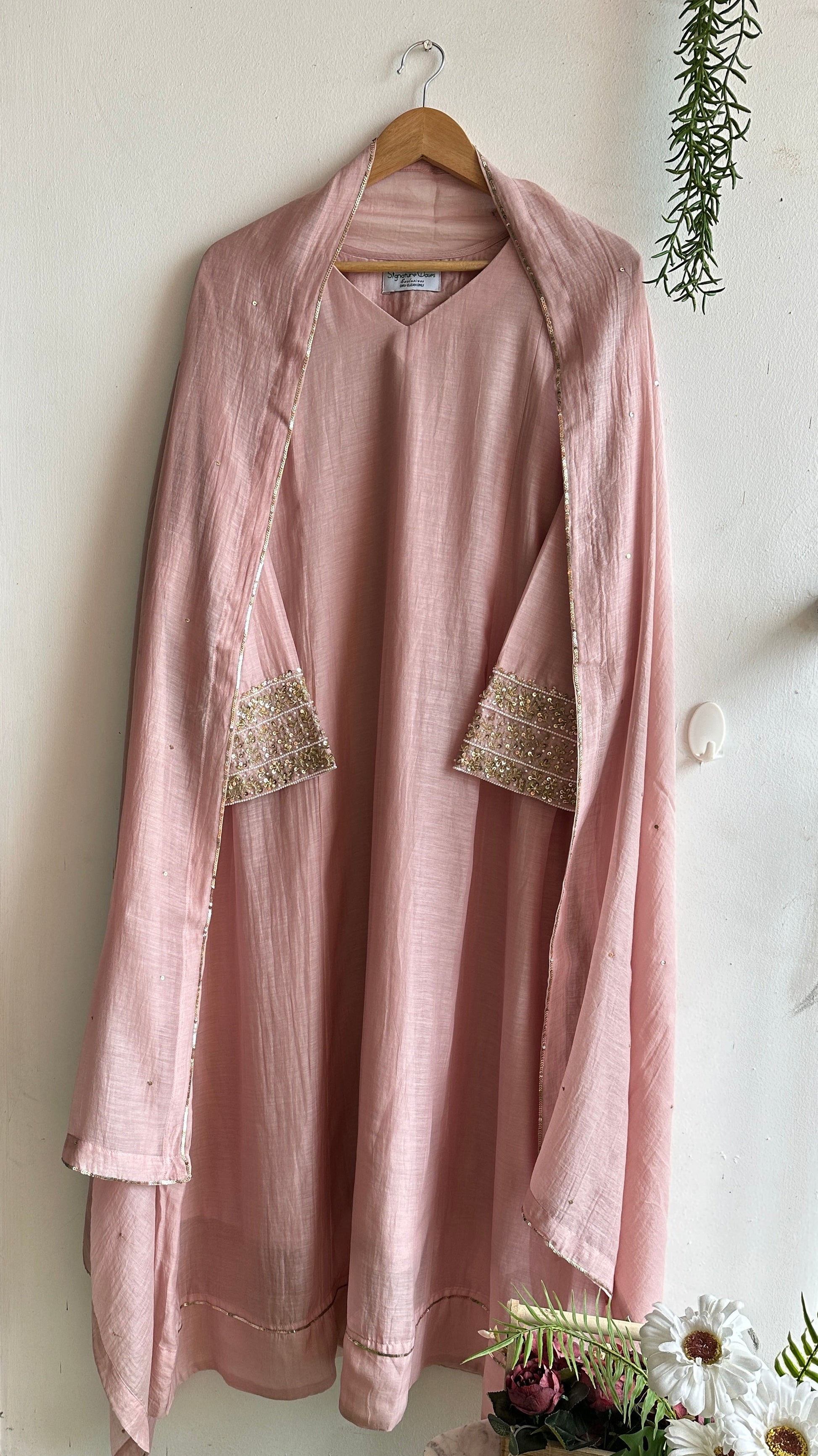 Crafted in pure Chanderi, this three-panel kurta set is a soft dream in motion. A refined pastel rose tone sets the mood, while the sleeves gleam with hand-embroidered sequin and bead detailing — adding just the right touch of festive shimmer. The hemline carries a delicate trail of sequins, continuing the understated elegance.