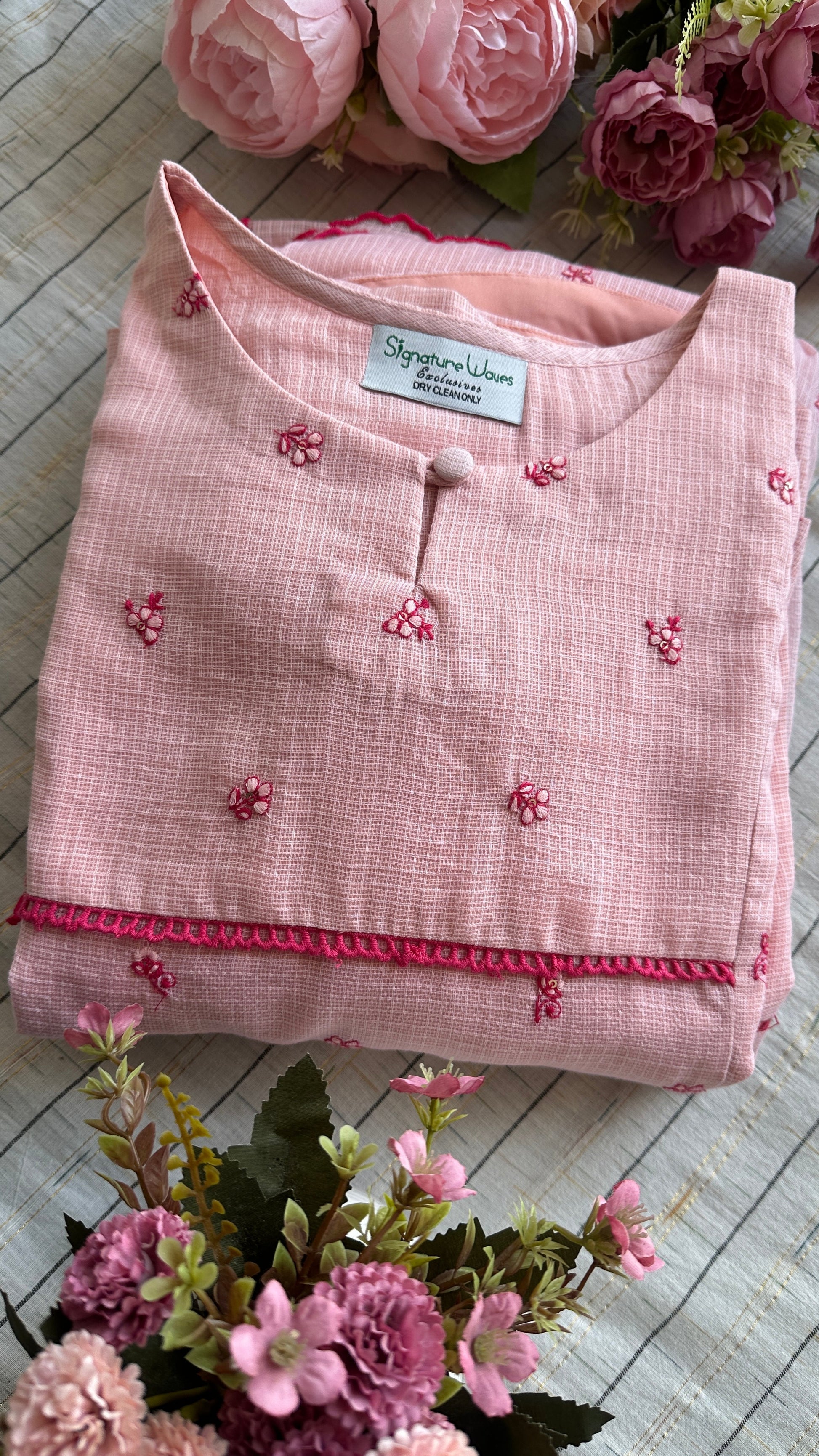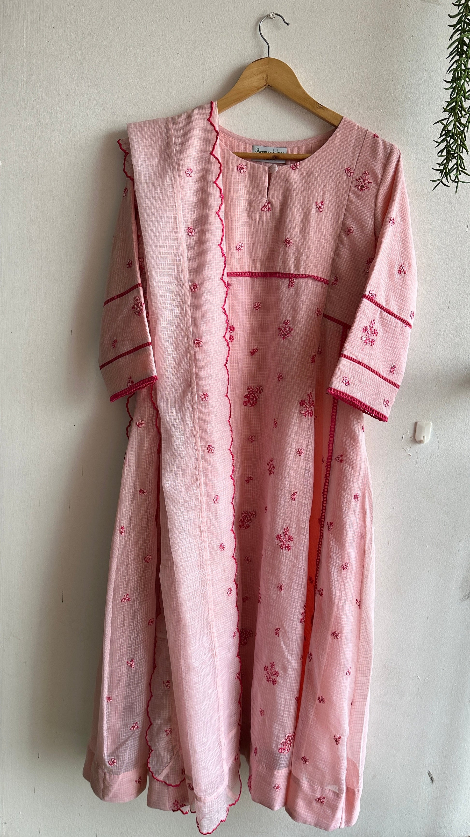 This one is crafted in cotton Kotta fabric, making it light, airy, and perfect for everyday comfort. It’s a 3-piece suit set—paired with breathable cotton pants and a Kotta dupatta highlighted with floral borders and scalloped edges in a deeper shade for that extra charm.