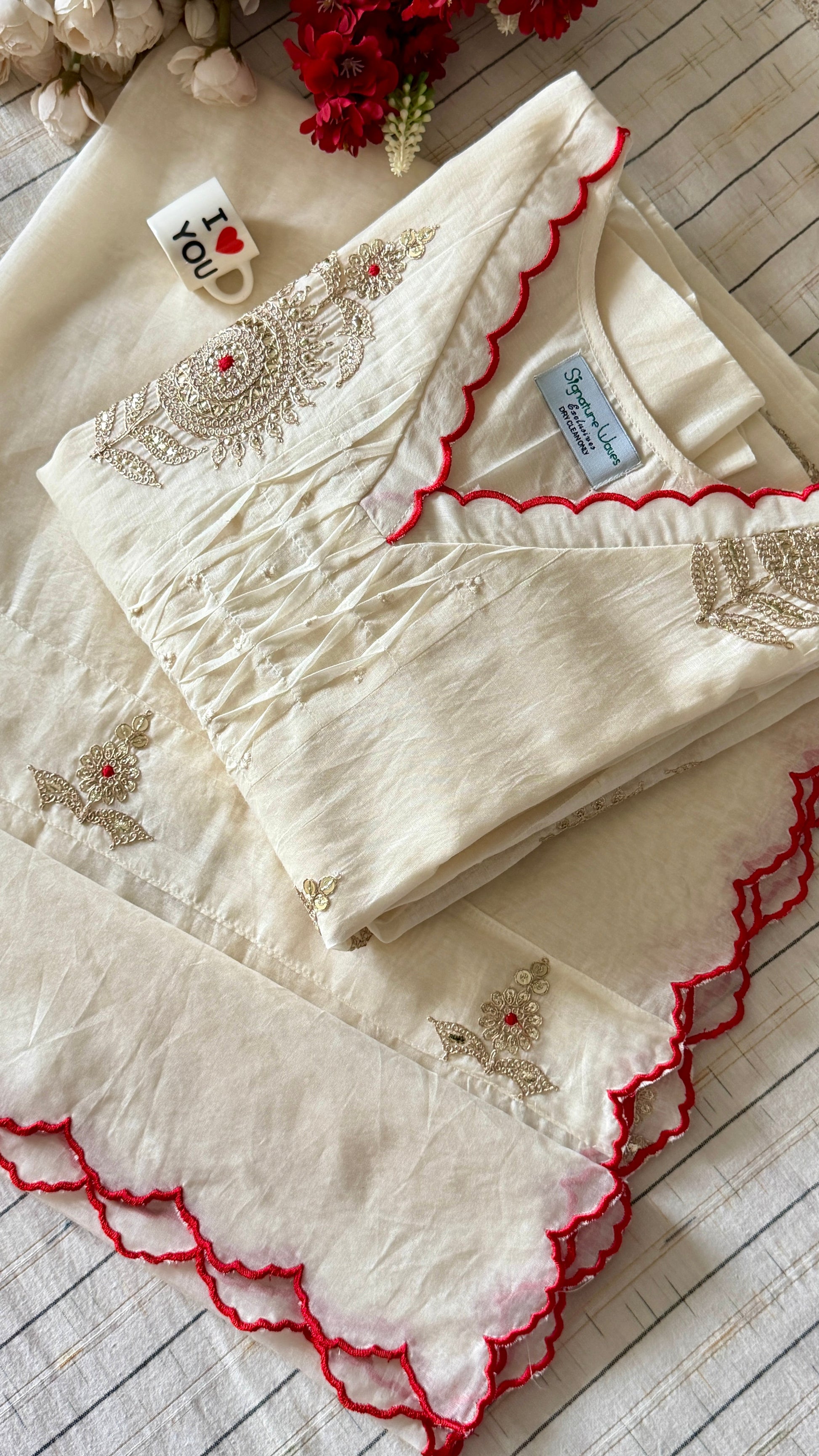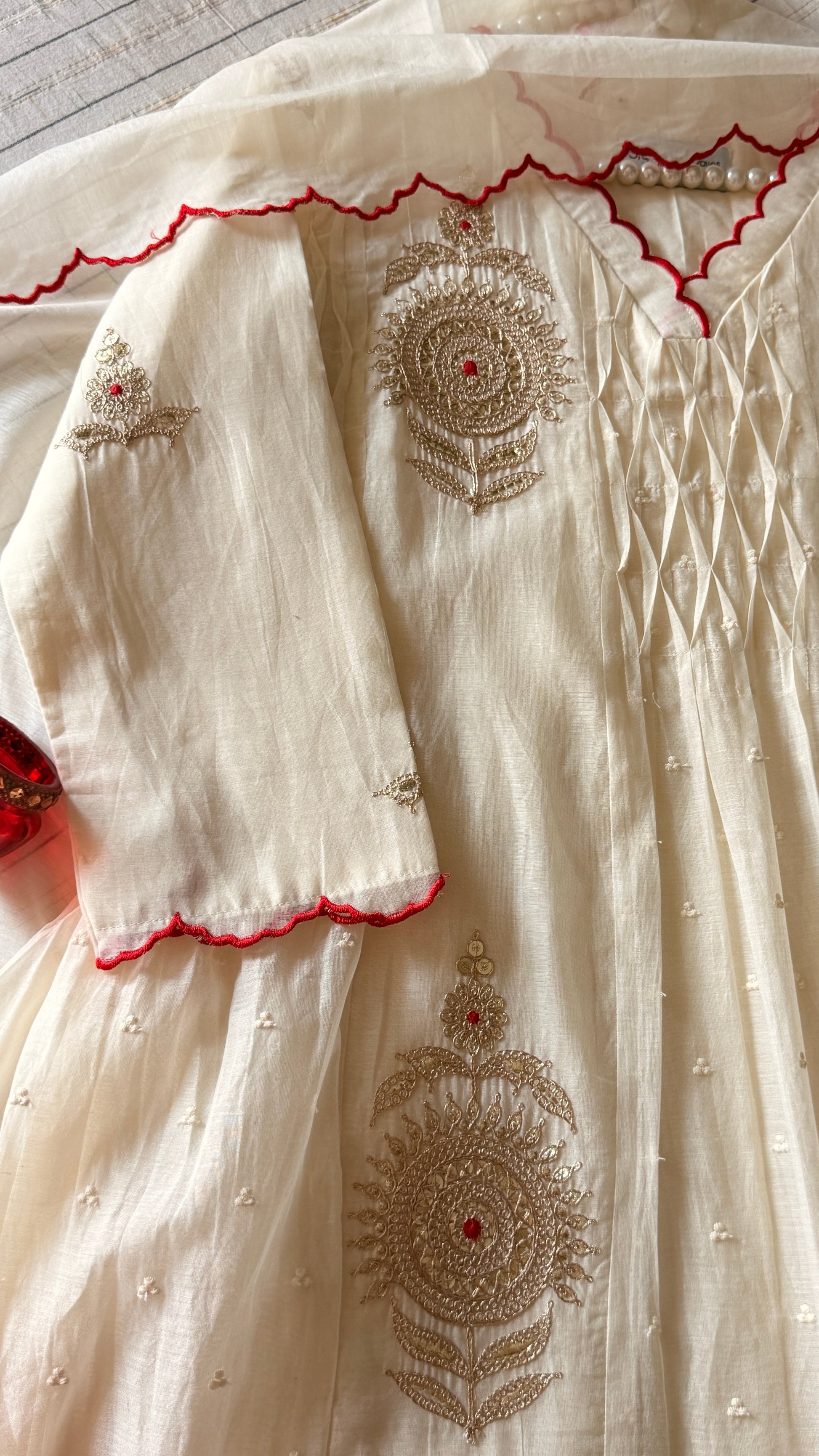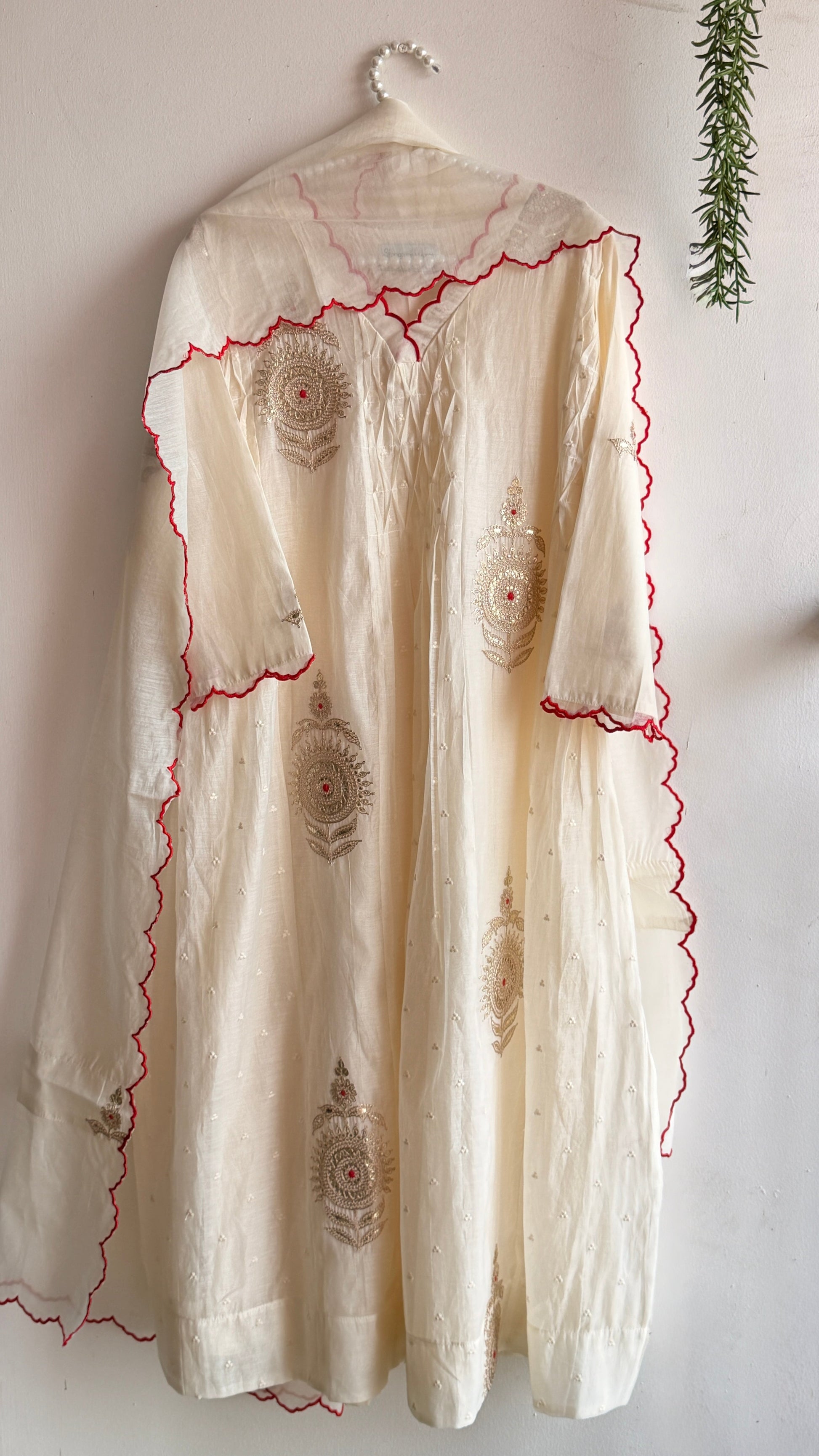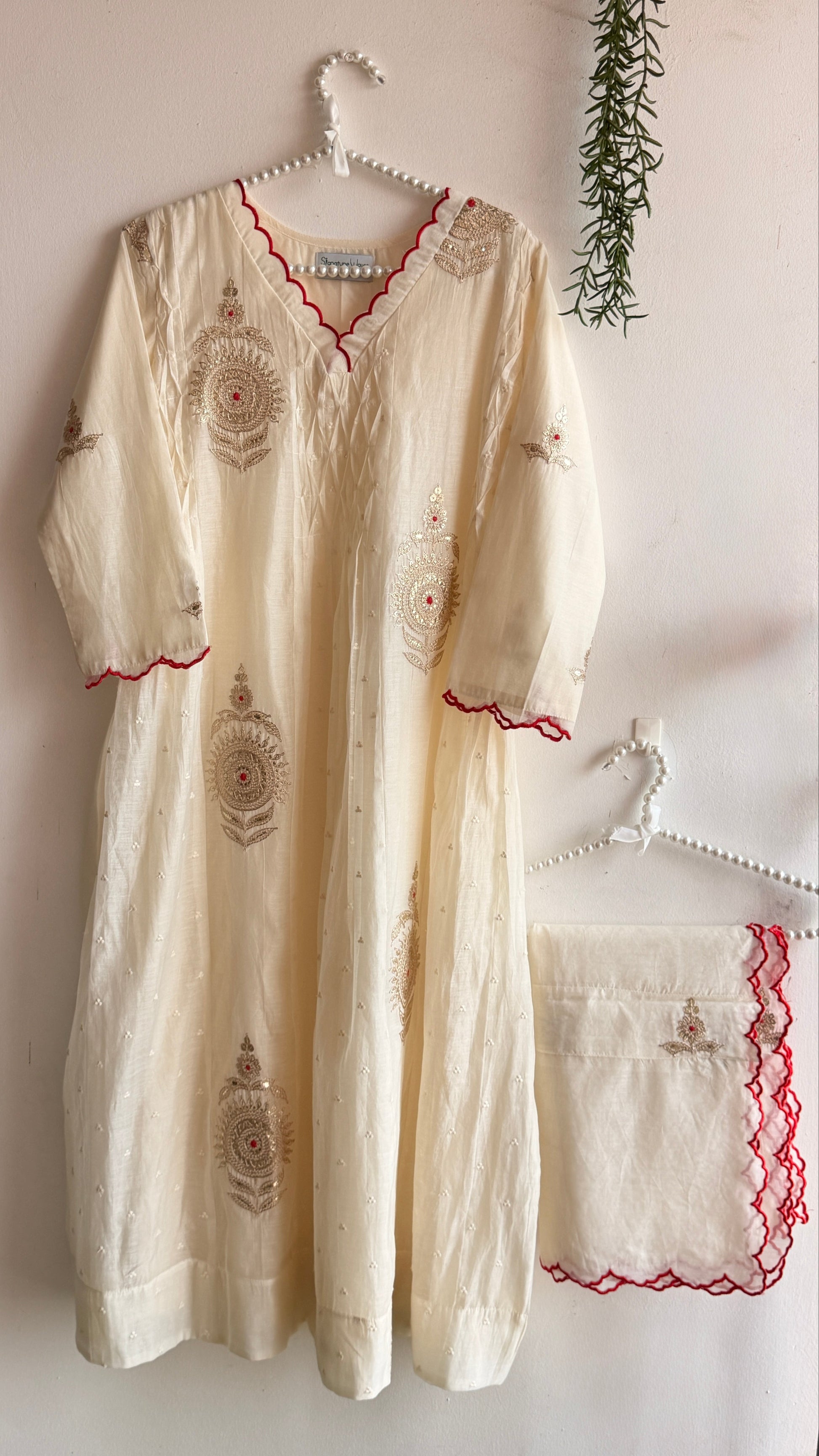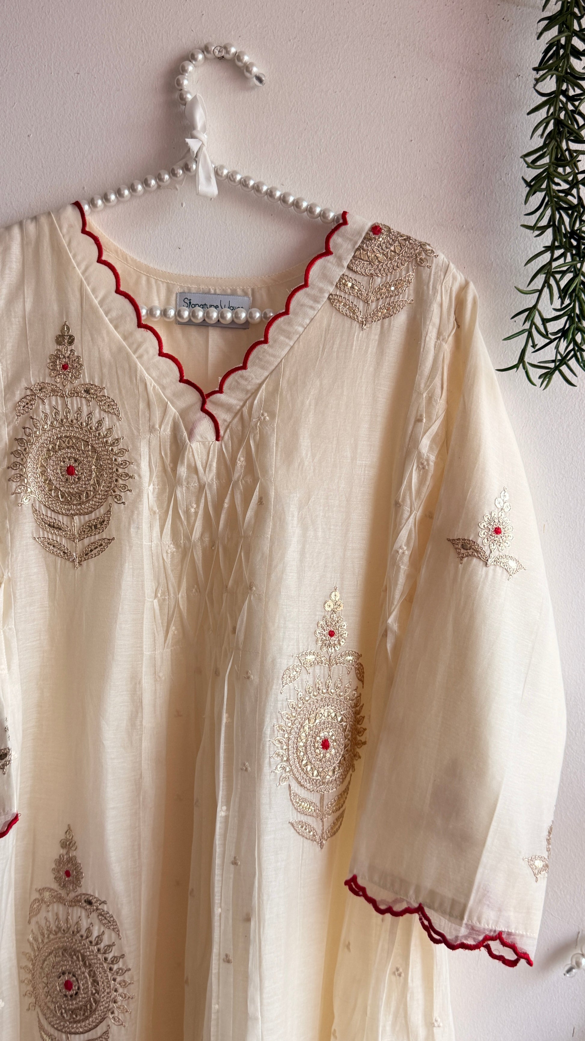 It’s a 3 piece suit set done in mul Chanderi fabric and beautifully done scallop edges on neckline , sleeves and dupatta. Paired with a cotton pants .