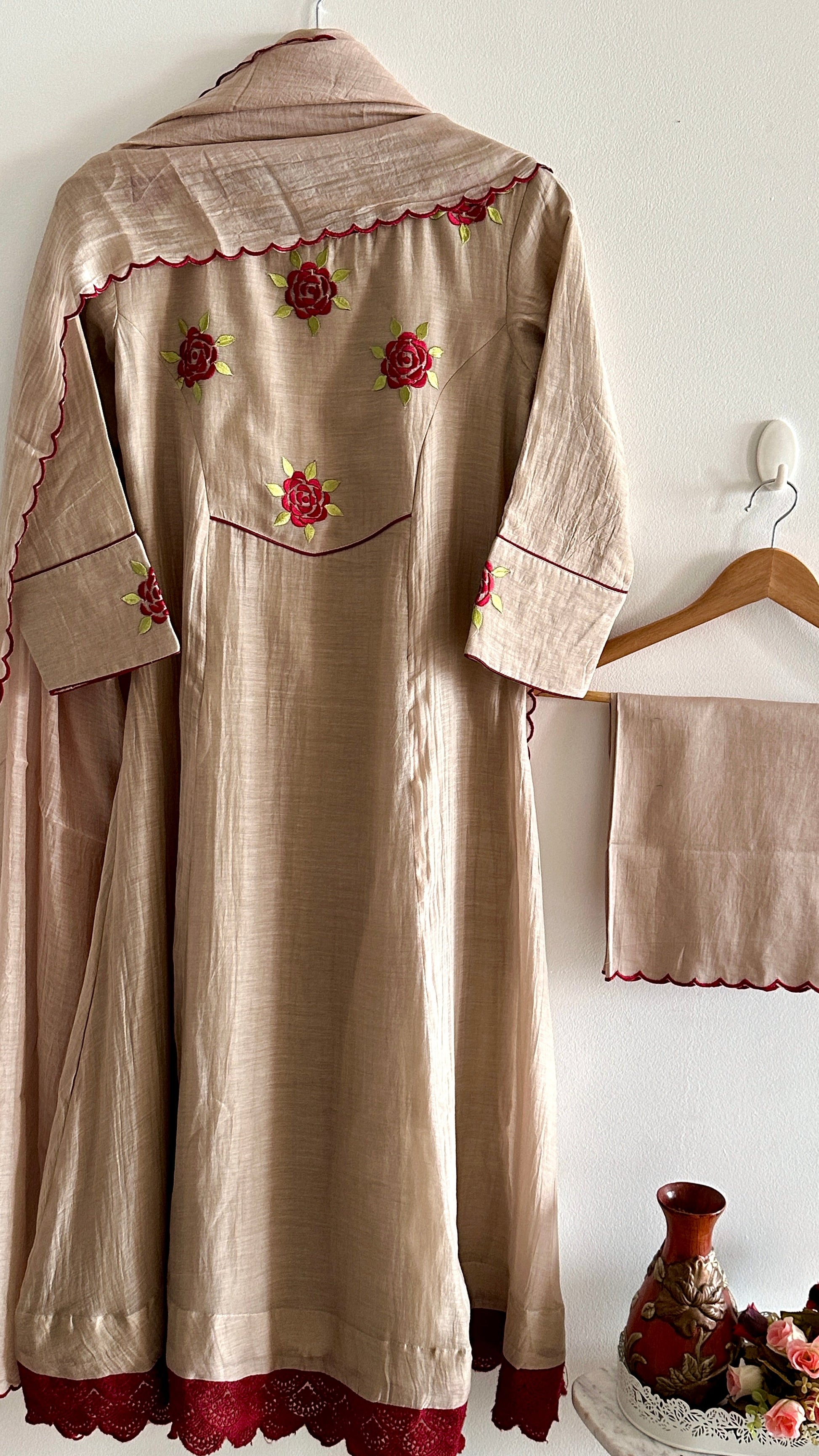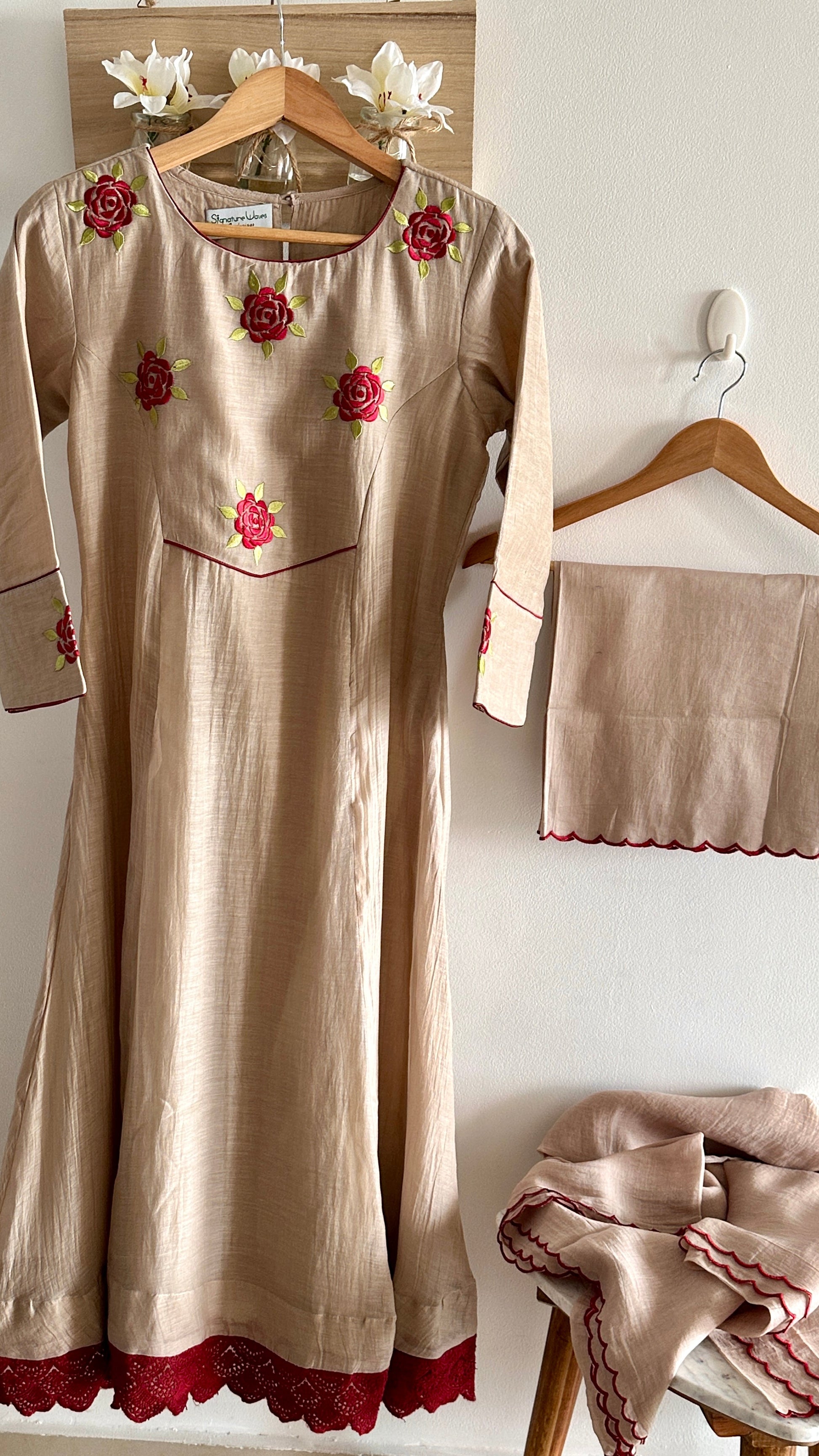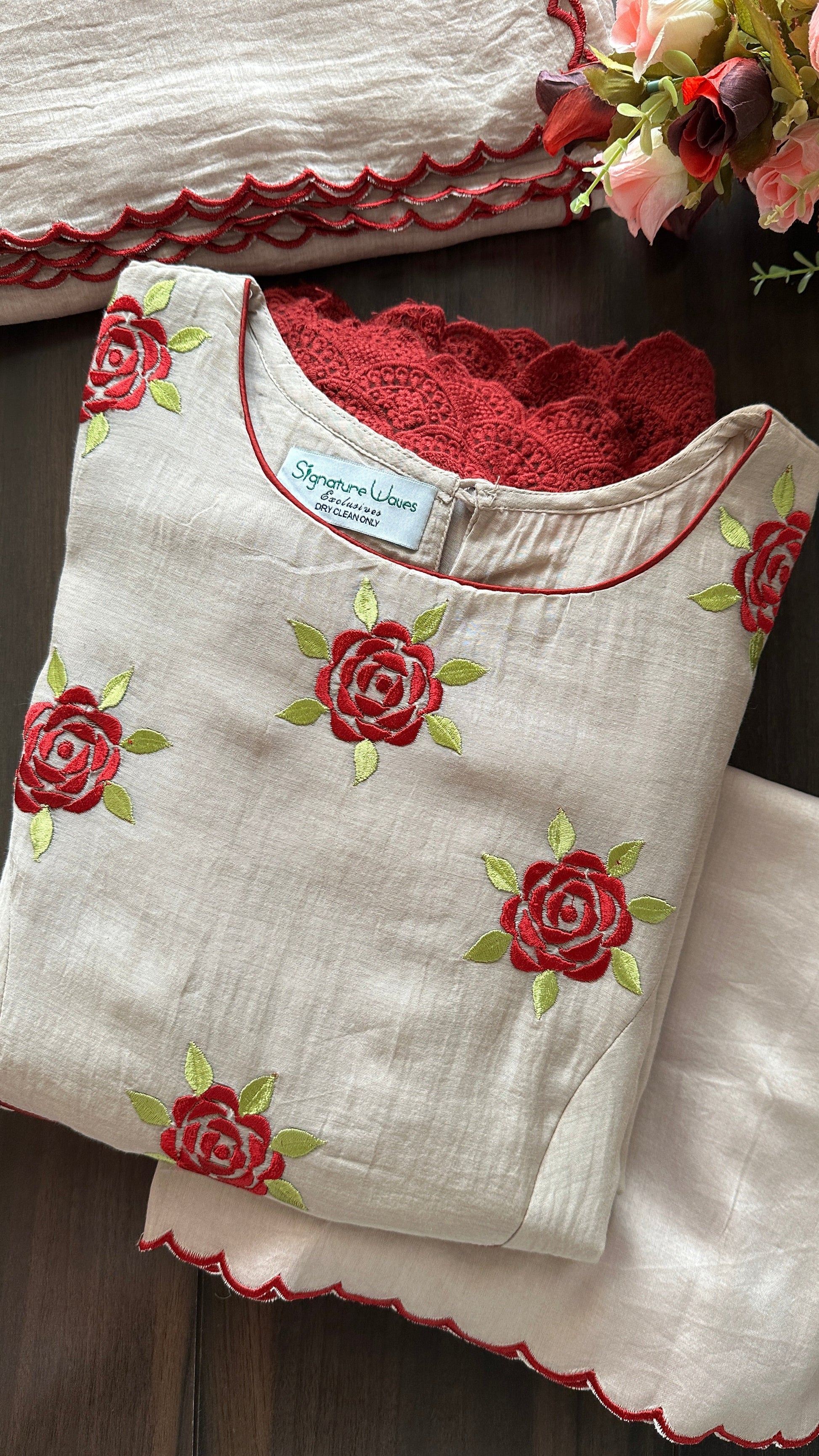 This beige and deep maroon combination is all about stole my heart. Done in Chanderi fabric for its airy, lightweight feel, this three-piece suit set effortlessly blends comfort with style. The delicate embroidery details on the top, beautifully done sleeves, scalloped edges on the cotton pants, and the elegant Chanderi dupatta with scalloped borders complete the look.