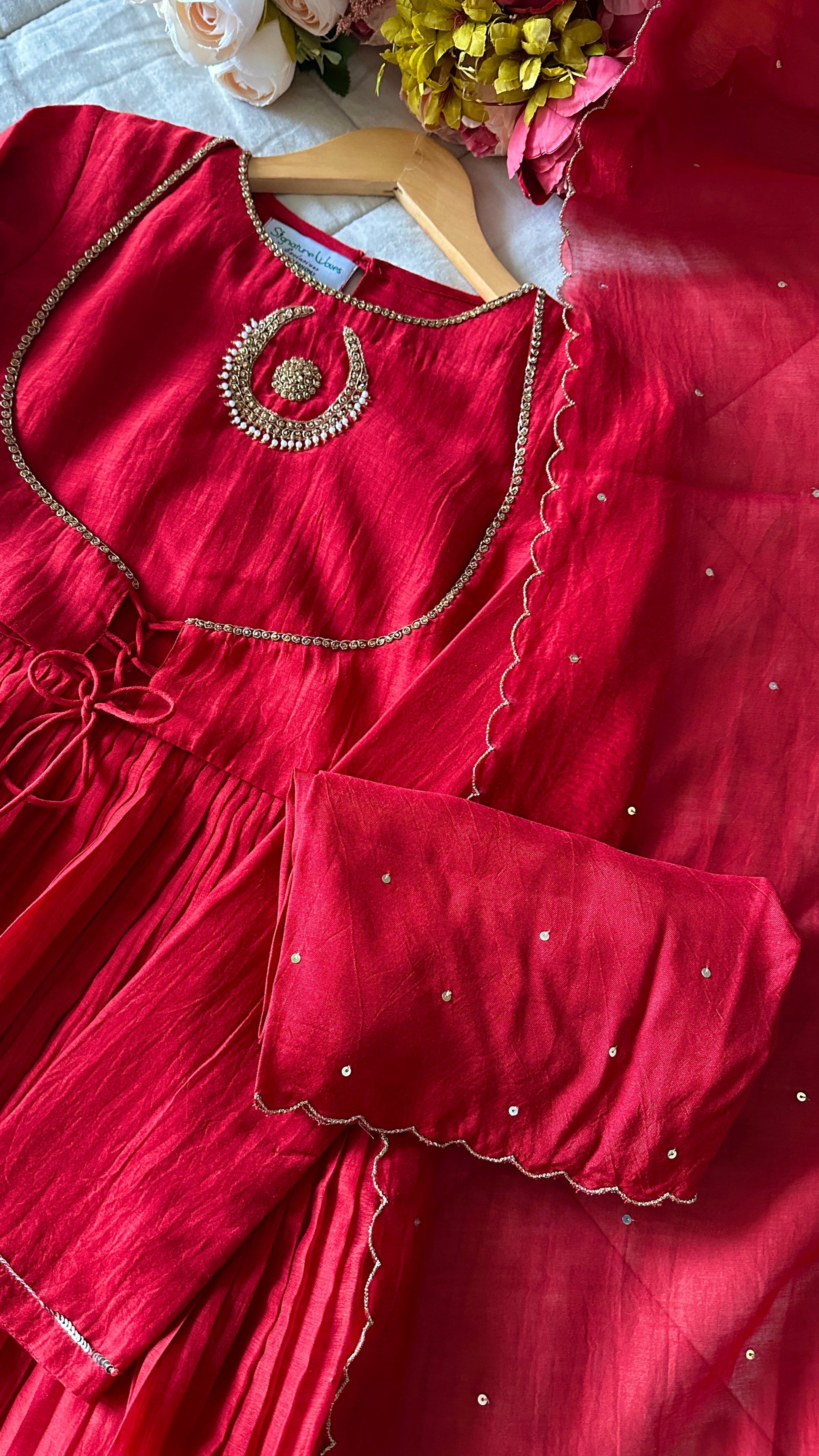 Loved the deep red colour from and the beautiful jacket type pattern, the combination of red and antique gold colour hand work is a great addition to the collection of vintage party wear. Like most of our attires this one also is not season specific. This set is done in mul Chanderi, it’s fully lined and dupatta has been embellished with sequins spreadings and hand work scallop borders, while the pants having the same detailing of sequins and scallop edges.
