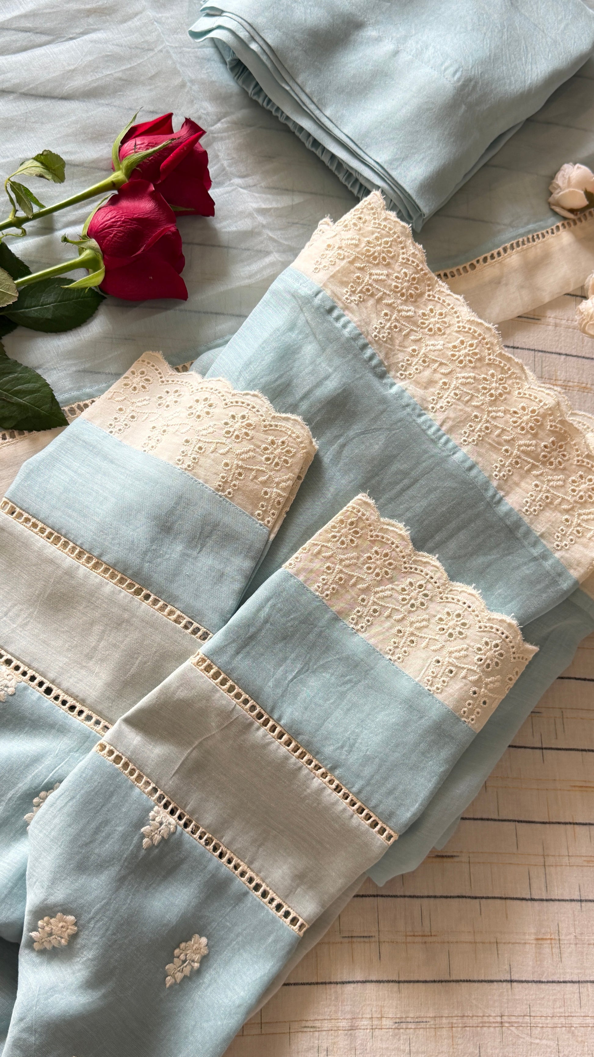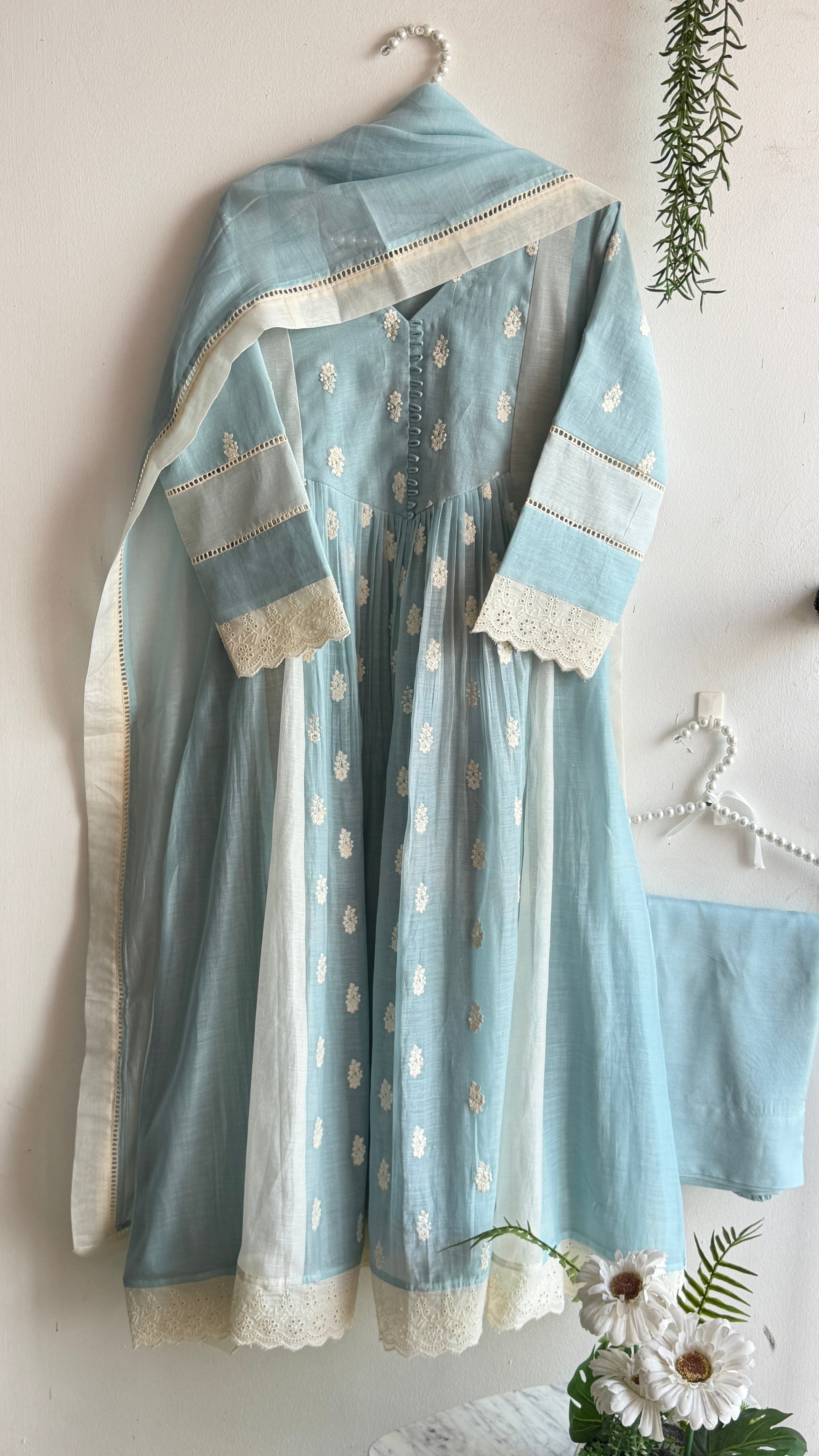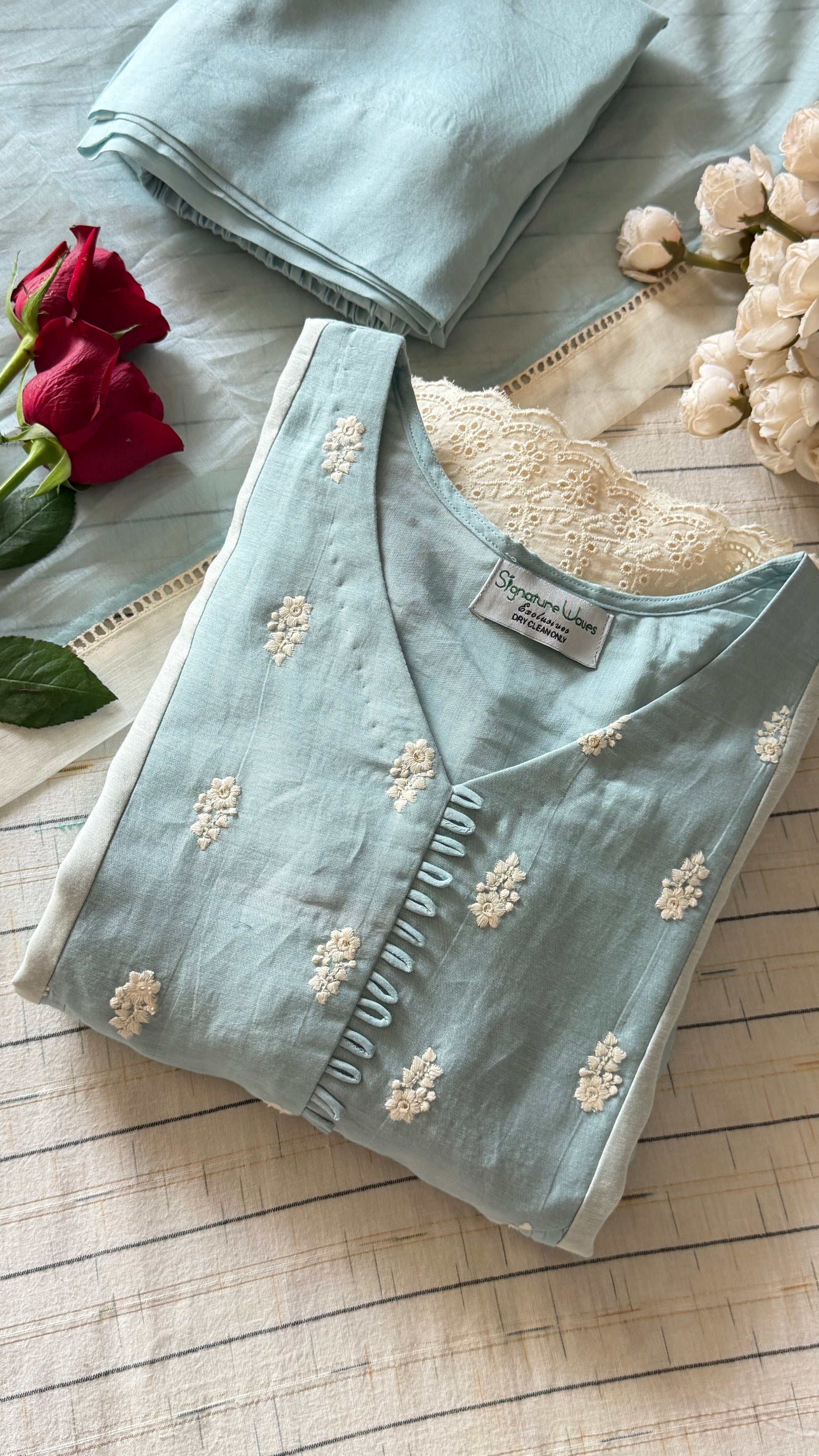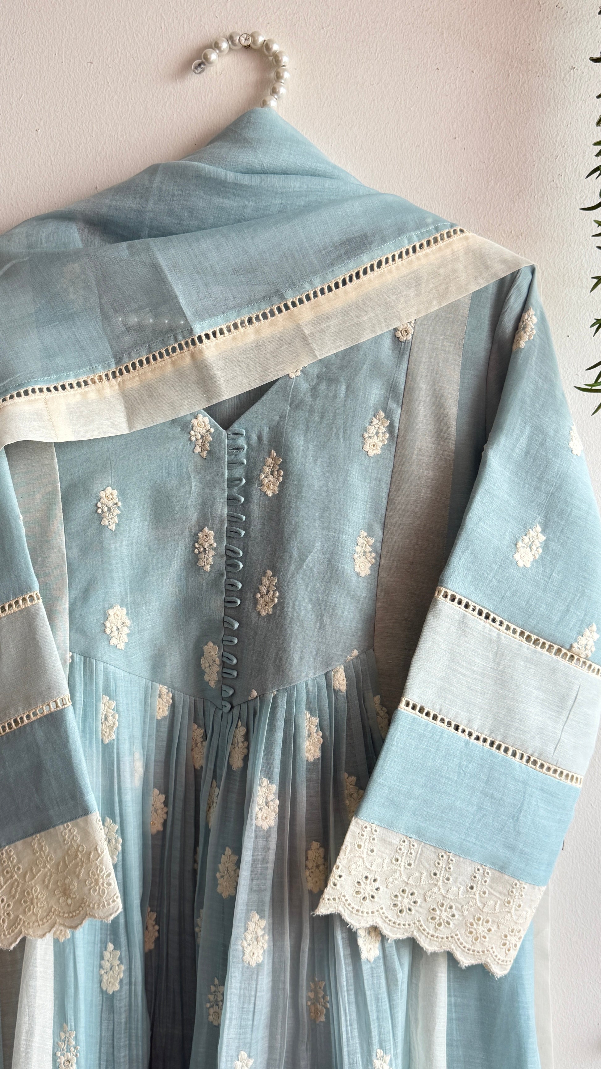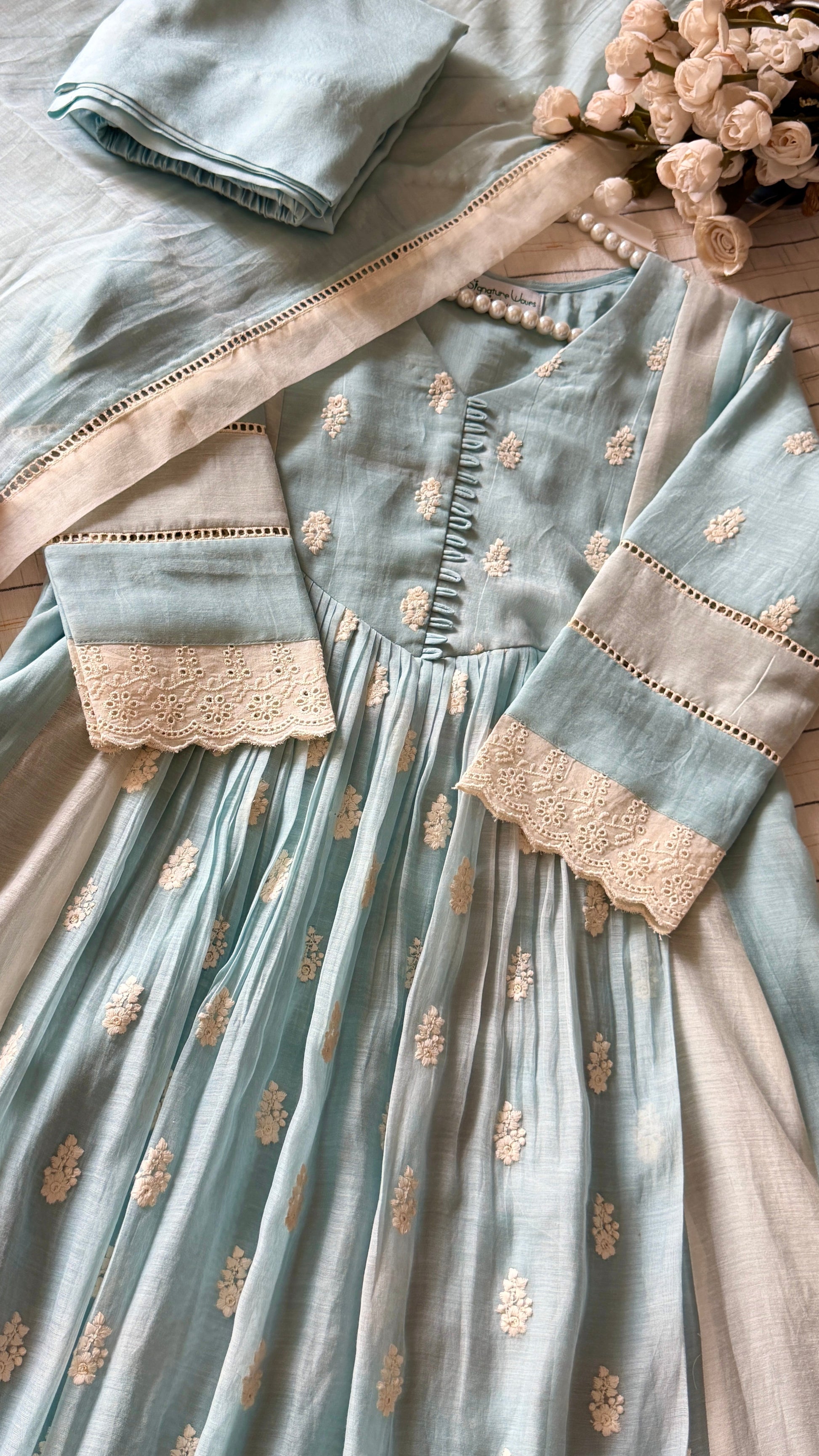 Here’s to blending heritage and modernity. A very classic 3 piece Chanderi suit set in a very soothing powder blue and off white combination. This colour is something that bring you so much calm and the same time it’s looks classy.The set carries delicate Hacoba detailing on the flair and sleeves, adding softness and character to the entire look.