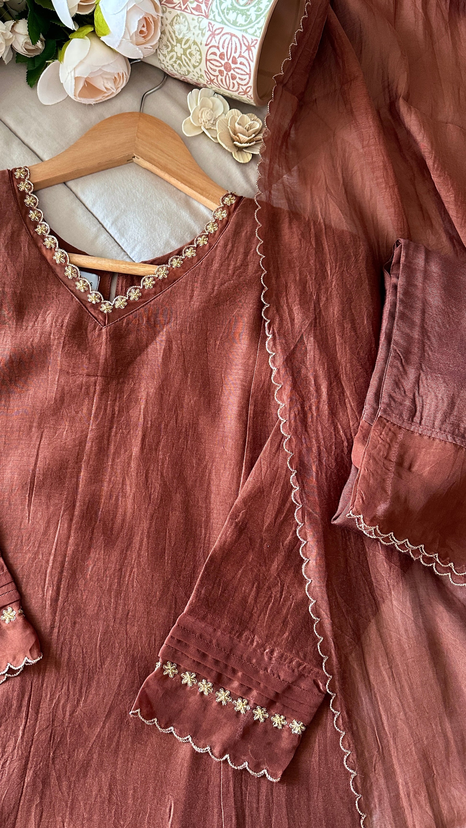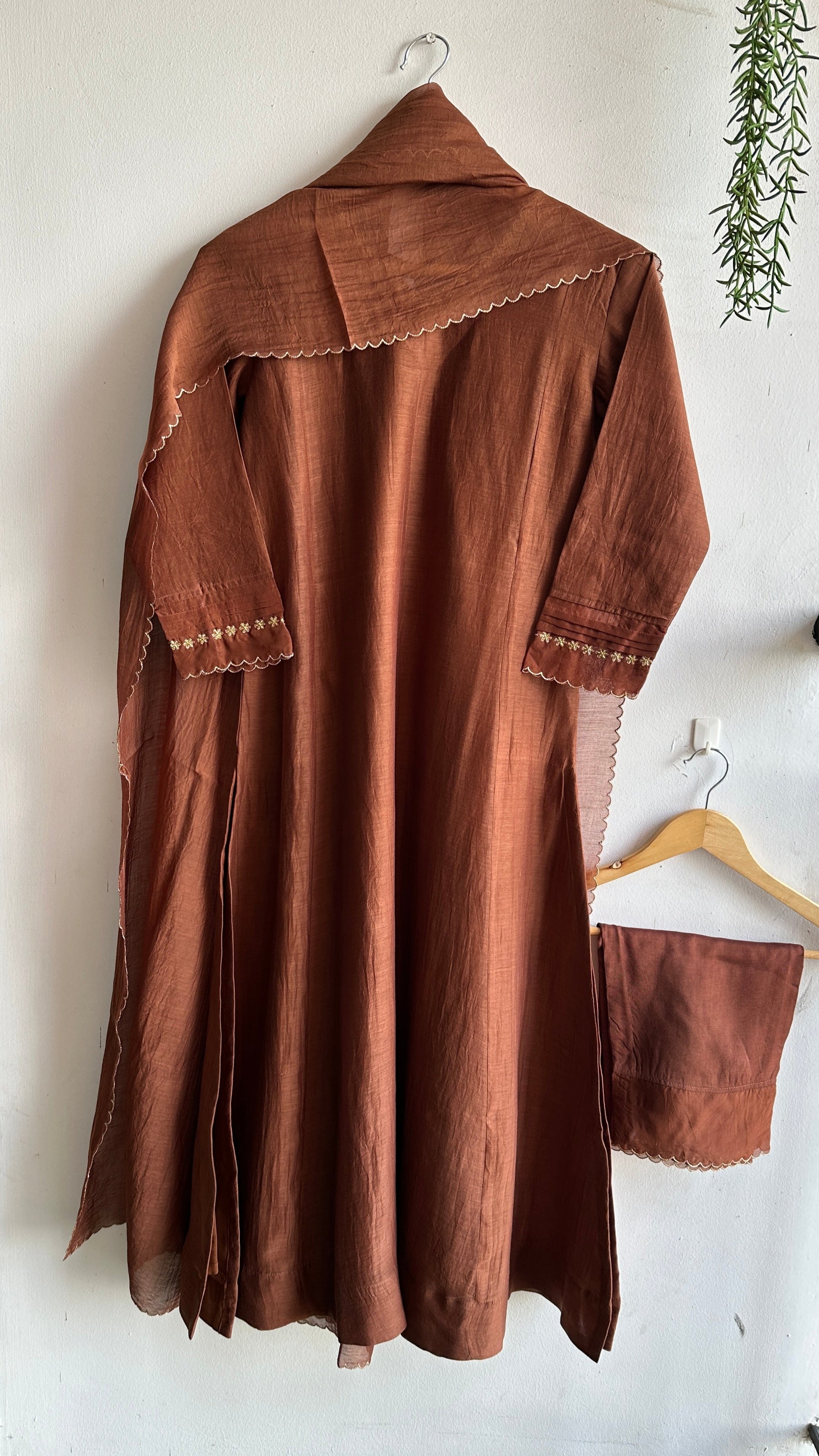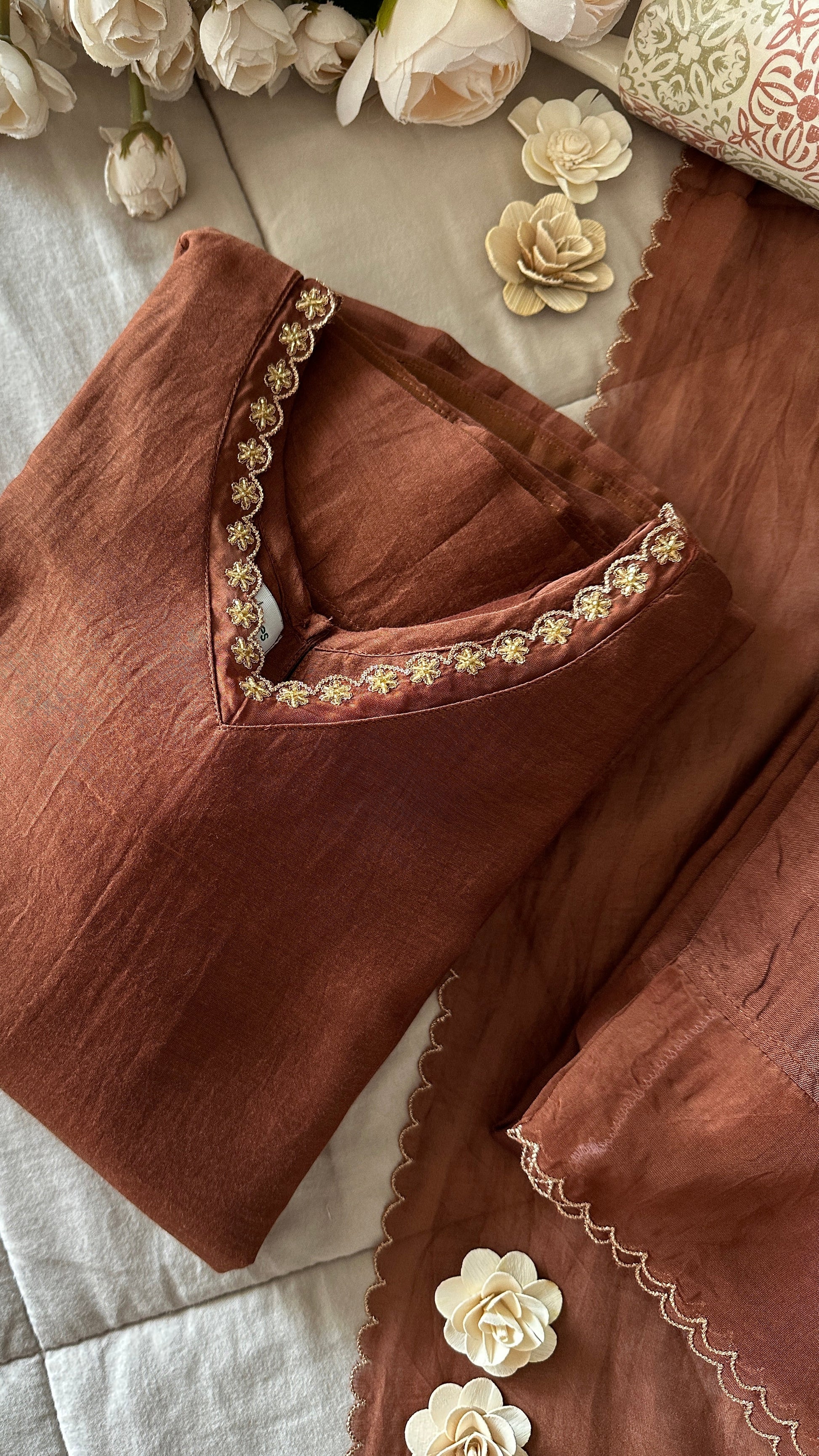 A rich brown Chanderi suit set that speaks of understated elegance.The top is adorned with intricate golden handwork on the neckline and sleeves, while the pure Chanderi dupatta, finished with delicate handwork scallops, completes the look with effortless charm.
