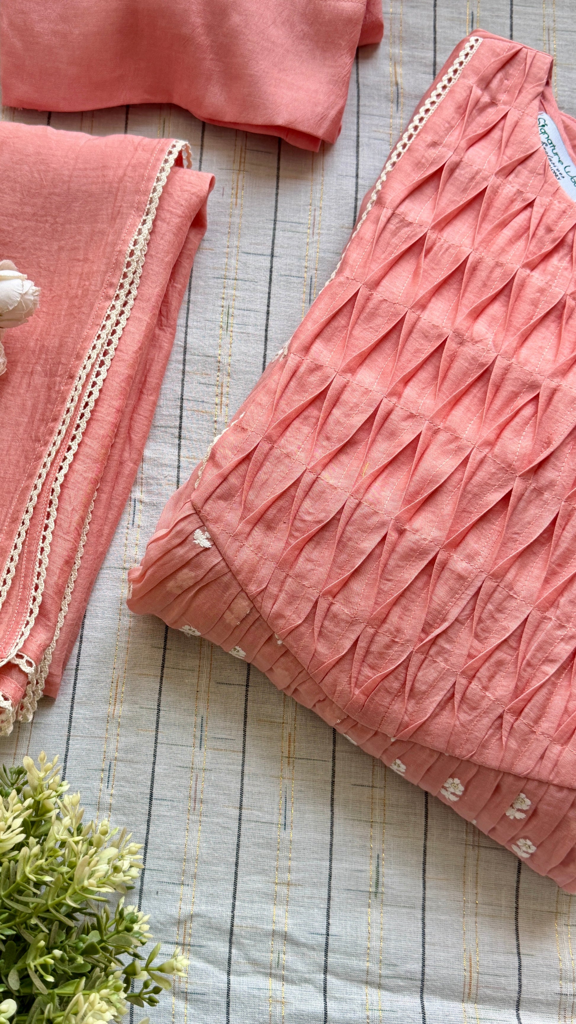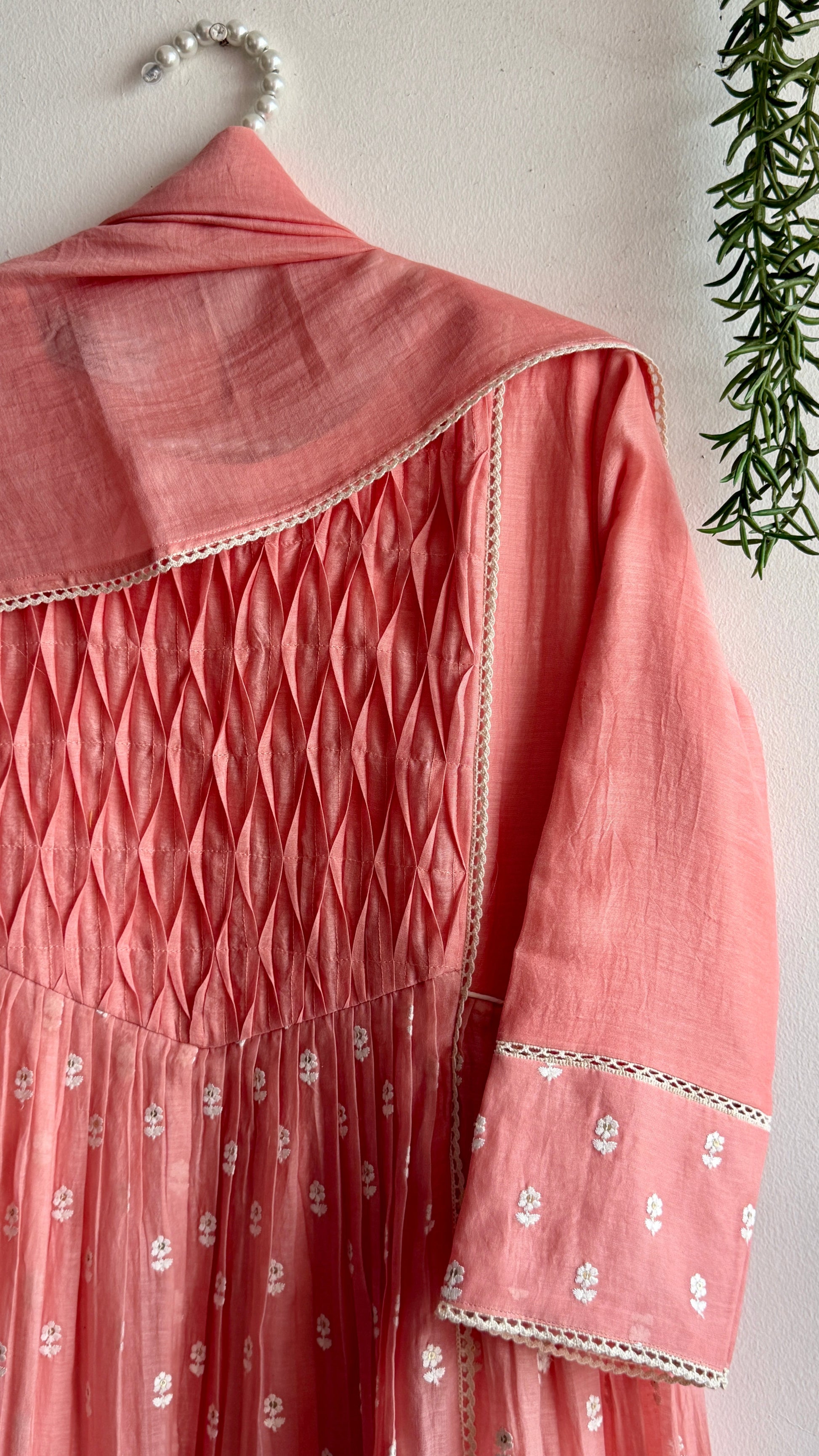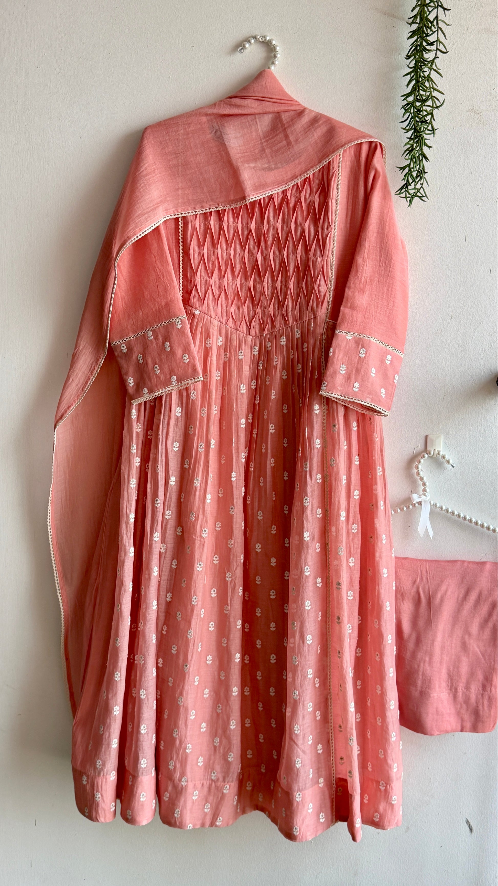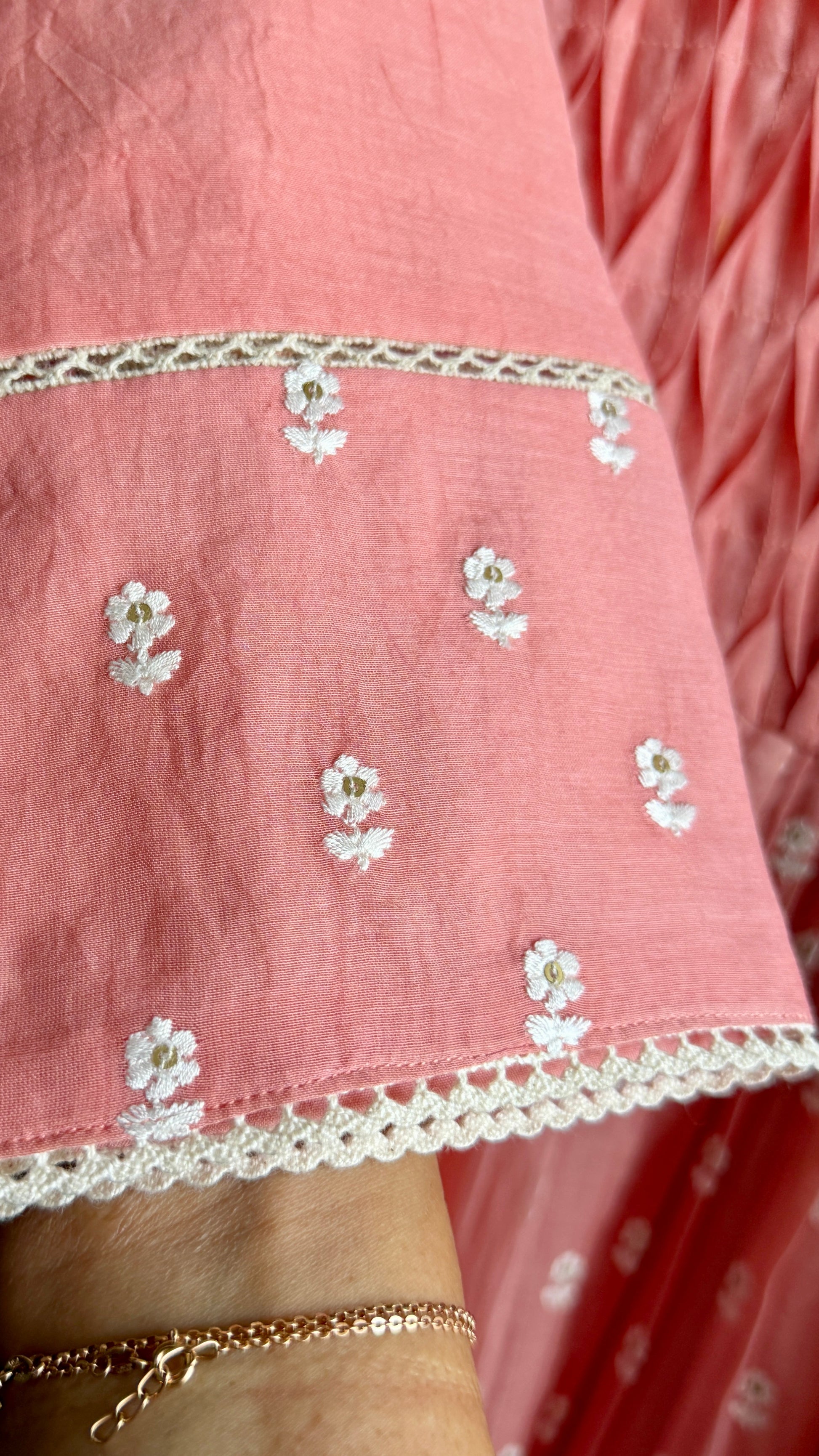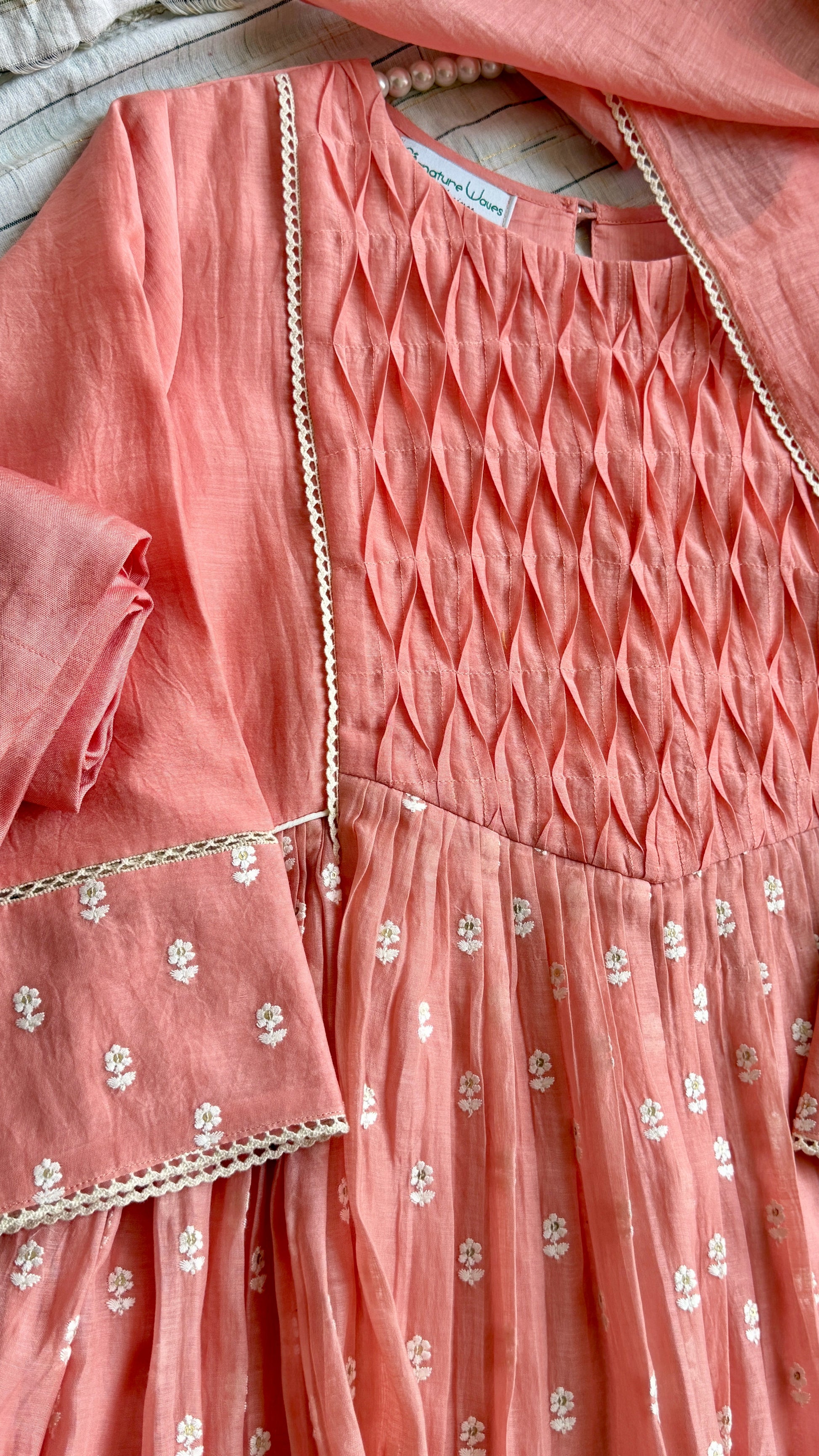 A calm peach-pink shade that looks good on every skin tone.This outfit is all about softness.A calm peach-pink shade that feels light on the skin and soothing to the eyes. The smocked yoke adds beautiful texture, while the tiny white floral embroidery gently spreads across the fabric like little blossoms.