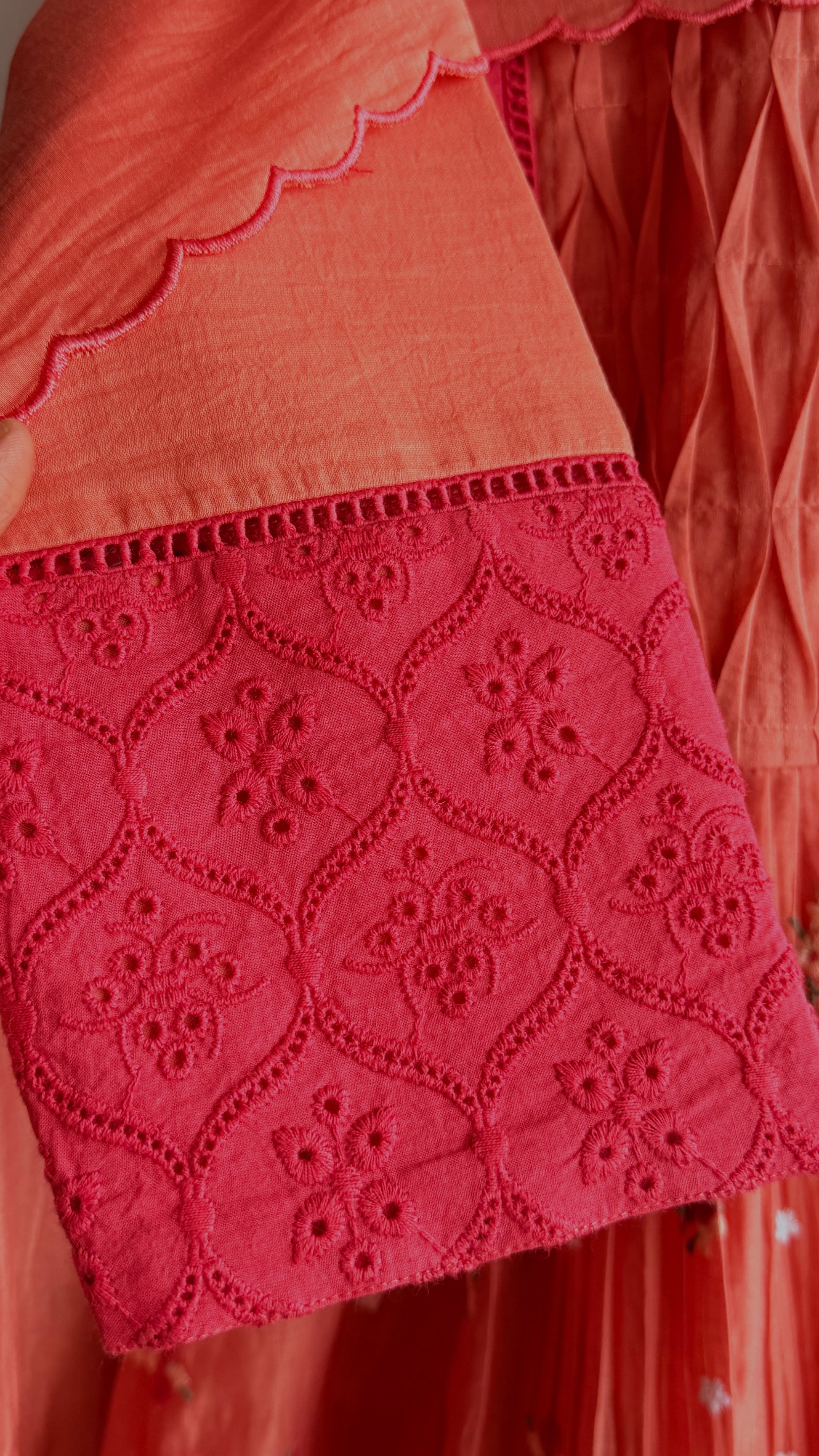 It’s a three piece Chanderi suit set in a peach and pink combination with multicoloured floral embroidery. Beautiful floral Hacoba patches are added along the side yokes and sleeve borders, enhancing the depth of the design. A scalloped Chanderi dupatta and santoon lowers with pink piping add extra beauty to the set.